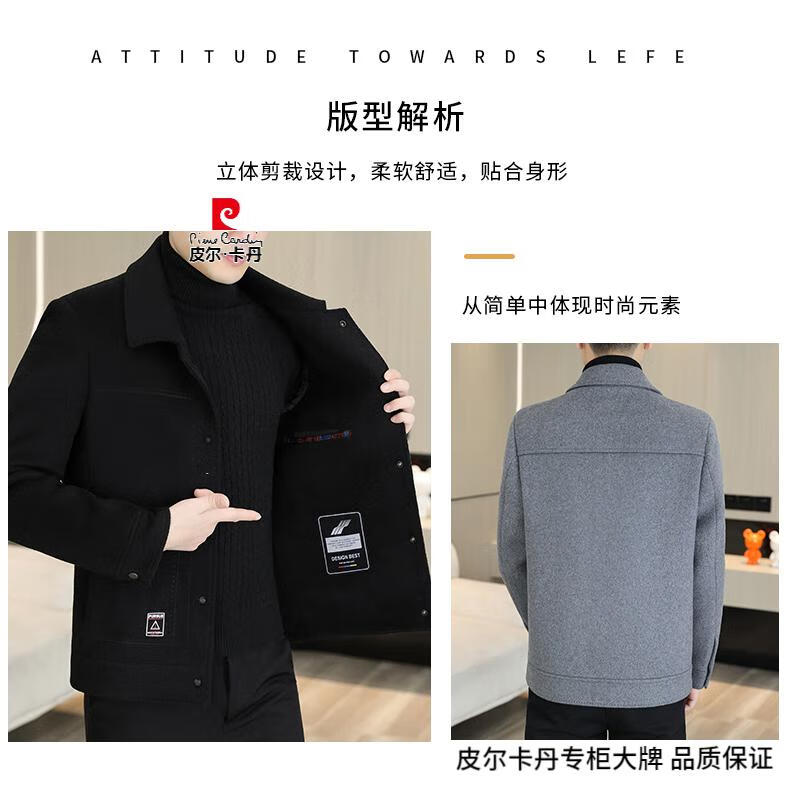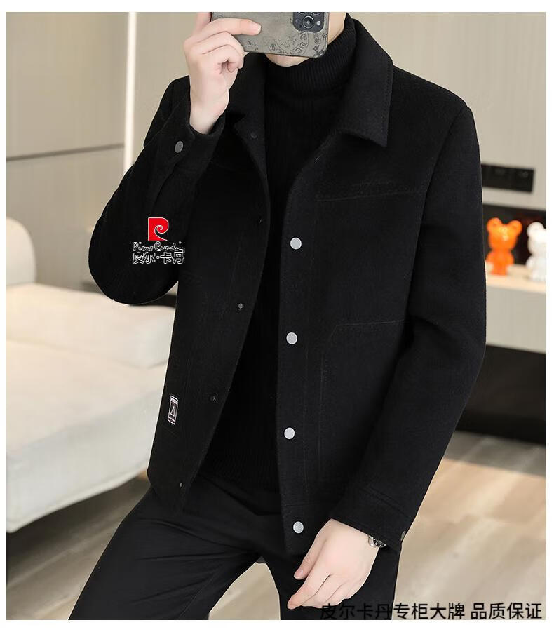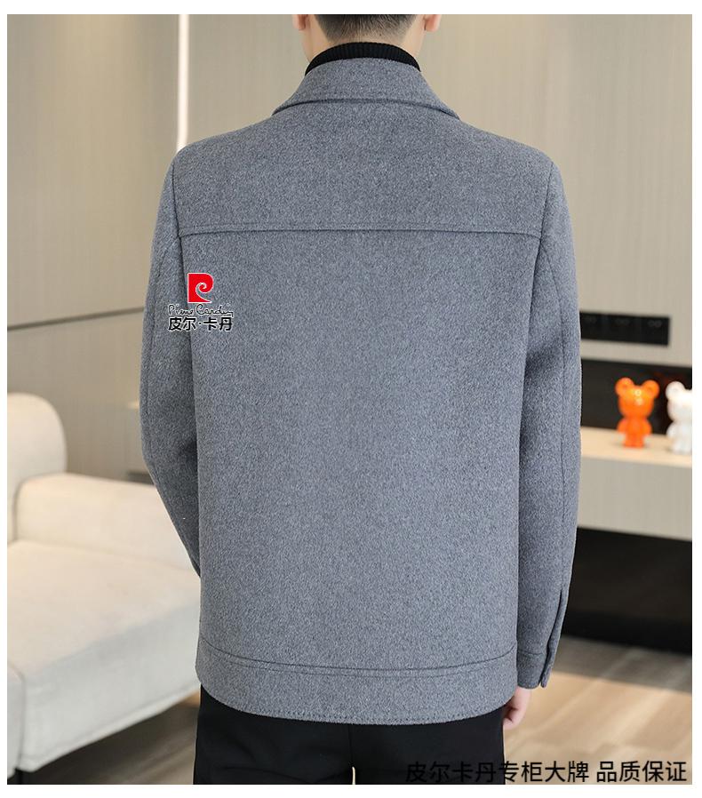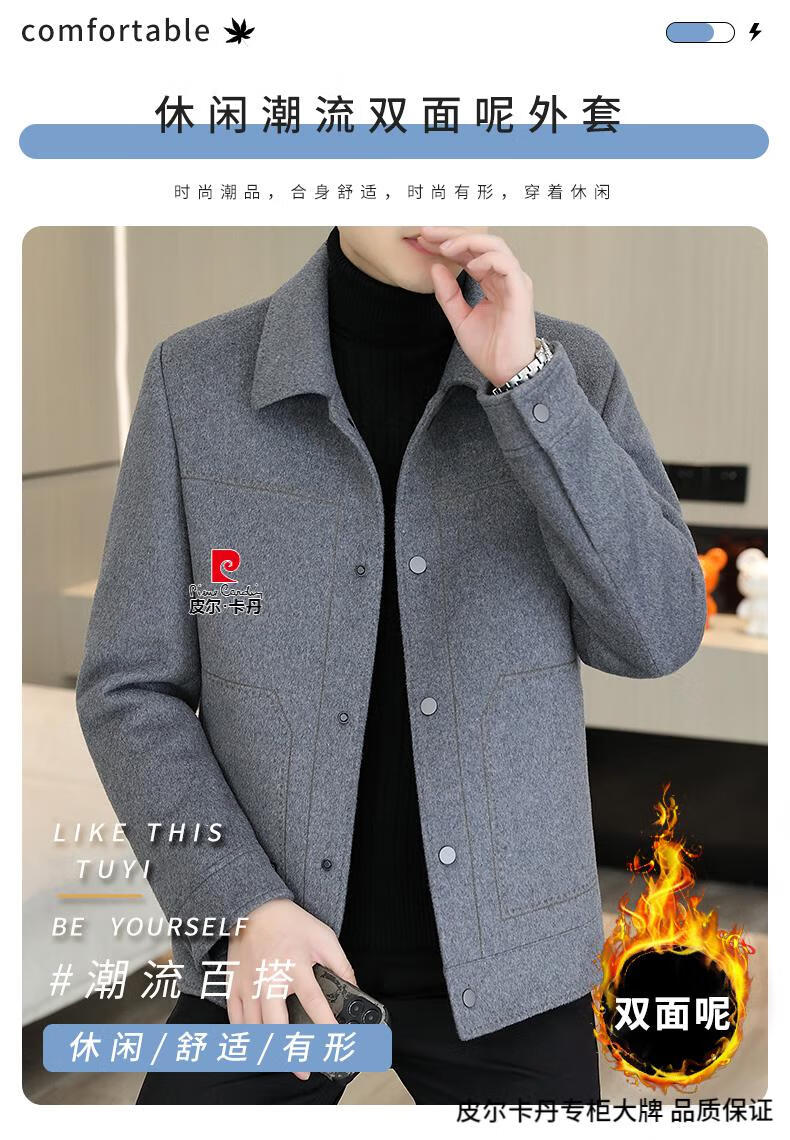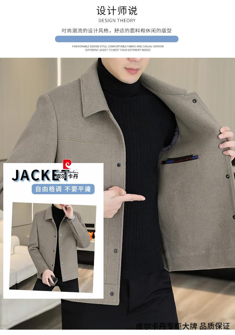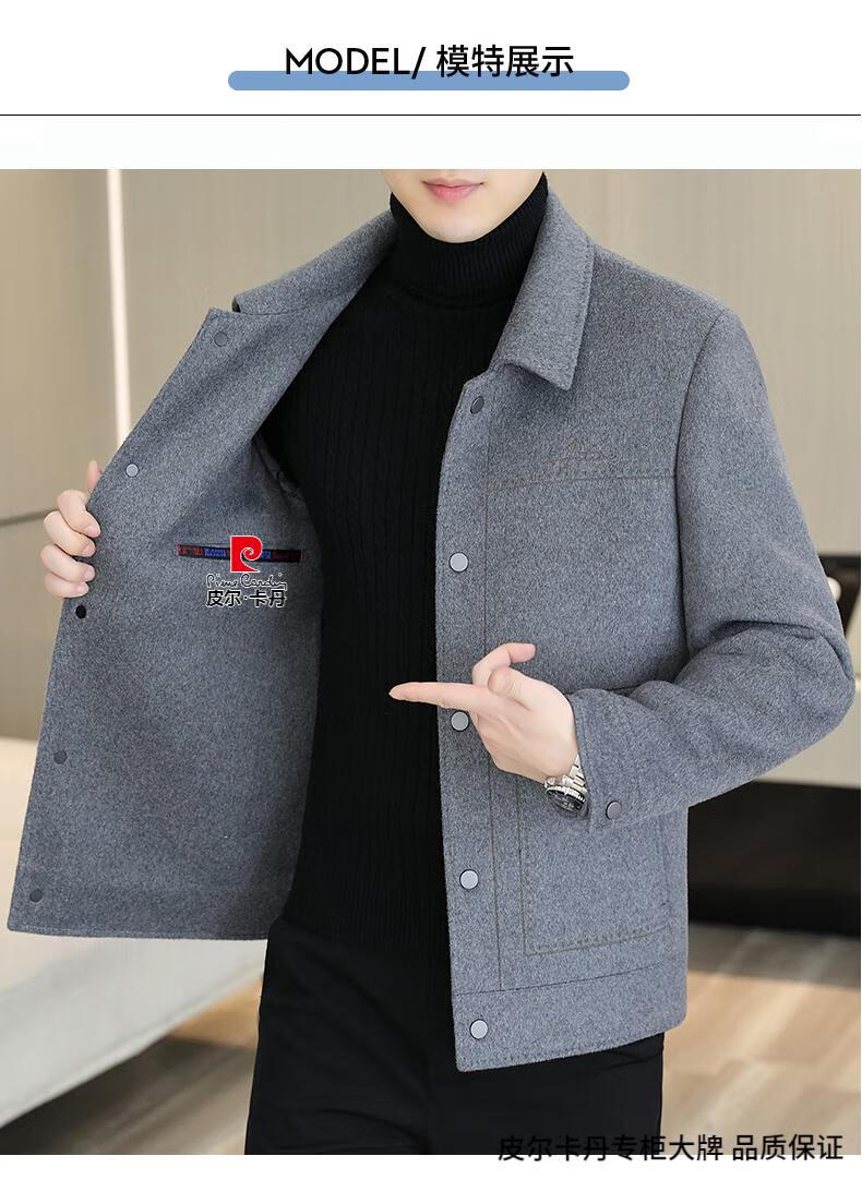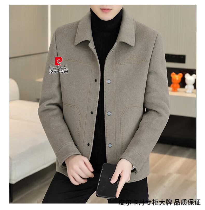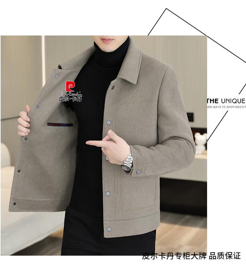 Pierre Cardin Men's Double-sided Woolen Jacket Woolen Jacket Autumn and Winter Men's Woolen Coat Short Cashmere Windbreaker Men's Khaki 2XL 185 Size (145-160Jin Jin is equal to 0.5 kg can be worn)