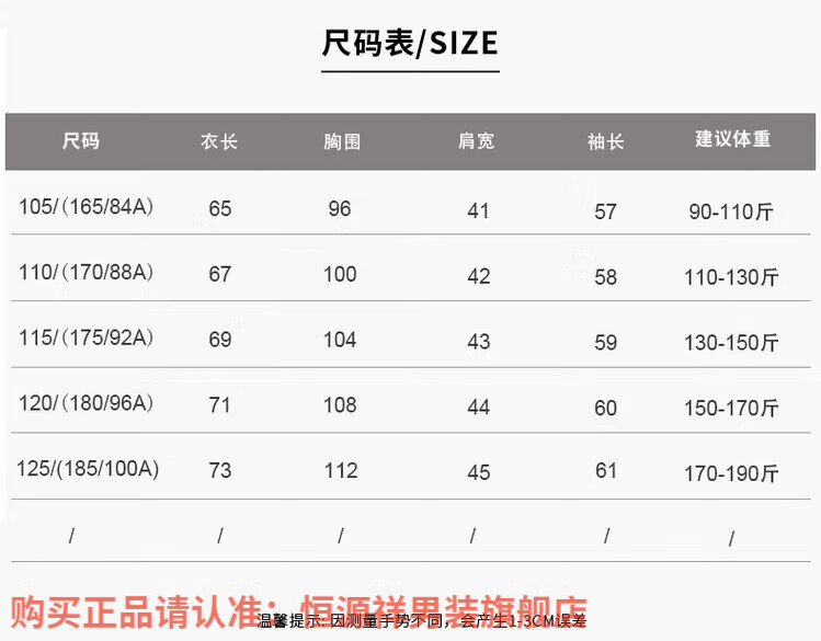 China (cm) 165 / 88-90 170 / 96-98 175 / 108-110 180 / 118-122 185 / 126-130