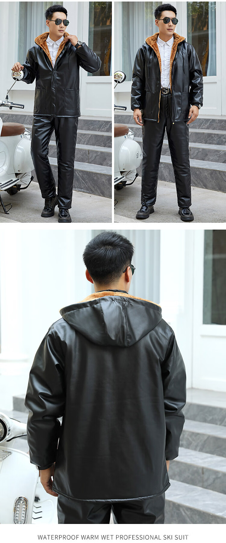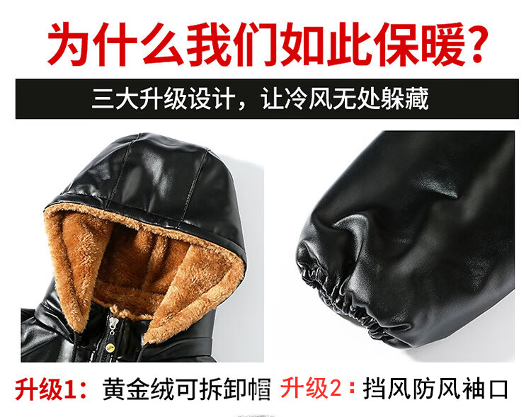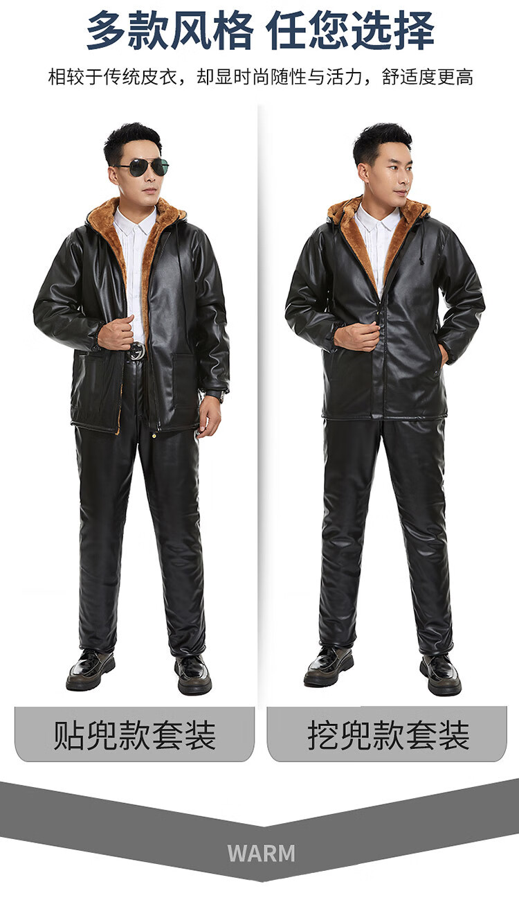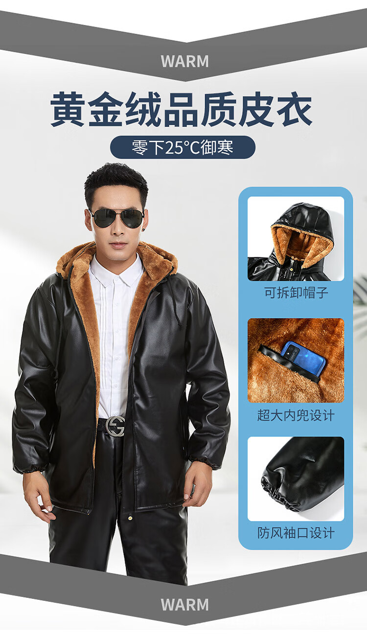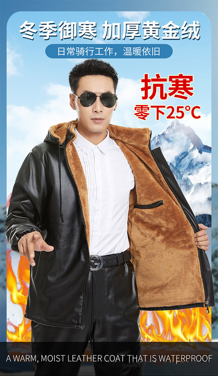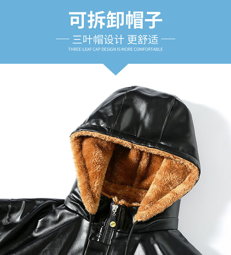 NASALIKE Men's Velvet Thickened Leather Jacket Takeaway Rider Winter Leather Driving Slaughterhouse Work Clothes Leather Pants Suit Velvet Patch Pocket Removable Hood Leather Jacket Deep Cold Resistance-3 XL (Social Guy)