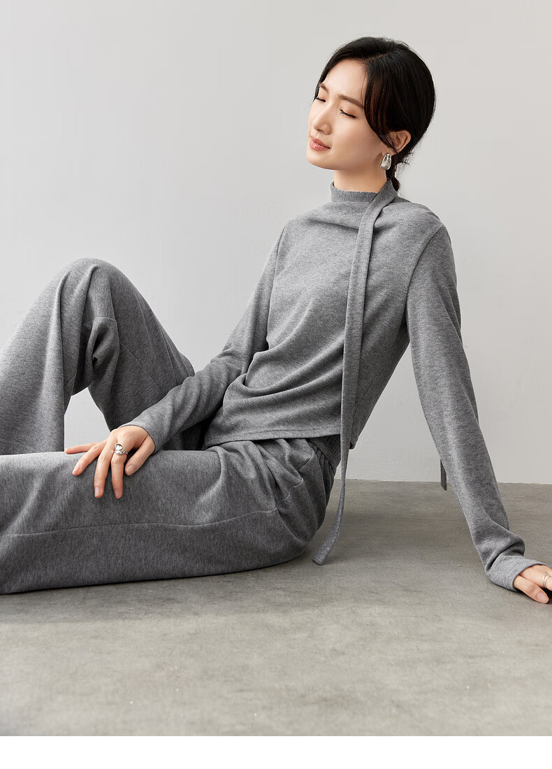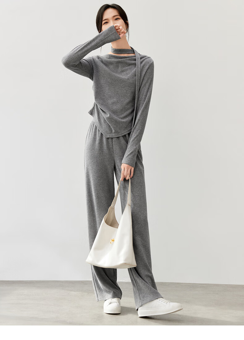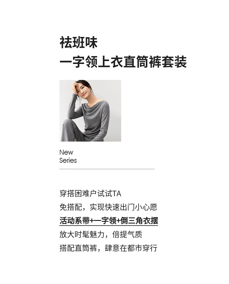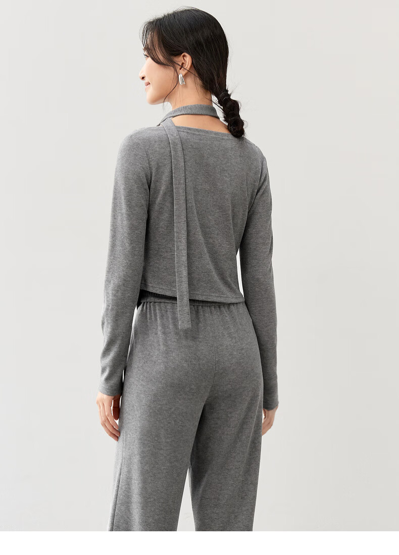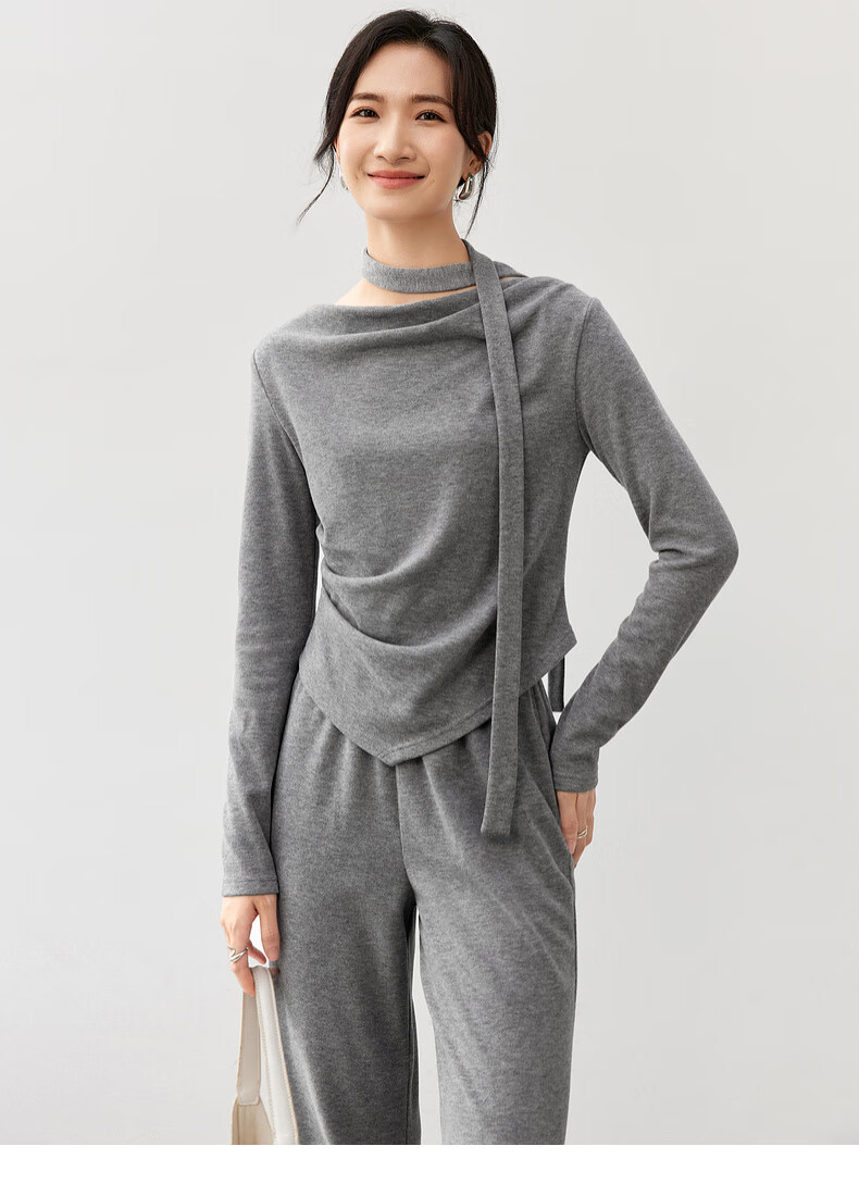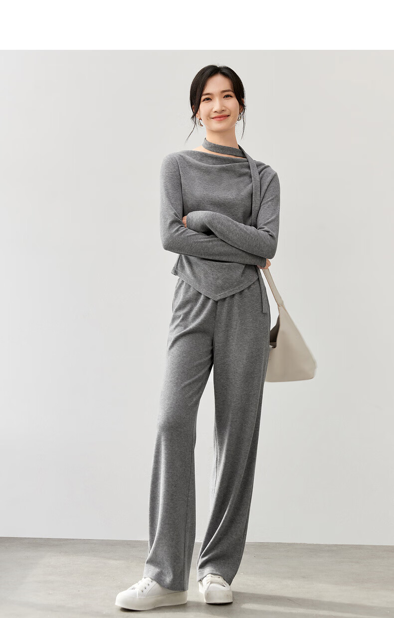 Chandubila fashionable and elegant lace-up one-line collar pleated waist top straight wide-leg pants suit dark gray M
