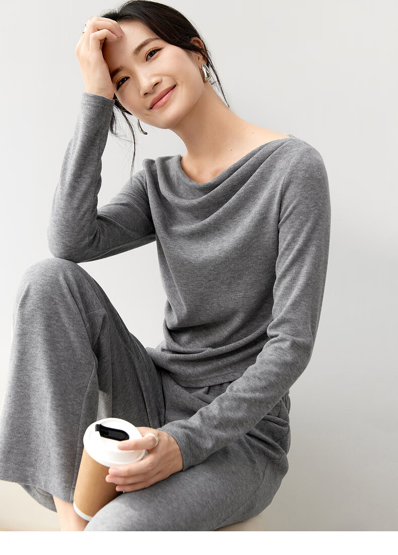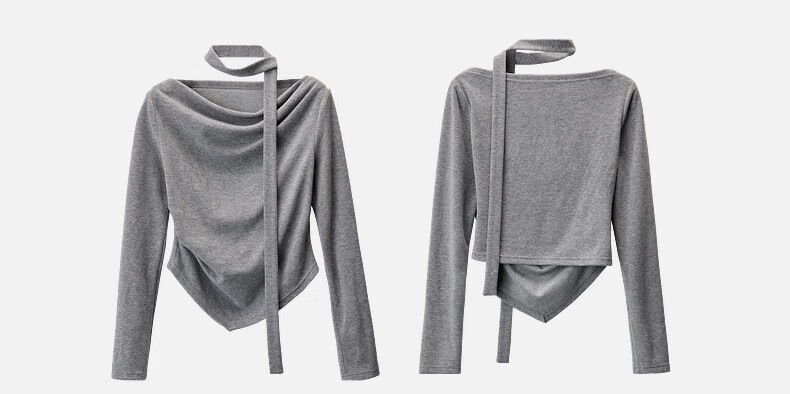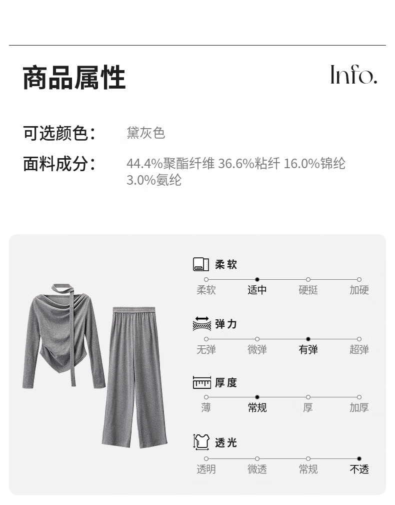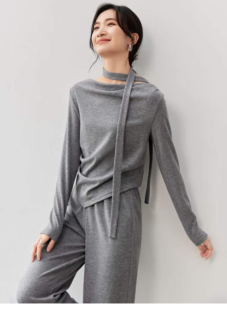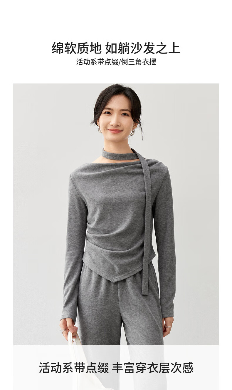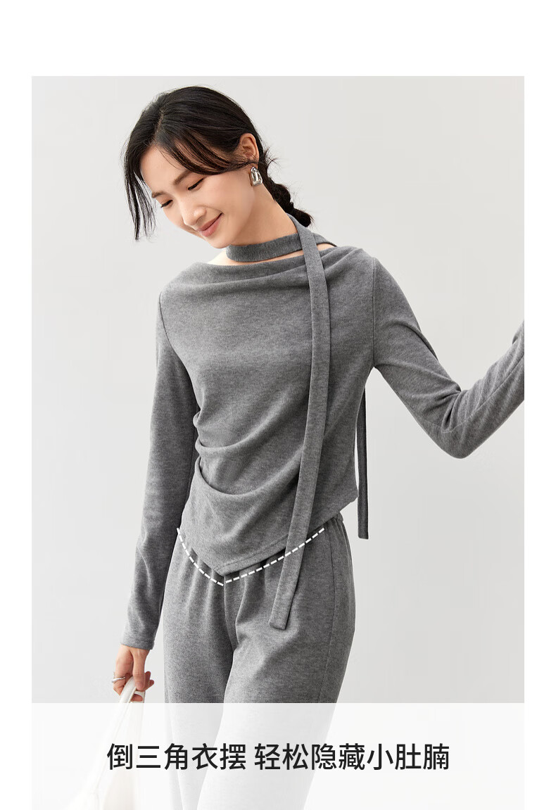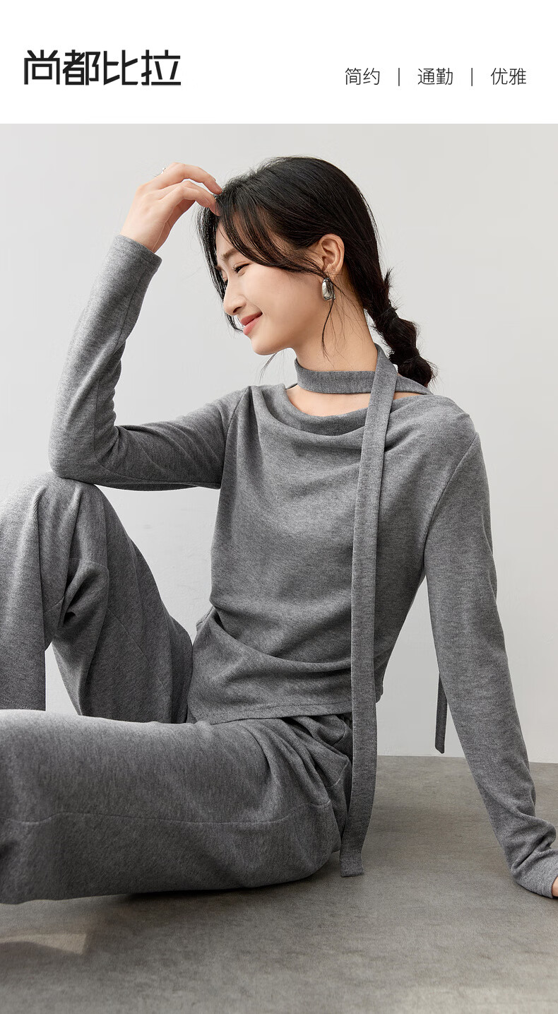 Chandubila fashionable and elegant lace-up one-line collar pleated waist top straight wide-leg pants suit dark gray M