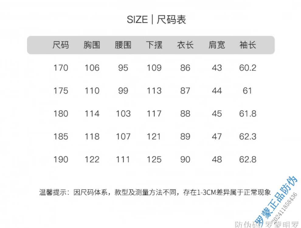 China (cm) 165 / 88-90 170 / 96-98 175 / 108-110 180 / 118-122 185 / 126-130