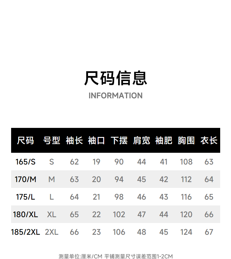 China (cm) 165 / 88-90 170 / 96-98 175 / 108-110 180 / 118-122 185 / 126-130