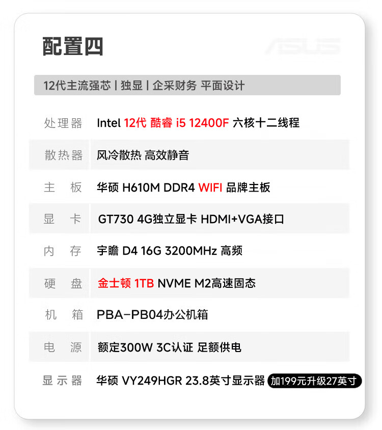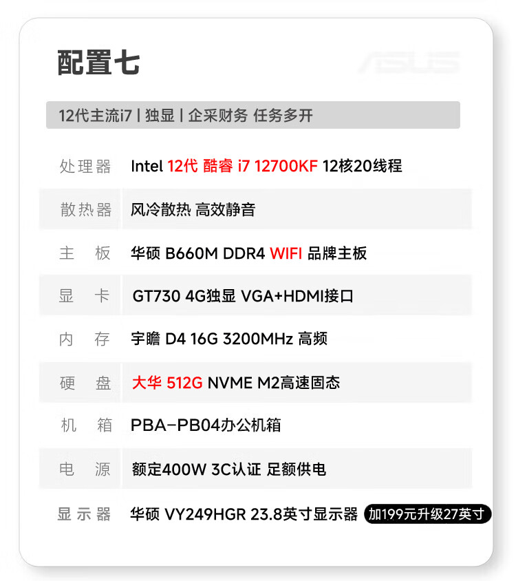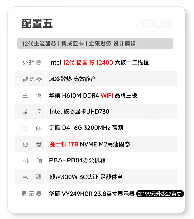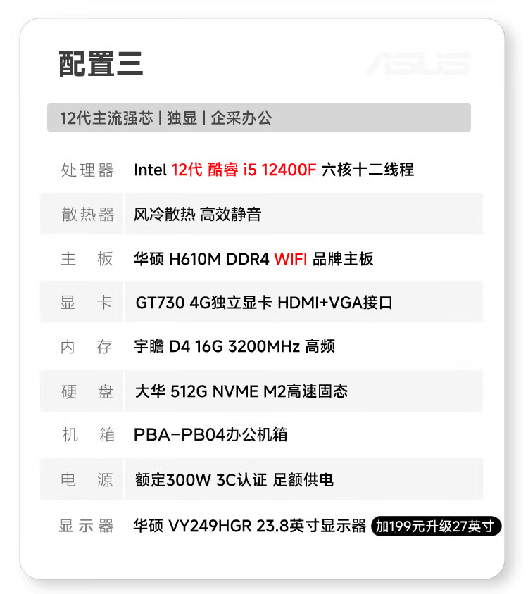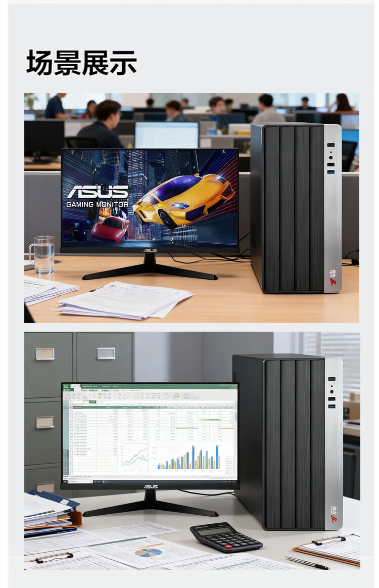 ASUS computer i7 12700/i5 13400/i5 14400 commercial office design stock trading entertainment cashier home DIY desktop computer host complete set configuration three i5 12400F | 512G | independent display host + ASUS 23.8-inch monitor
