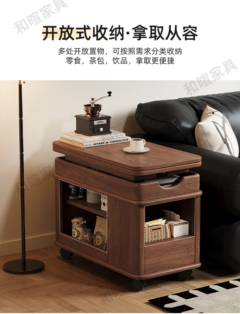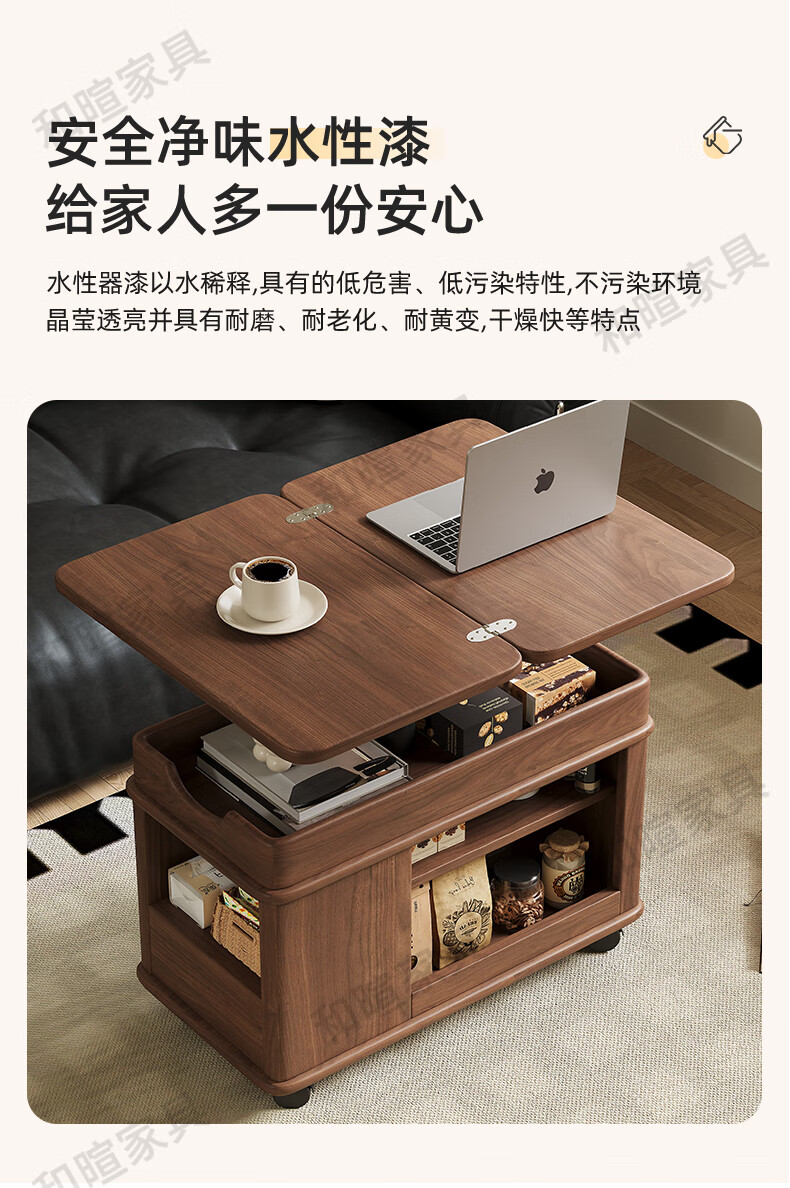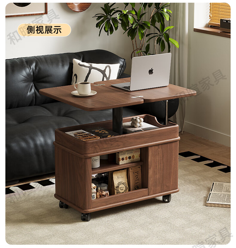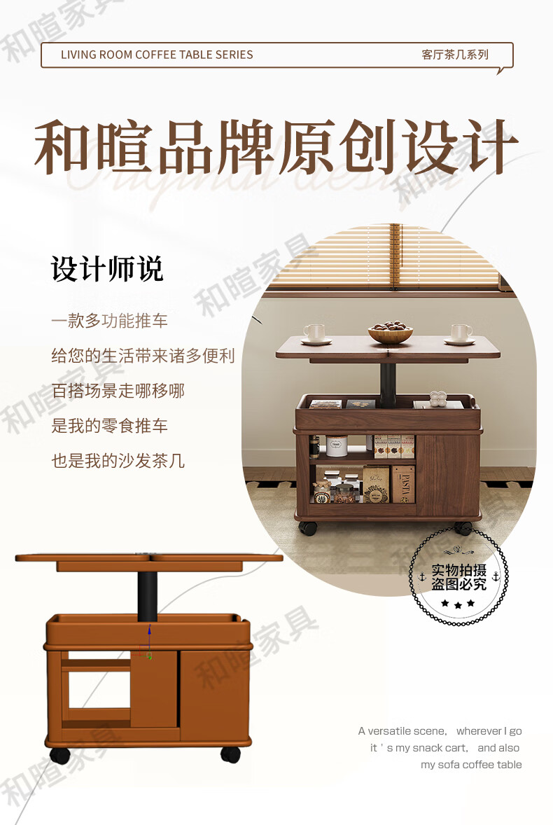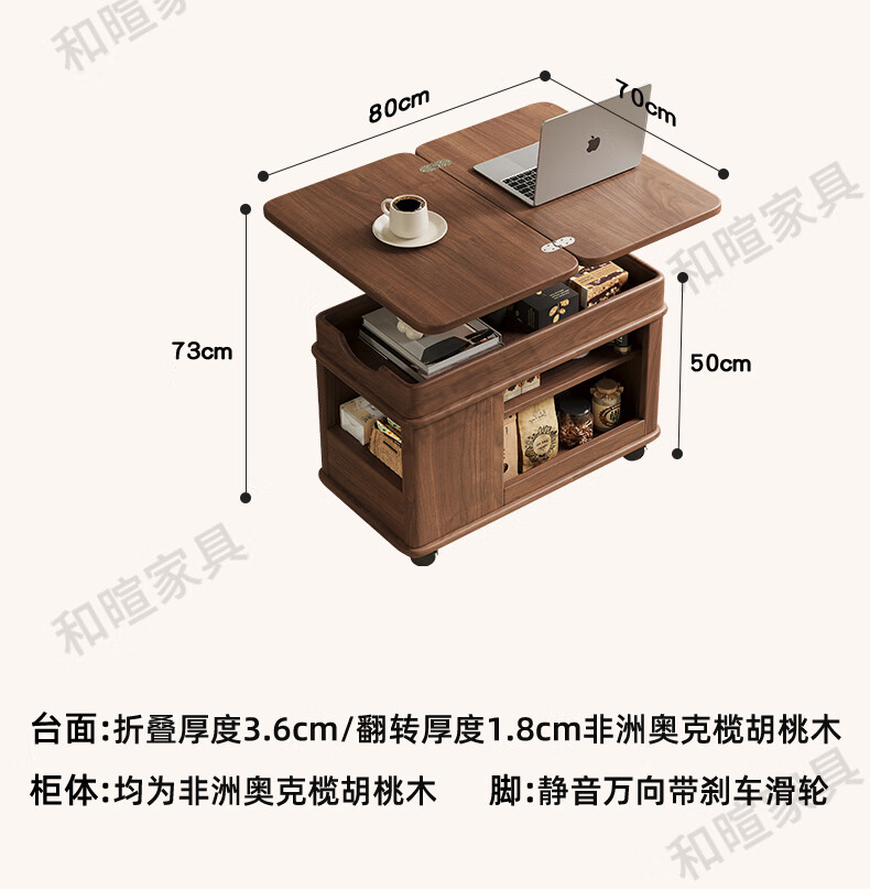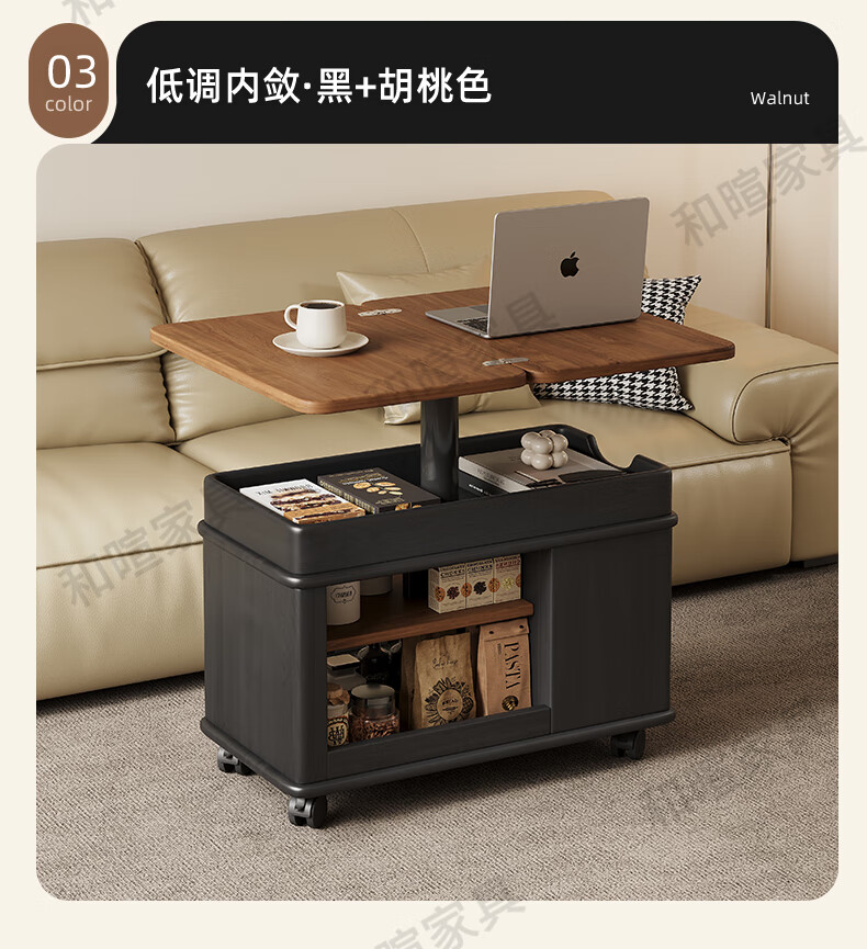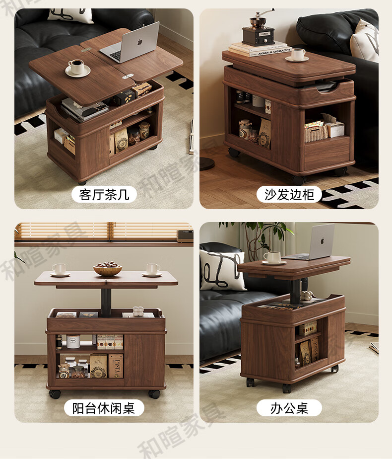 Hexuan solid wood movable coffee table with foldable lifting storage side cabinet multi-functional wheeled sofa side table trolley Lecheng medium color