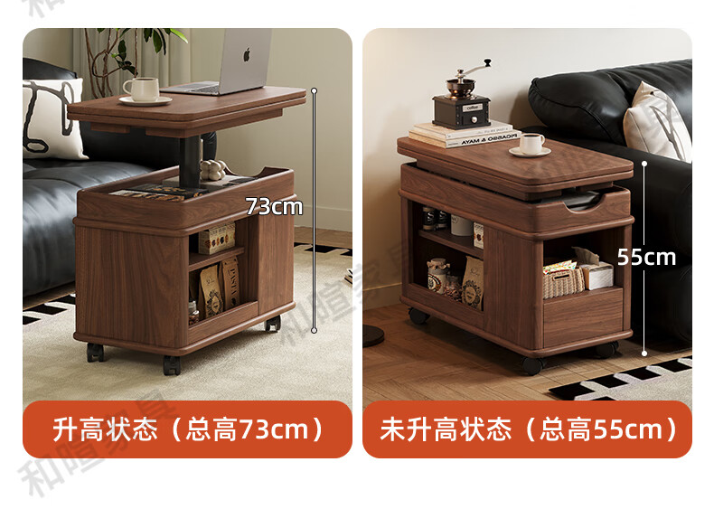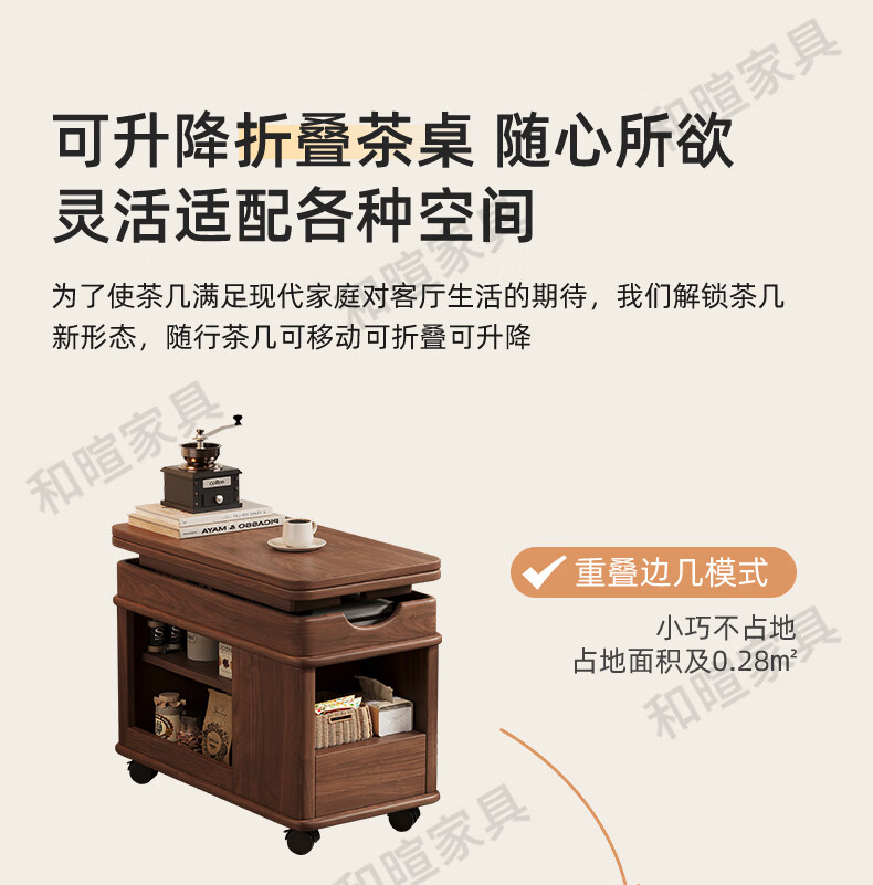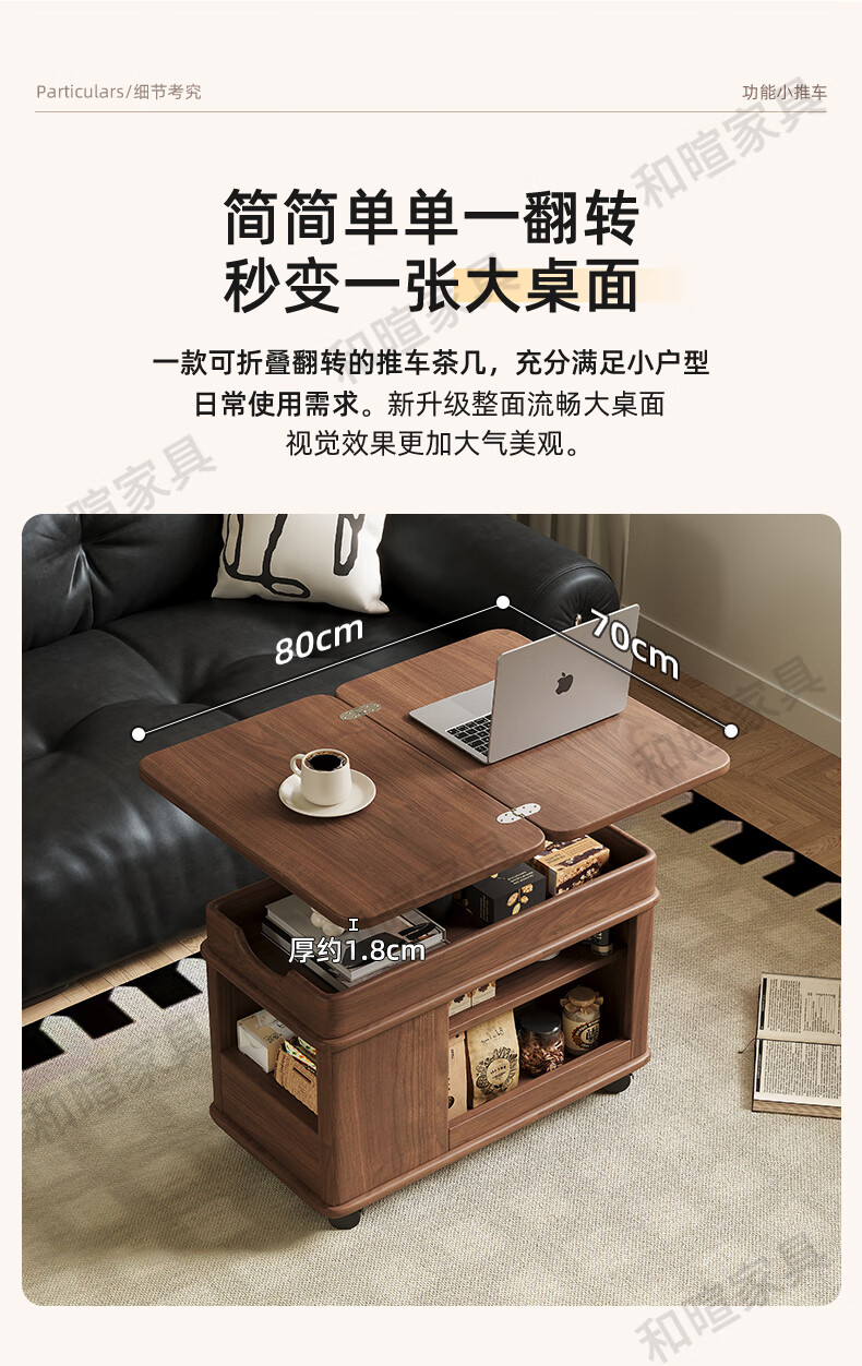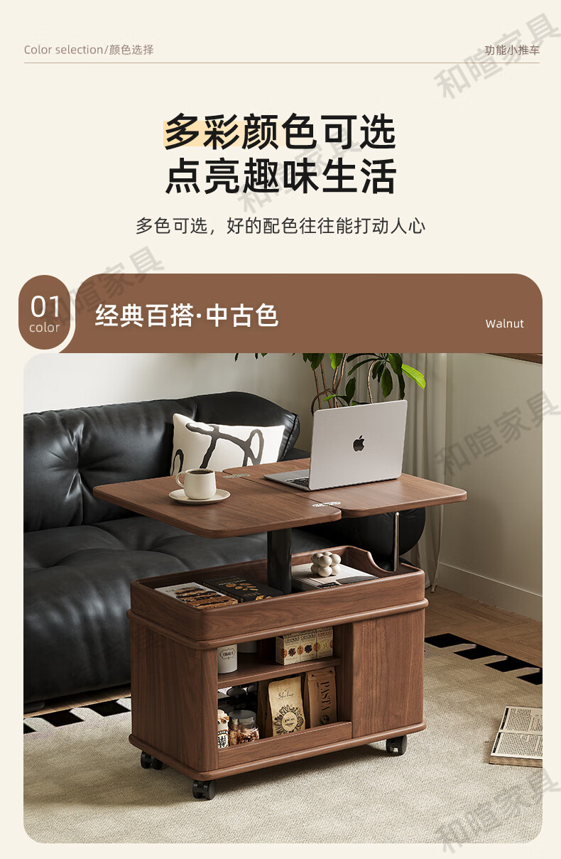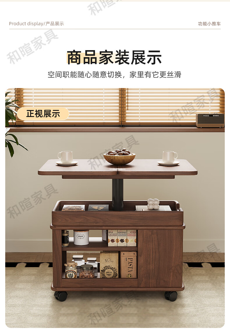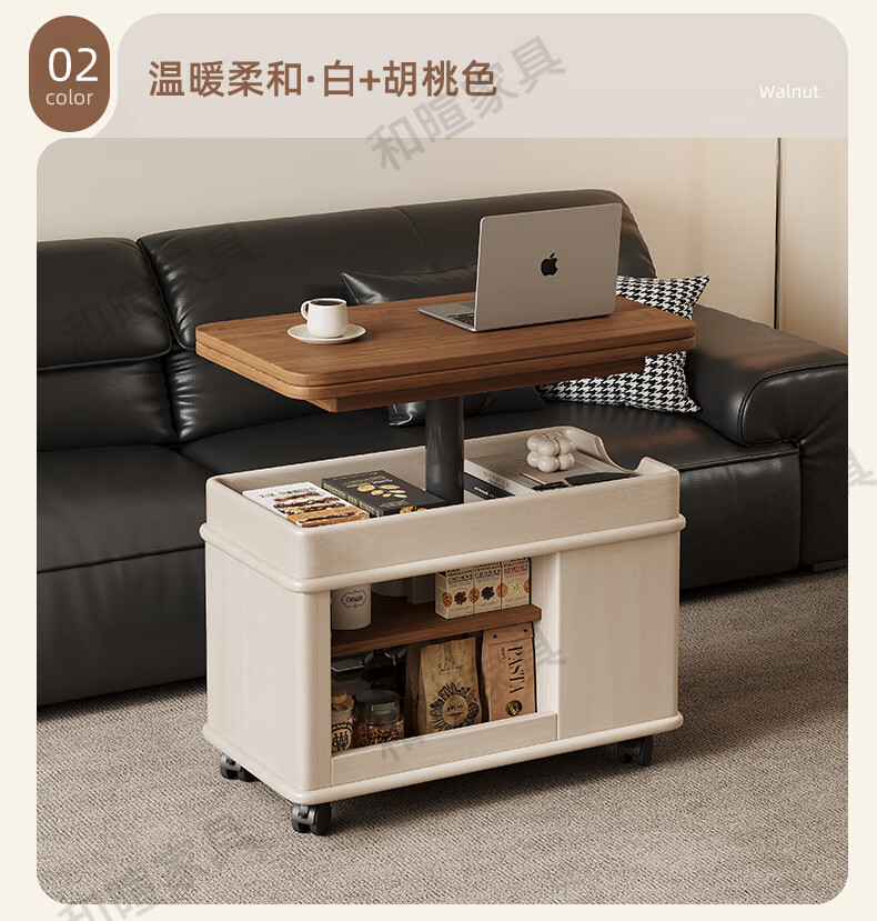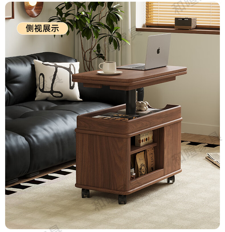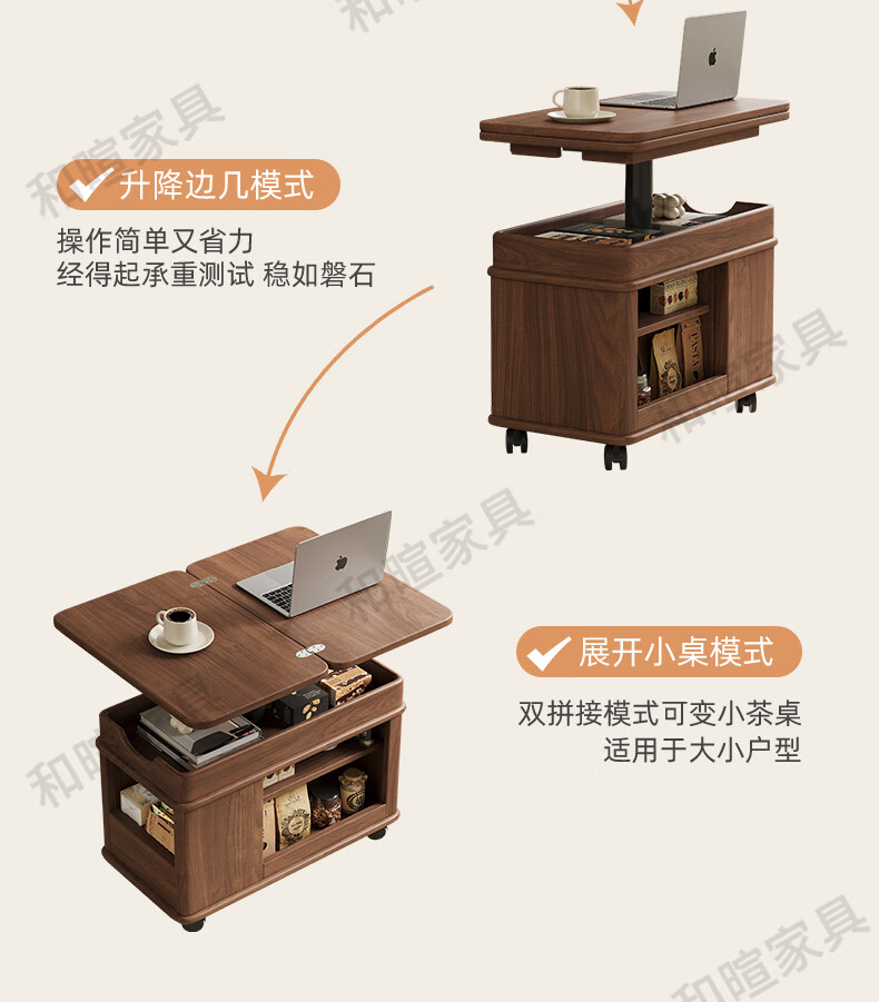 Hexuan solid wood movable coffee table with foldable lifting storage side cabinet multi-functional wheeled sofa side table trolley Lecheng medium color