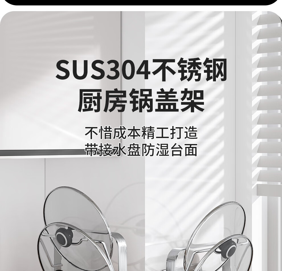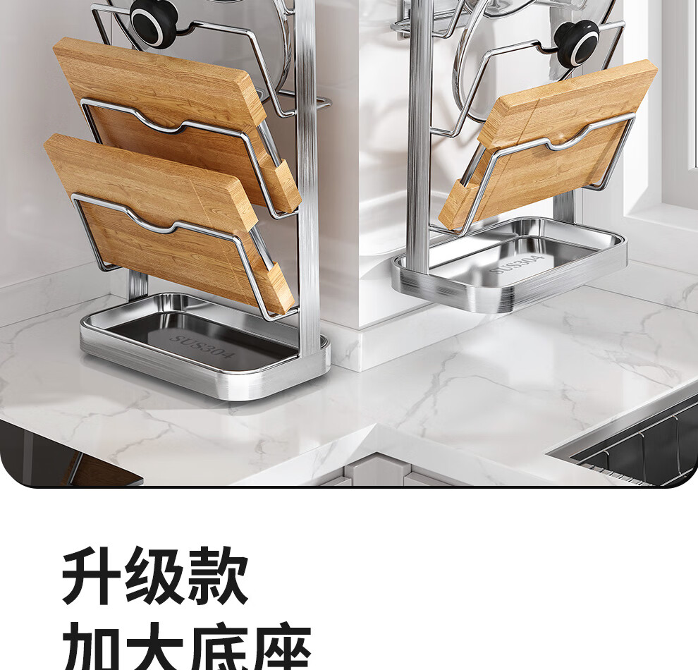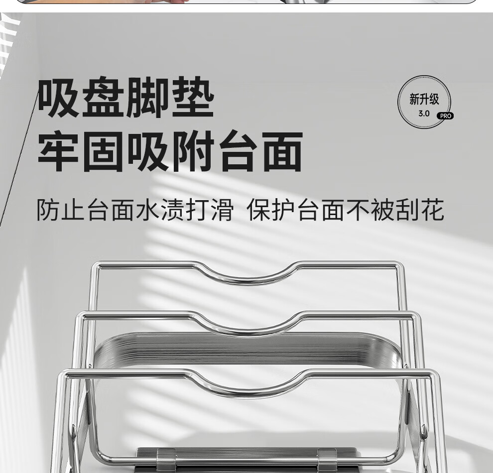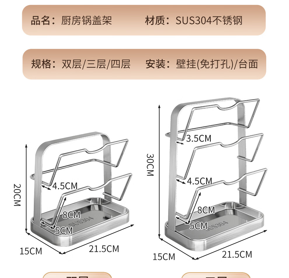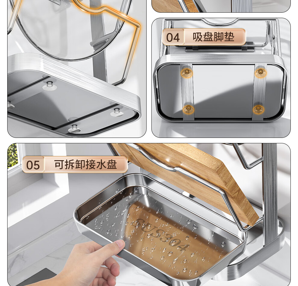 Jiabaili 304 stainless steel pot lid rack wall-mounted punch-free kitchen storage rack with water tray 304 steel double-layer countertop_suction cup foot pad