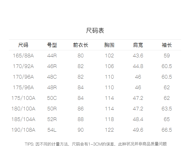 China (cm) 165 / 88-90 170 / 96-98 175 / 108-110 180 / 118-122 185 / 126-130