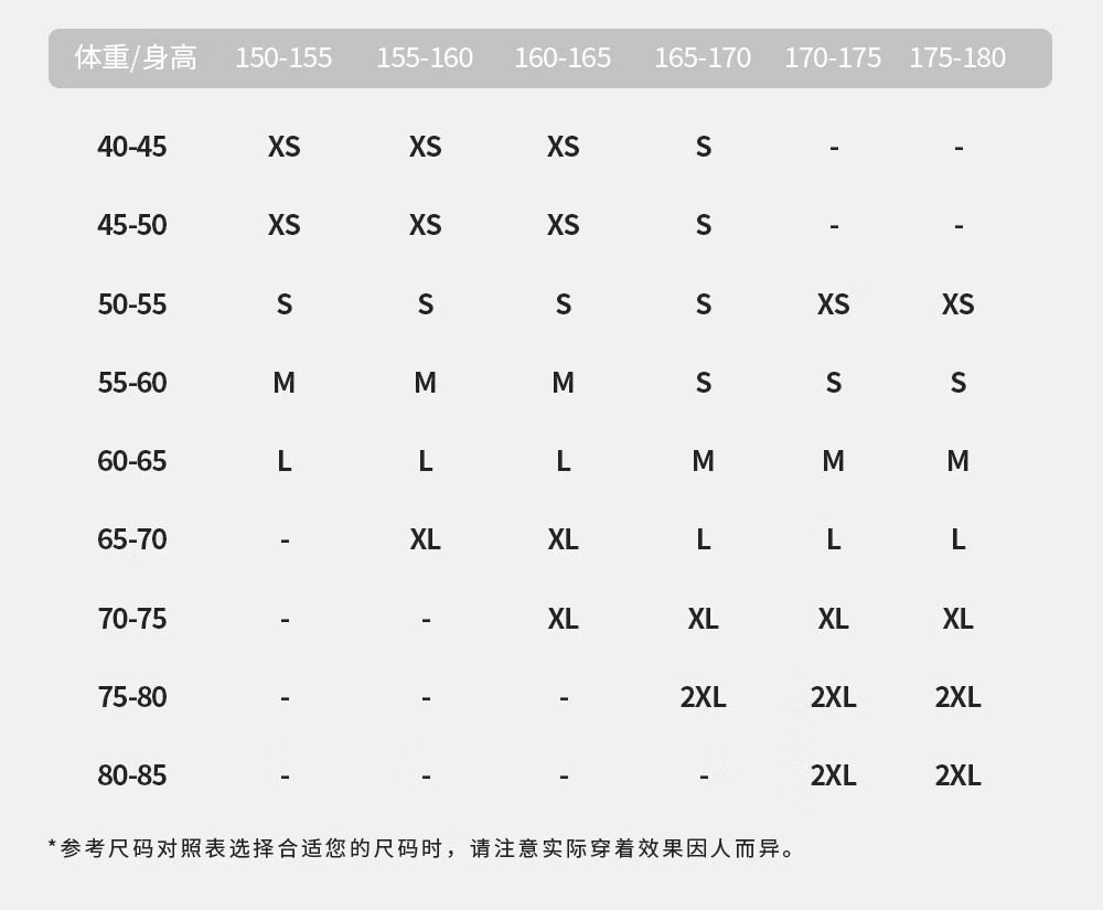 China (cm) 160-165/84-86 165-170 / 88-90 167-172 / 92-96 168-173 / 98-102 170-176 / 106-110