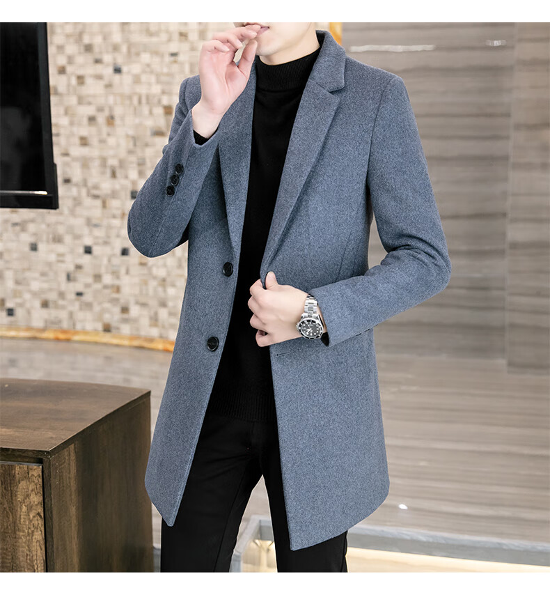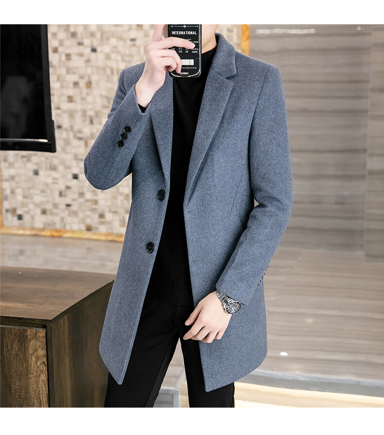 ROMON Wool Woolen Coat Men's Slim Mid-Length Windbreaker Autumn and Winter Thickened New Woolen Men's Jacket Korean Version Black 2XL