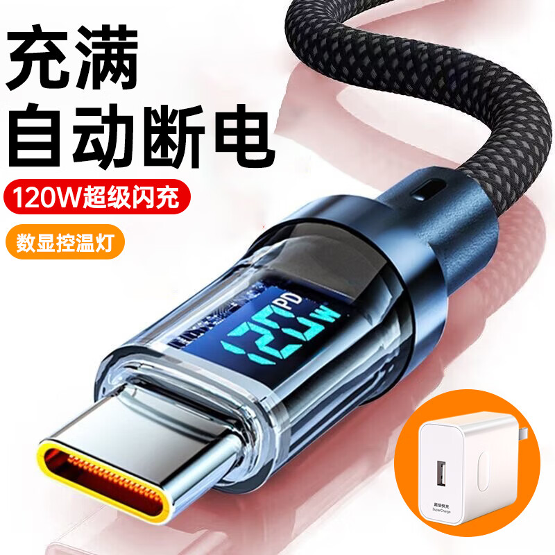 Aihaozhe 120W super flash charger digital display data cable type-c suitable for Huawei Honor vivo Xiaomi OPPO Android mobile phone charging cable thick 6A with light digital display fast charging set 120W light speed flash charging automatic matching current thoughtful indicator light 2 meters stop when full/safety protection