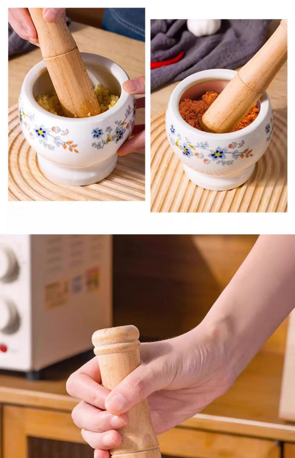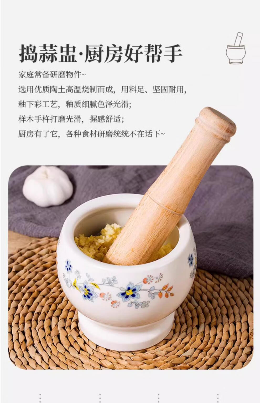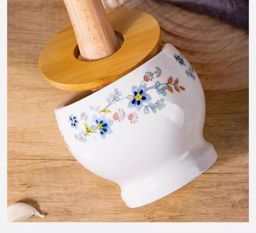 CLCEY garlic mortar household ceramic garlic mortar artifact manual mortar chili garlic masher stone mortar old-fashioned mortar masher Chunhuiman ceramic garlic masher-400ml + wooden