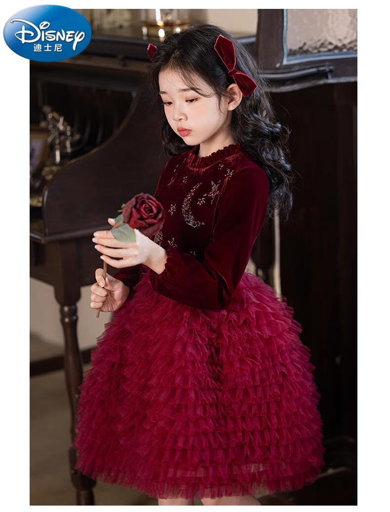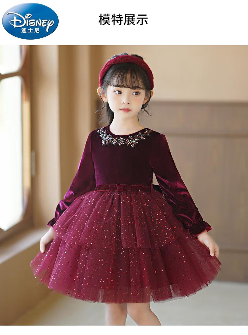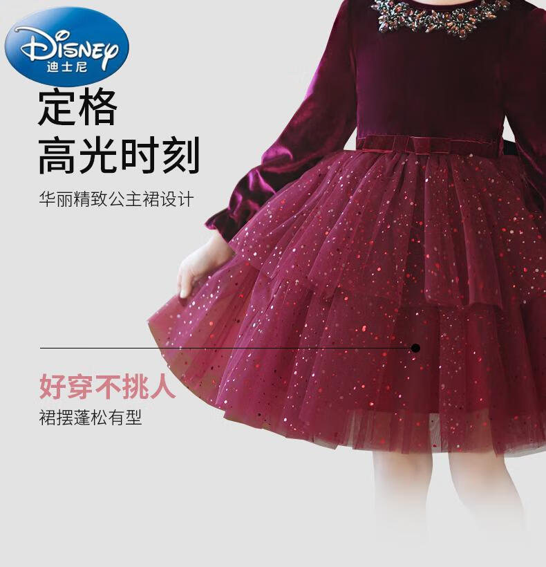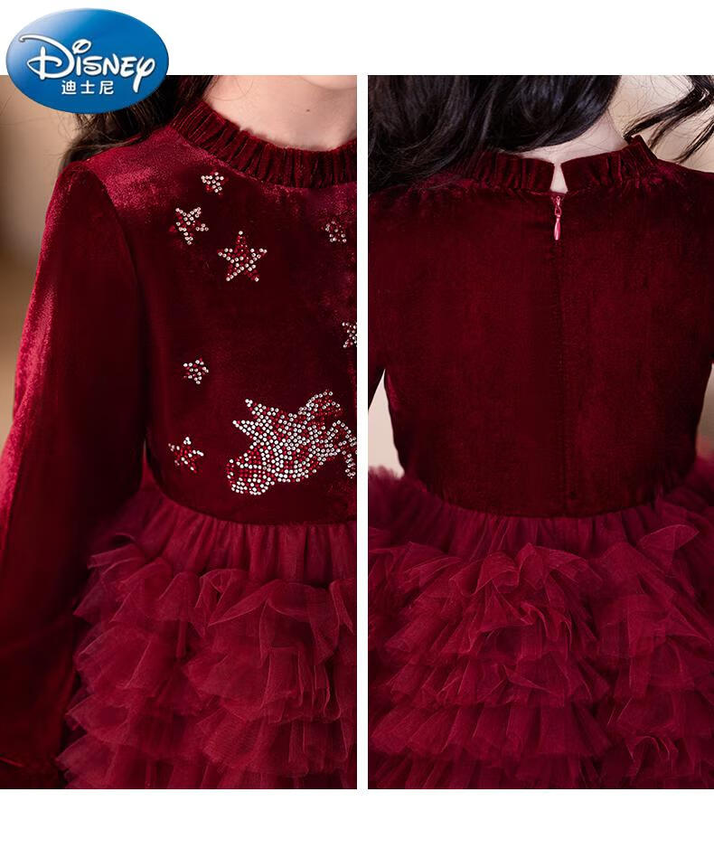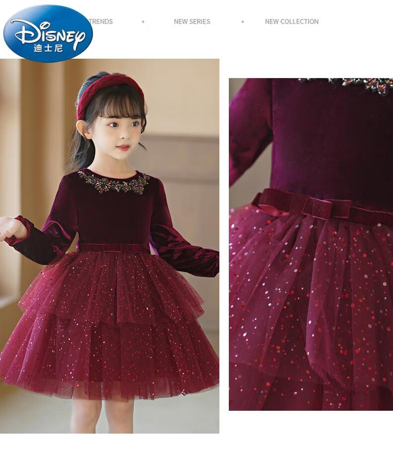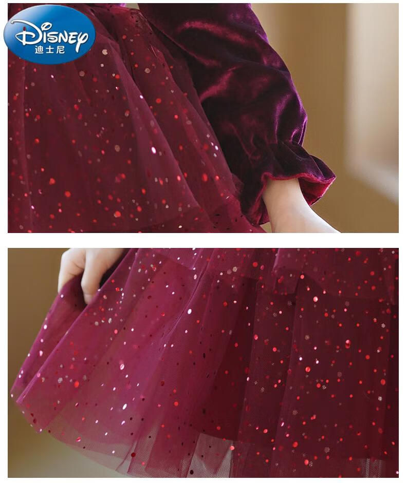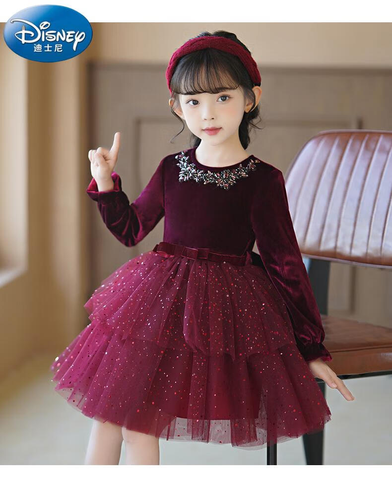 Disney girls dress children's autumn and winter gold velvet sequins burgundy puffy cake dress hosting performance princess dress burgundy 01 style 100 cm