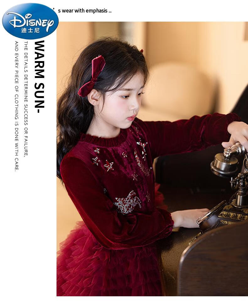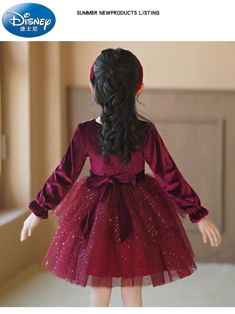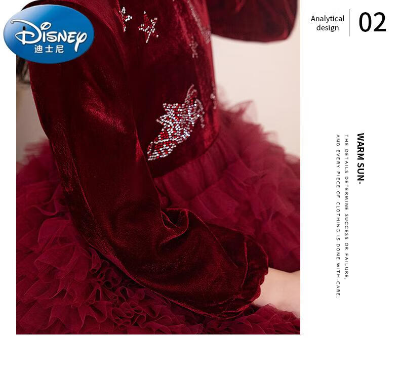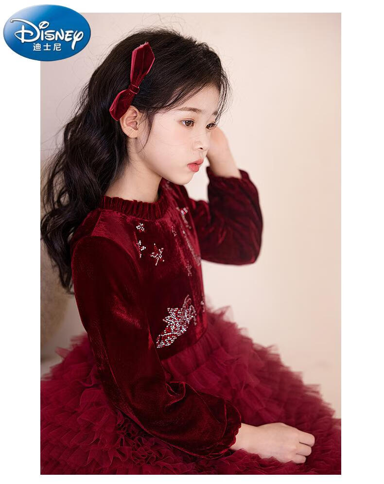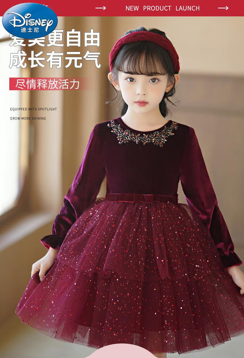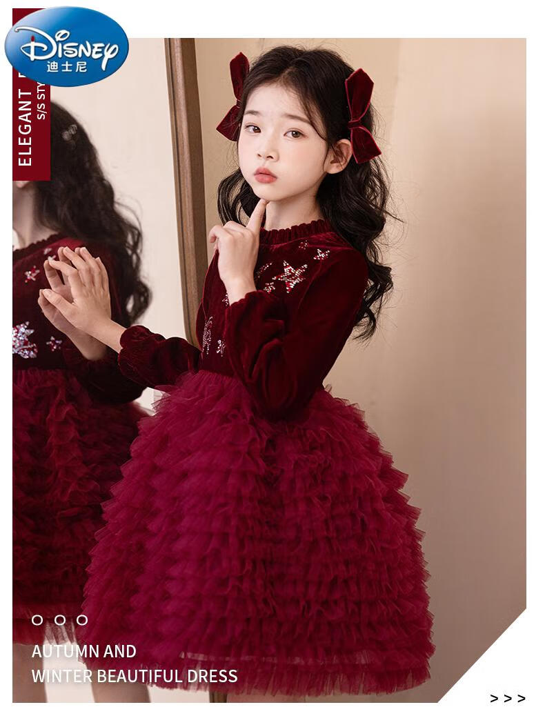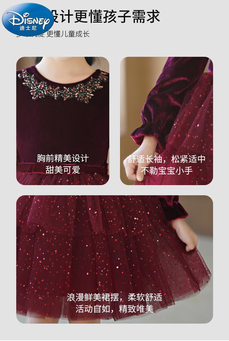 Disney girls dress children's autumn and winter gold velvet sequins burgundy puffy cake dress hosting performance princess dress burgundy 01 style 100 cm