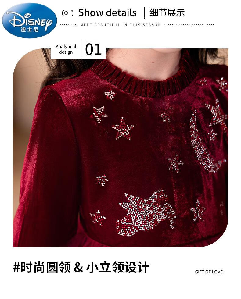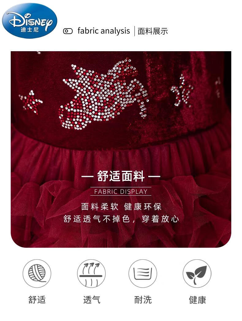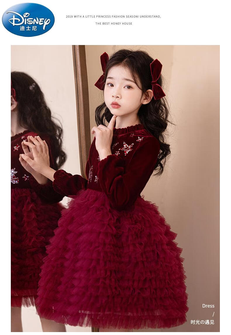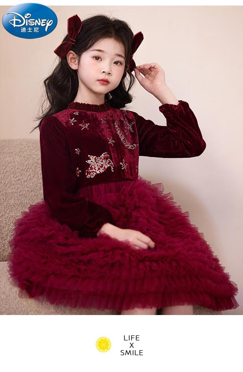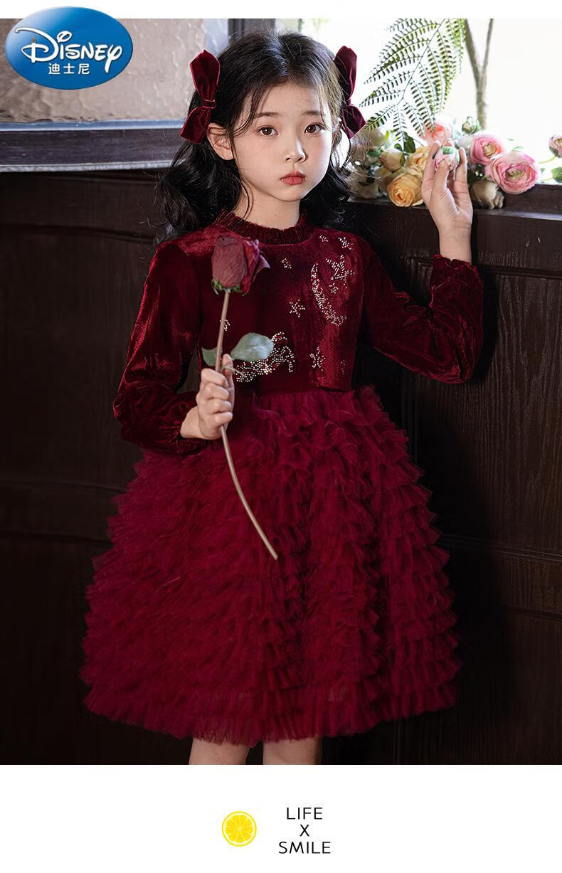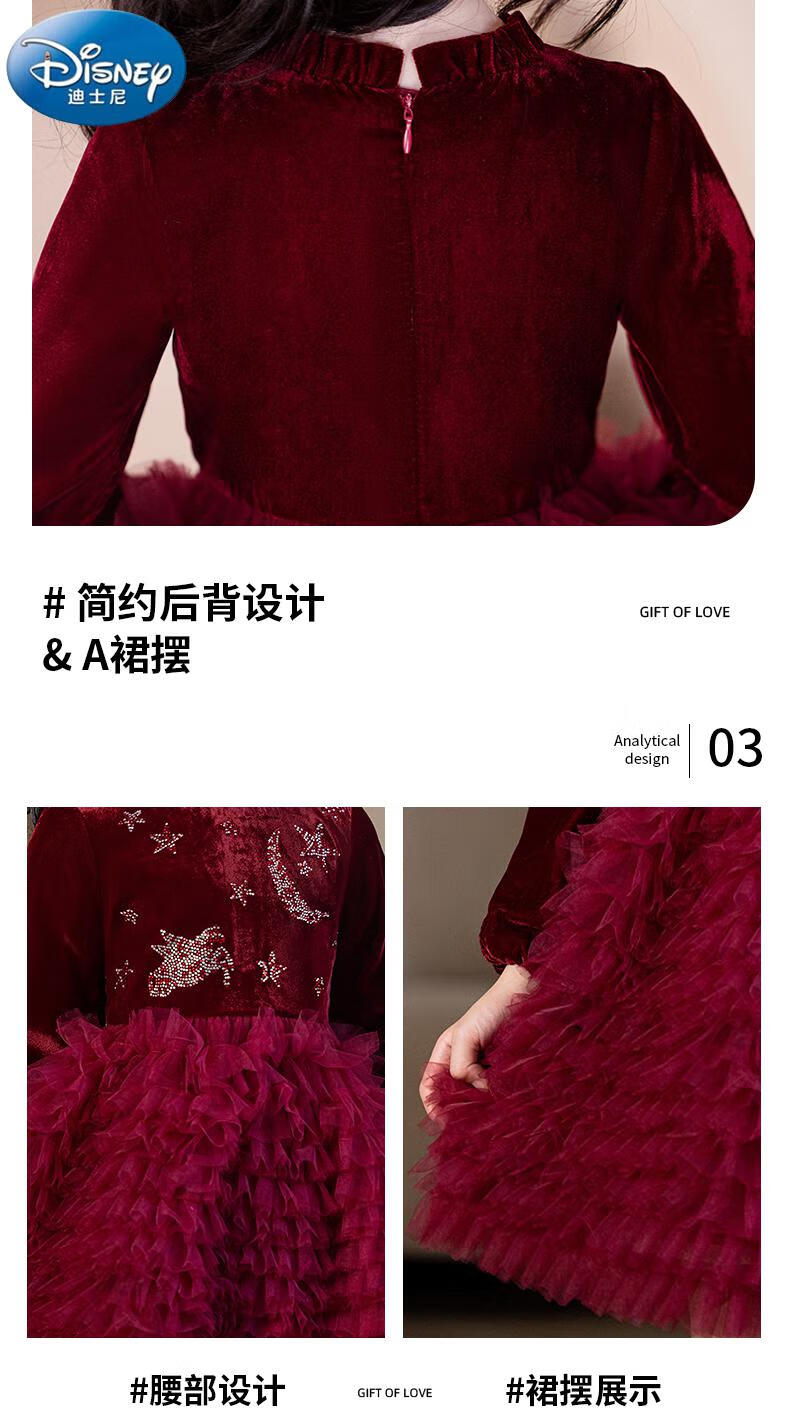 Disney girls dress children's autumn and winter gold velvet sequins burgundy puffy cake dress hosting performance princess dress burgundy 01 style 100 cm