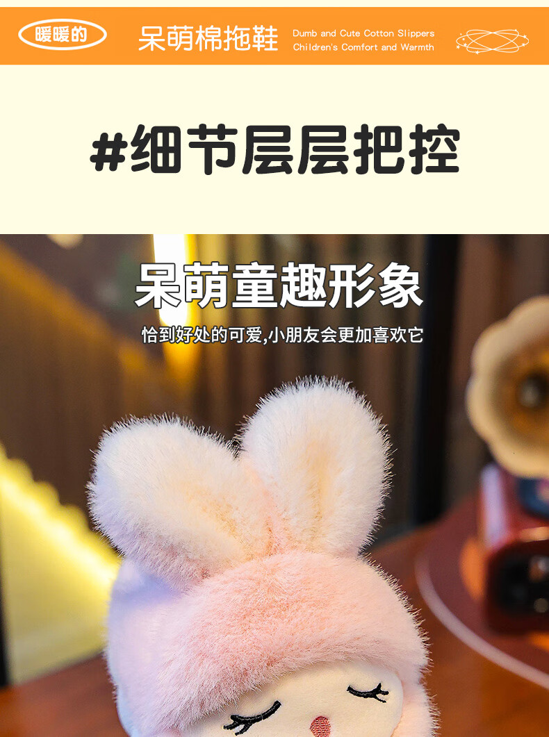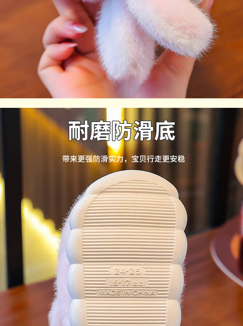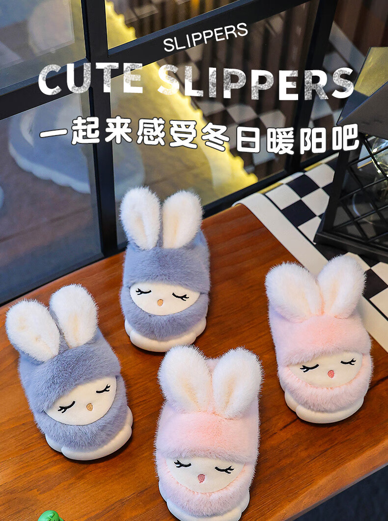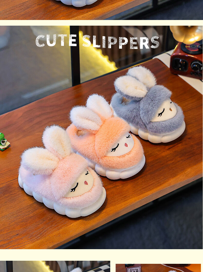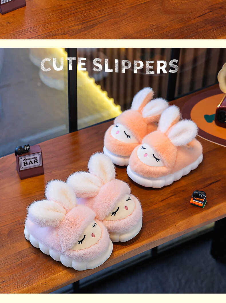 Candy astringent parent-child winter children's cotton slippers, cute rabbit warm plus velvet for boys and girls at home, non-slip soft bottom baby cotton slippers, cute rabbit slippers - pink, size 32-33, inner length 19.5cm