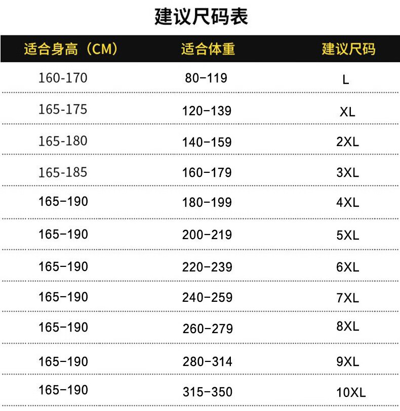 China (cm) 165 / 88-90 170 / 96-98 175 / 108-110 180 / 118-122 185 / 126-130