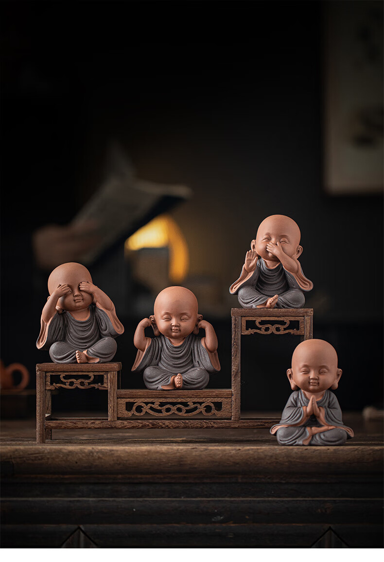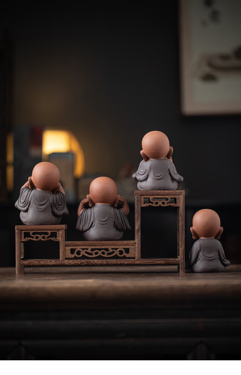 Refining Purple Clay Four Little Monk Tea Pet Ornaments with Personalized Characters for Raising Tea and Playing Zen Tea Room Tea Desktop Decorations <Black and Gray-Four Not Sets> + Three-layer Base/ZJH