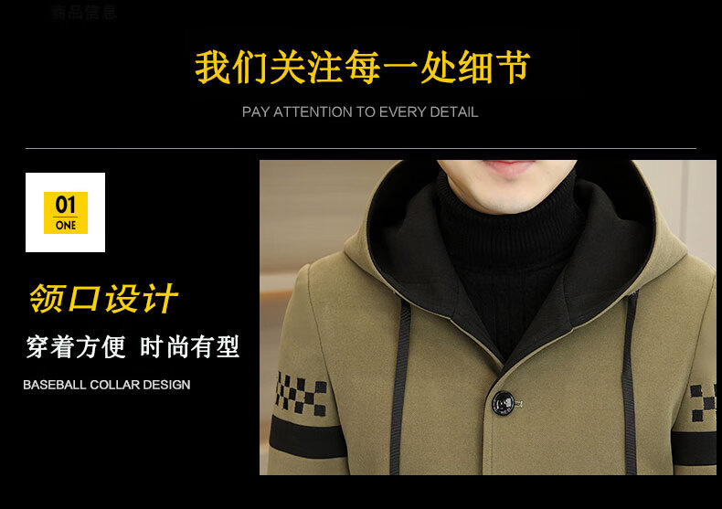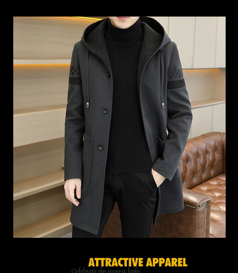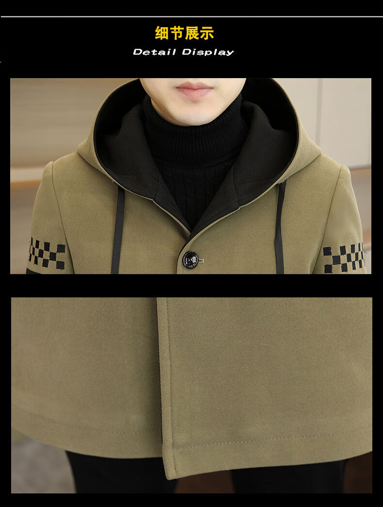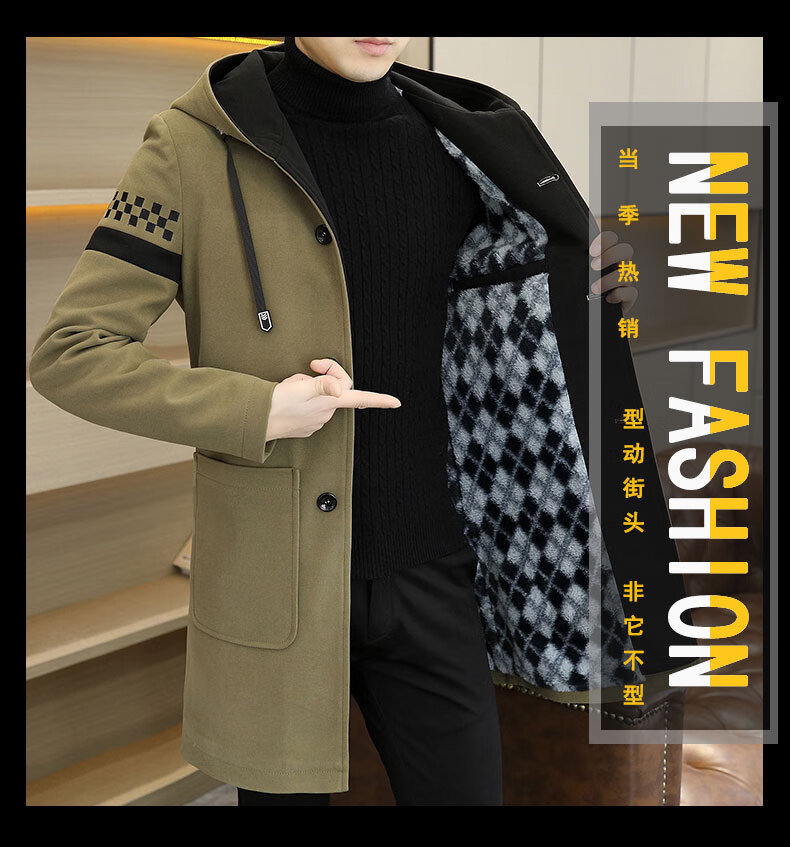 Pierre Cardin windbreaker men's mid-length velvet thickened woolen coat 2024 autumn and winter new woolen coat large size hooded top Khaki M