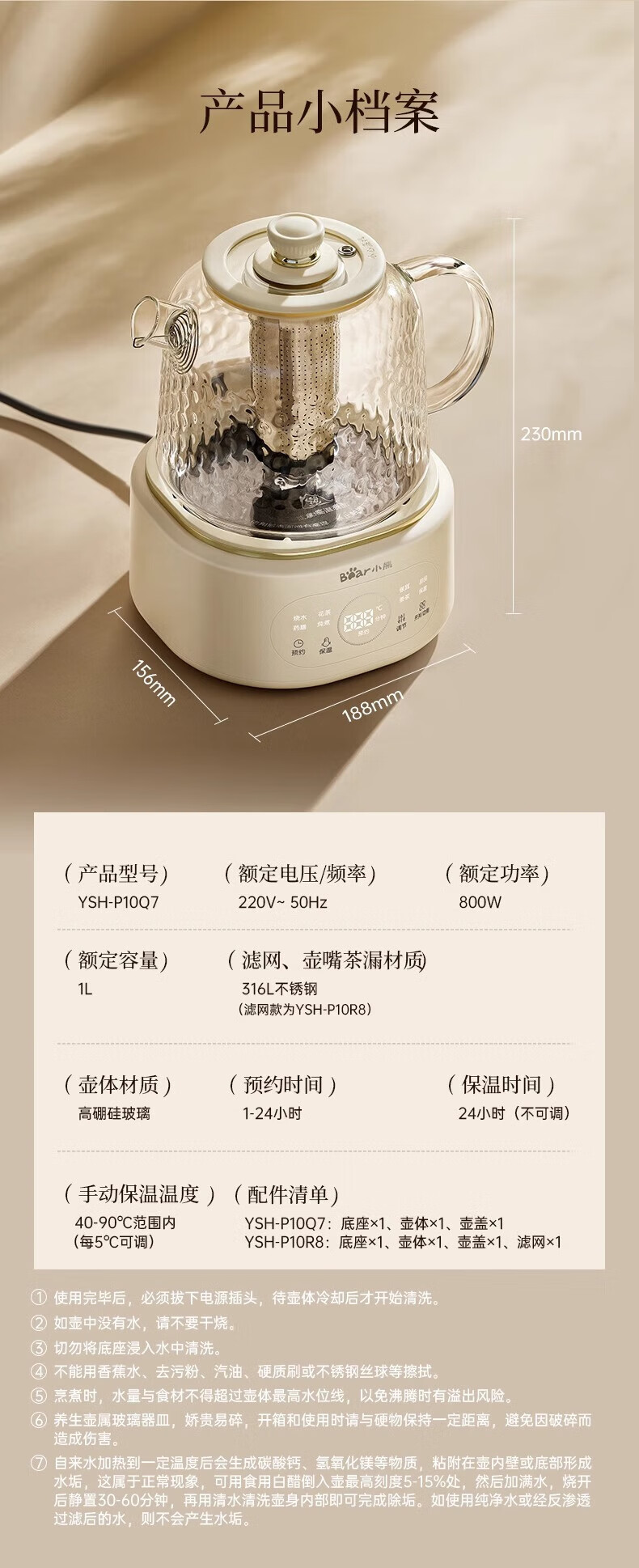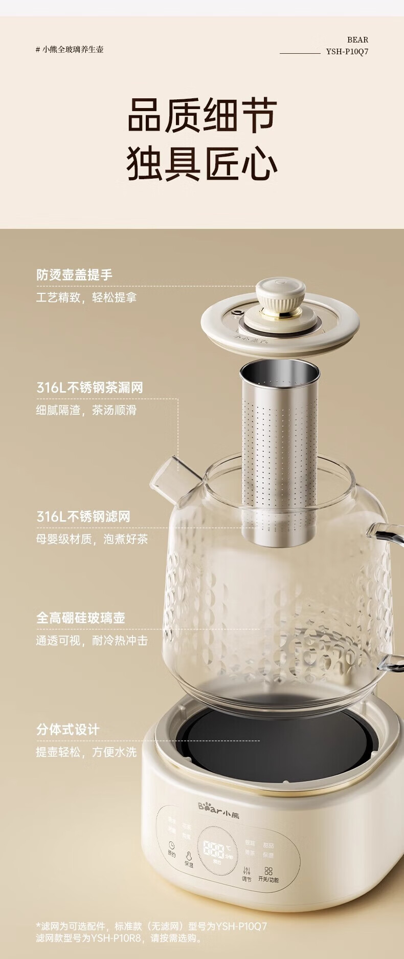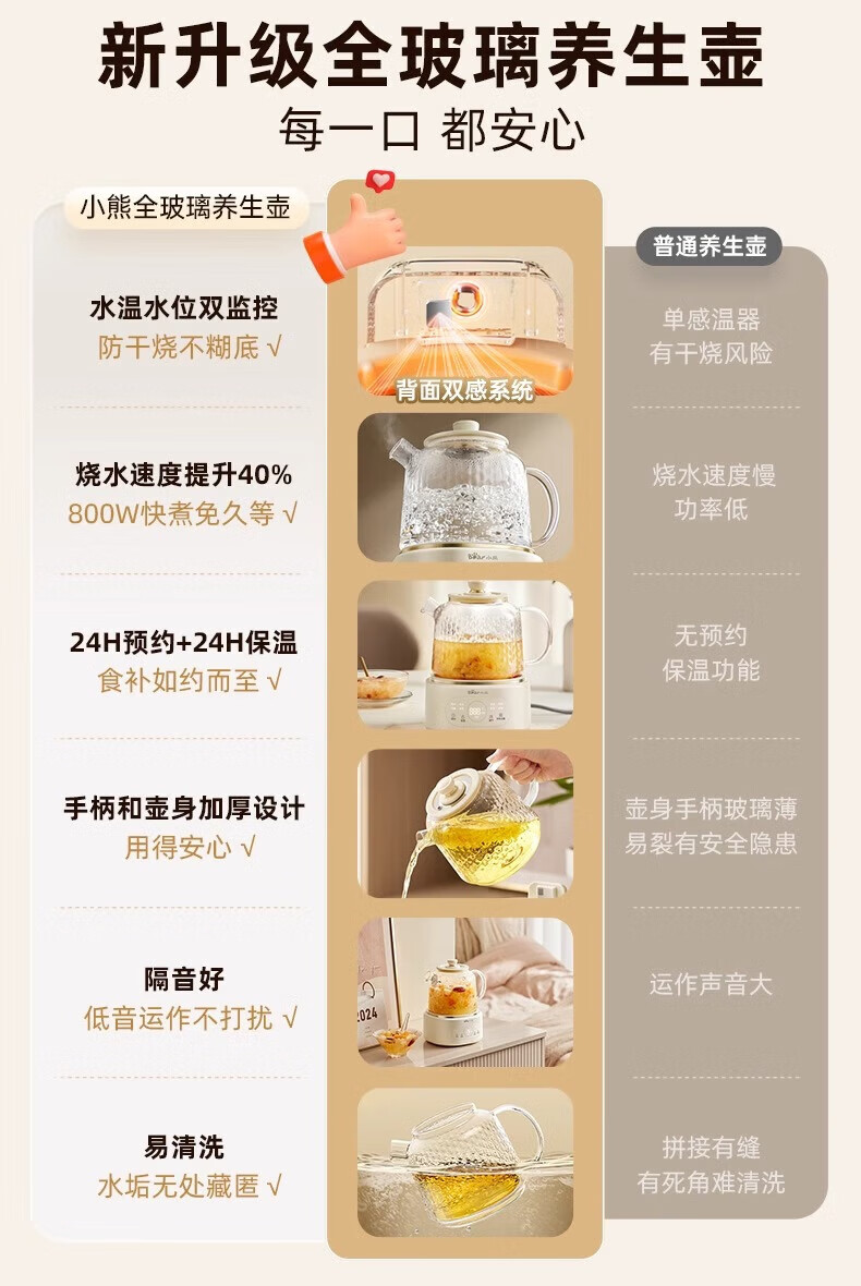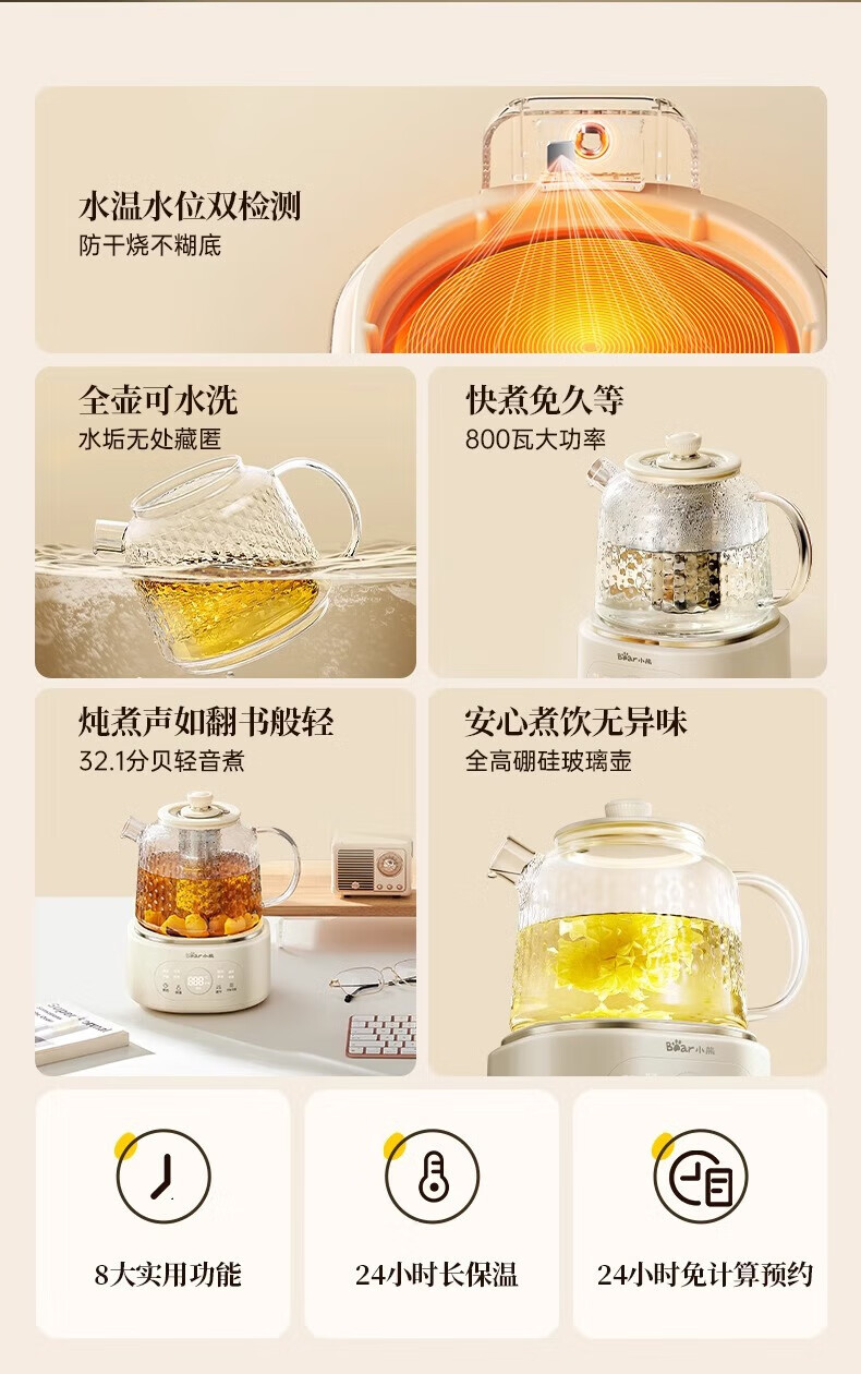 Bear all-glass health pot health cup office multi-function teapot flower teapot 0 metal constant temperature kettle official direct sales YSH-P10Q7 all-glass pot without filter 1L