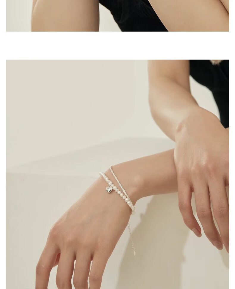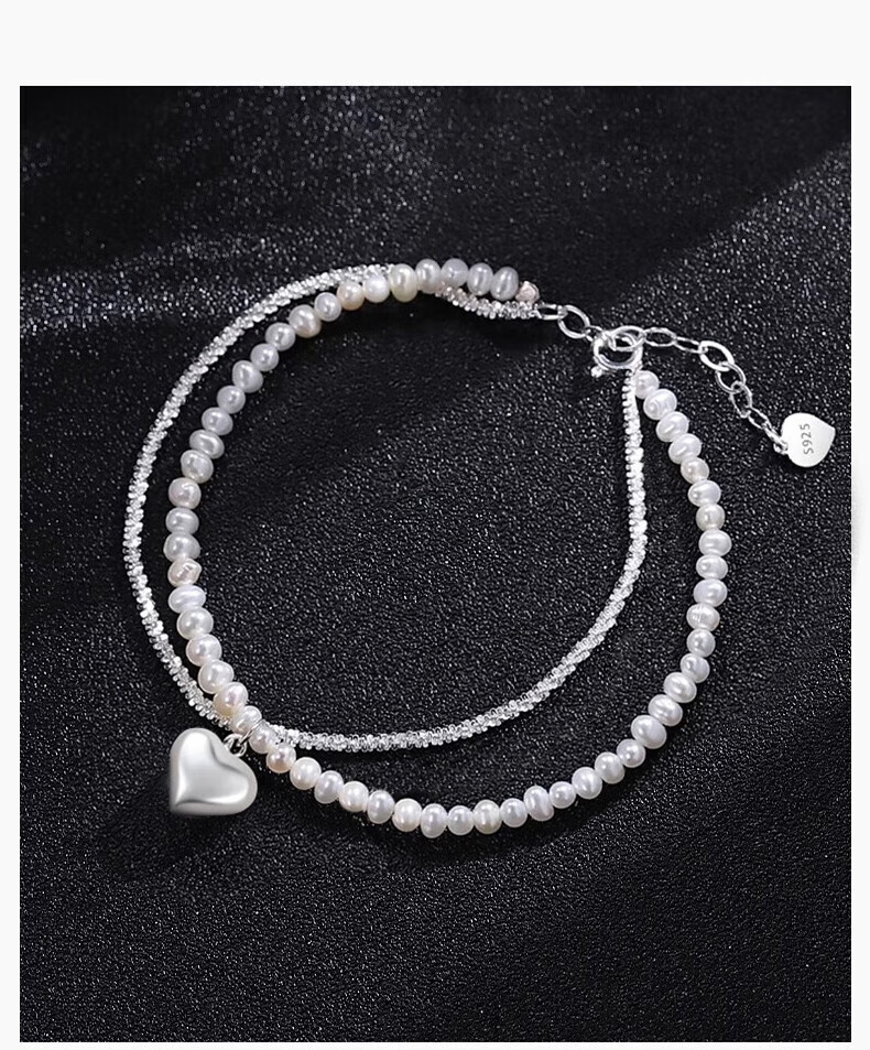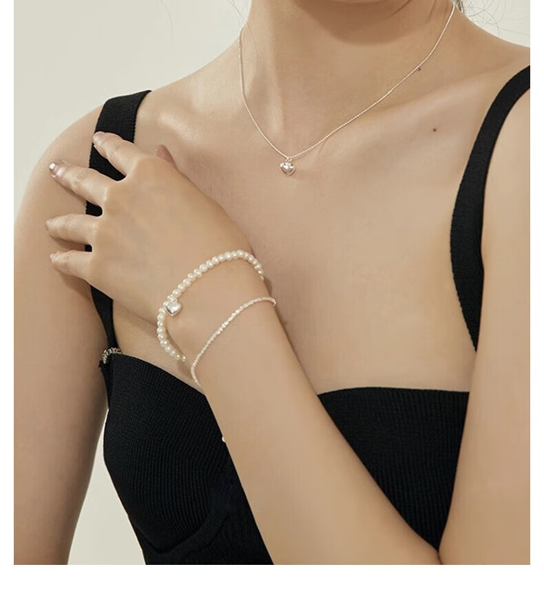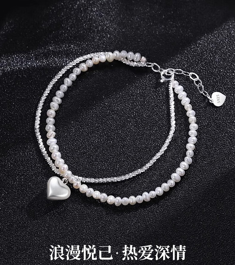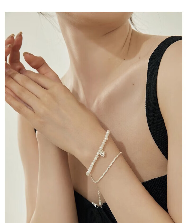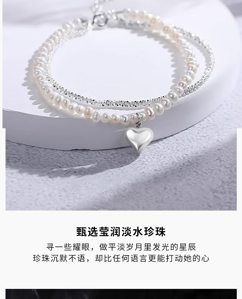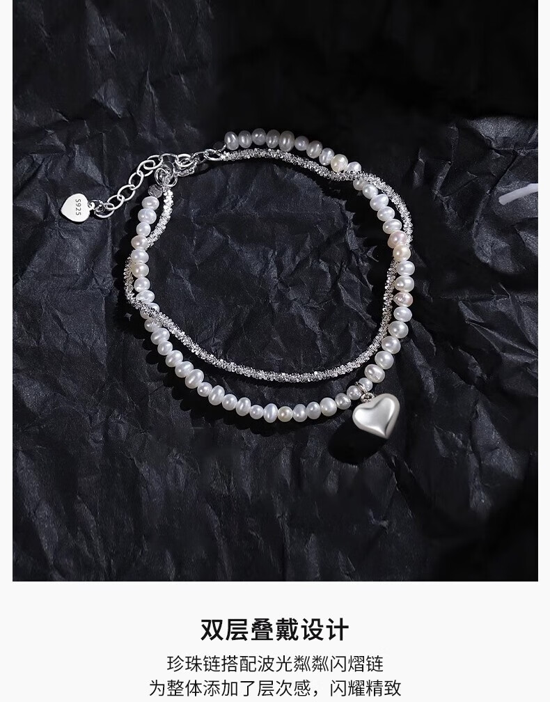 CHINA GOLD Broken Silver Pearl Bracelet Women's Natural Sterling Silver Bracelet Birthday Gift for Girlfriend and Wife Wedding Anniversary Small Heart Double-Layer Bracelet Brand Gift Box