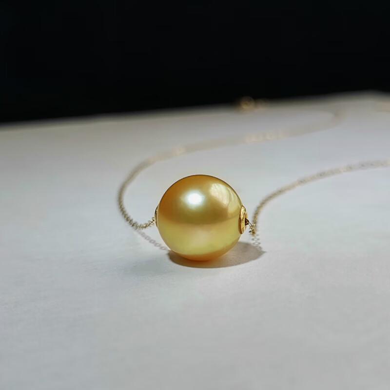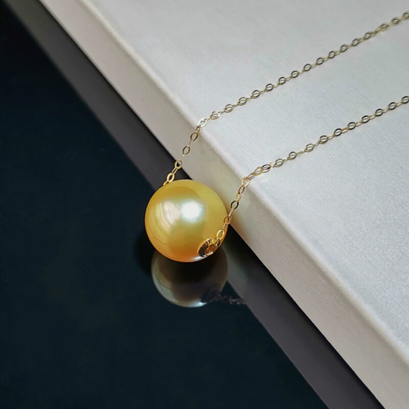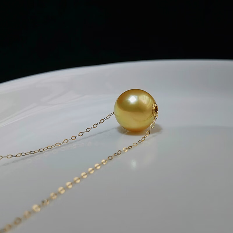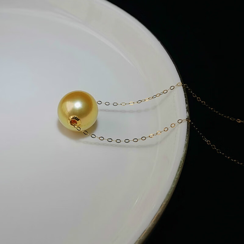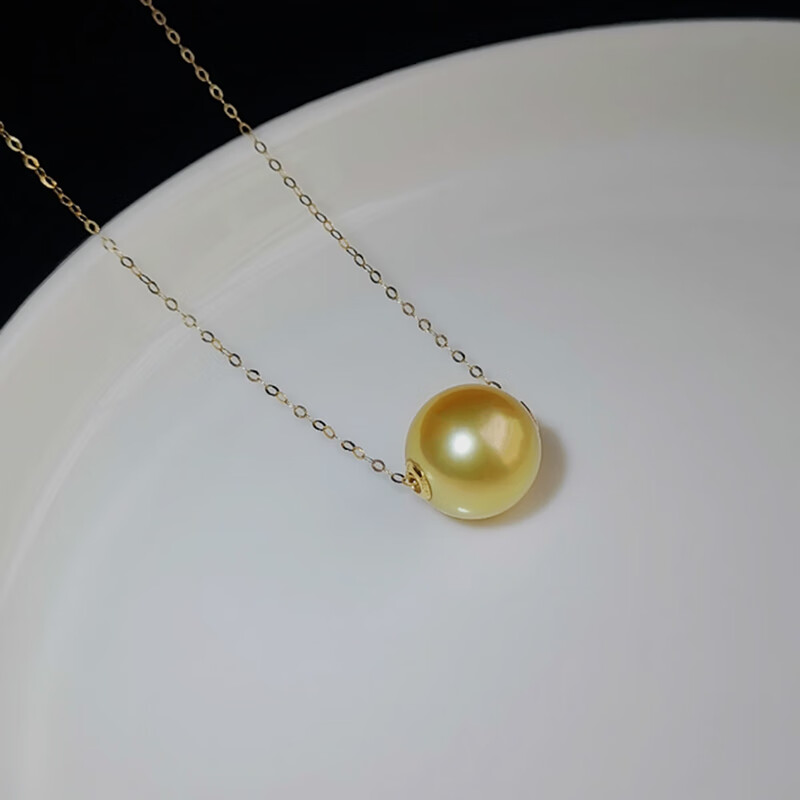 Muqin Nanyang Seawater Philippine Gold Bead Quality Necklace G18k Gold Deep Gold Passepartout Pendant Clavicle Chain Mother's Style 9-10mm Almost Flawless (Including Chain)