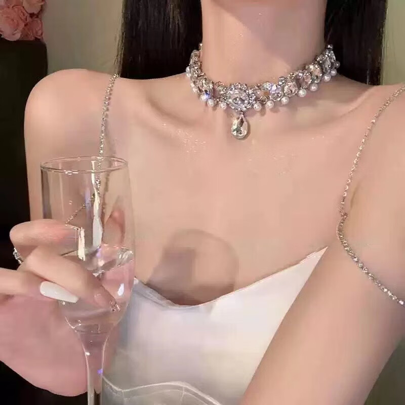 Pei Liang Sparkling Diamond Pearl Necklace Women's Light Luxury Niche High-Quality Exaggerated Dress Clavicle Chain Rhinestone Necklace Bridal Accessories Light Luxury Necklace Water Drop Style