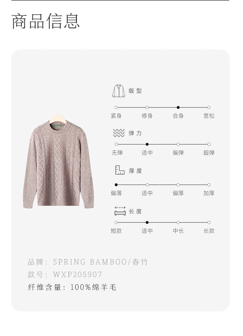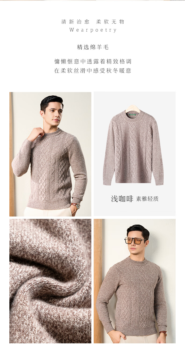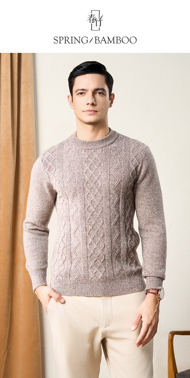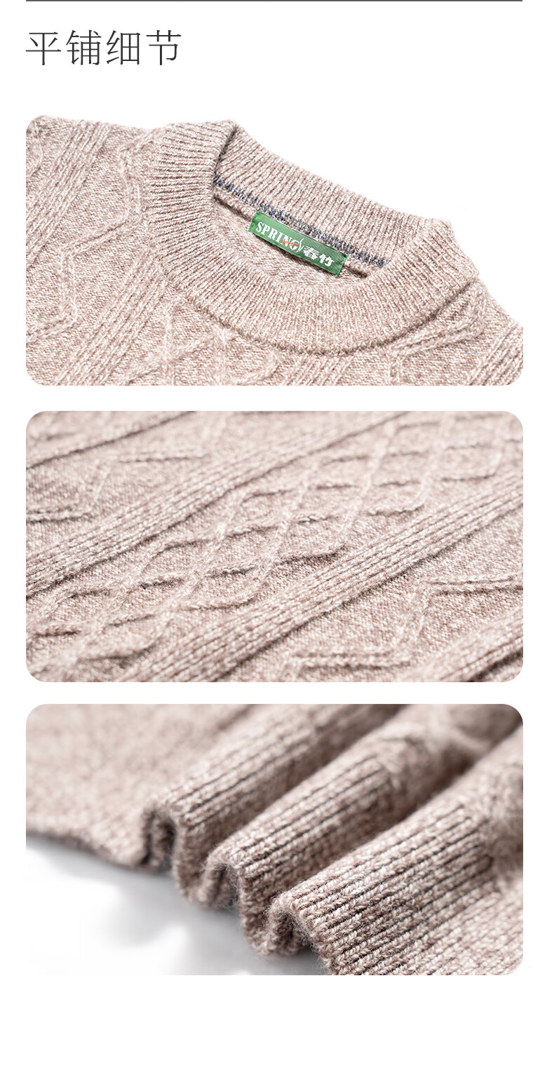 春竹羊毛衫男士圆领春季100%纯羊毛保暖针织毛衣中青年羊毛衫 浅咖啡 L (110CM)