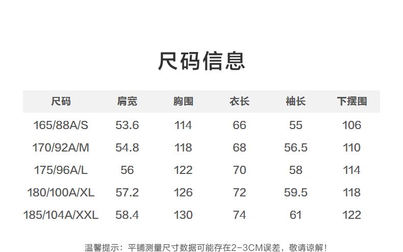 China (cm) 165 / 88-90 170 / 96-98 175 / 108-110 180 / 118-122 185 / 126-130