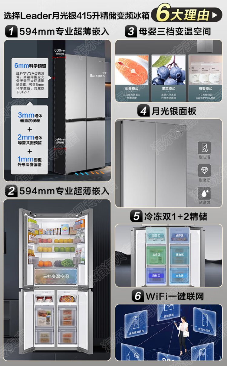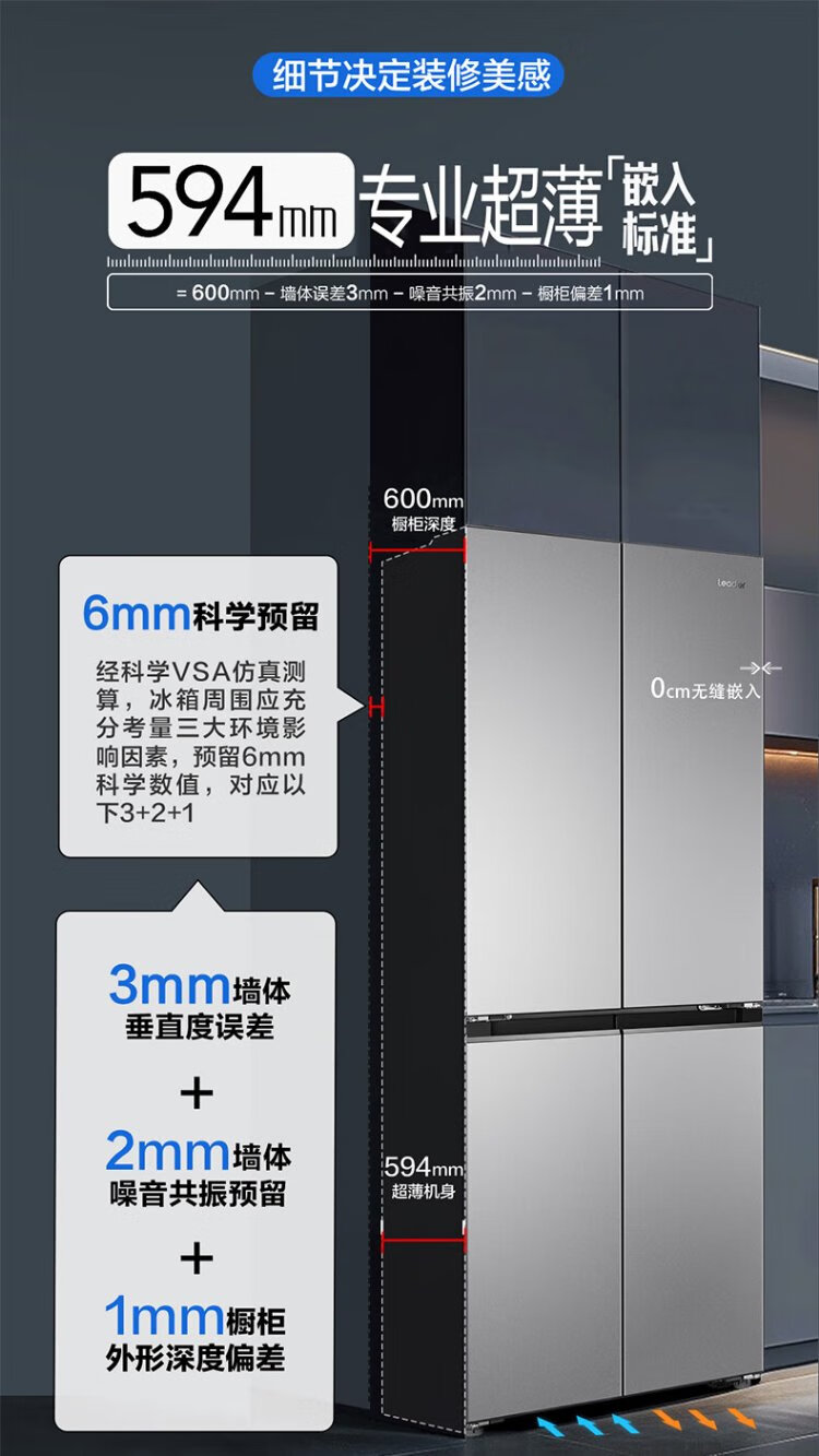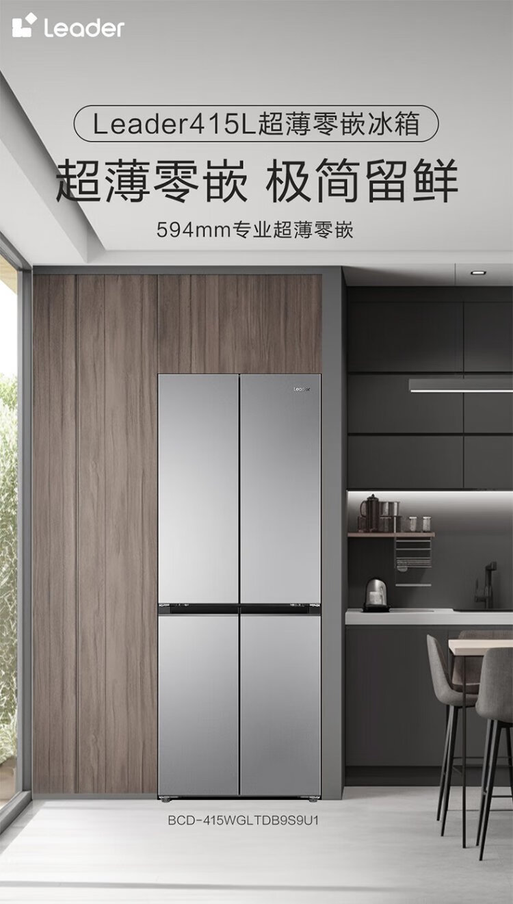 Leader refrigerator produced by Haier 415 liters ultra-thin zero-embedded cross-door four-door double-door first-class energy efficiency dual-frequency air-cooled frost-free household refrigerator flagship leader 594mm ultra-thin zero-embedded + first-class dual frequency + black gold purification + three-speed temperature change
