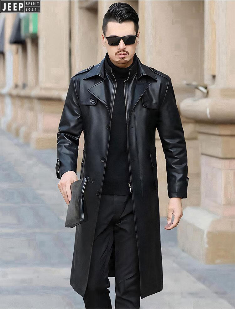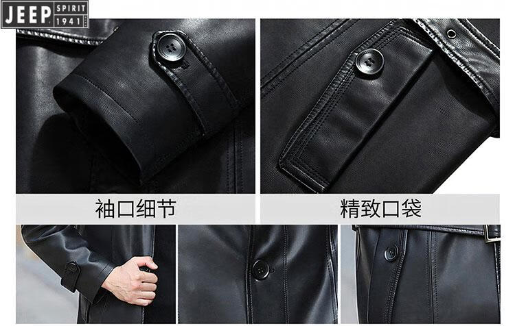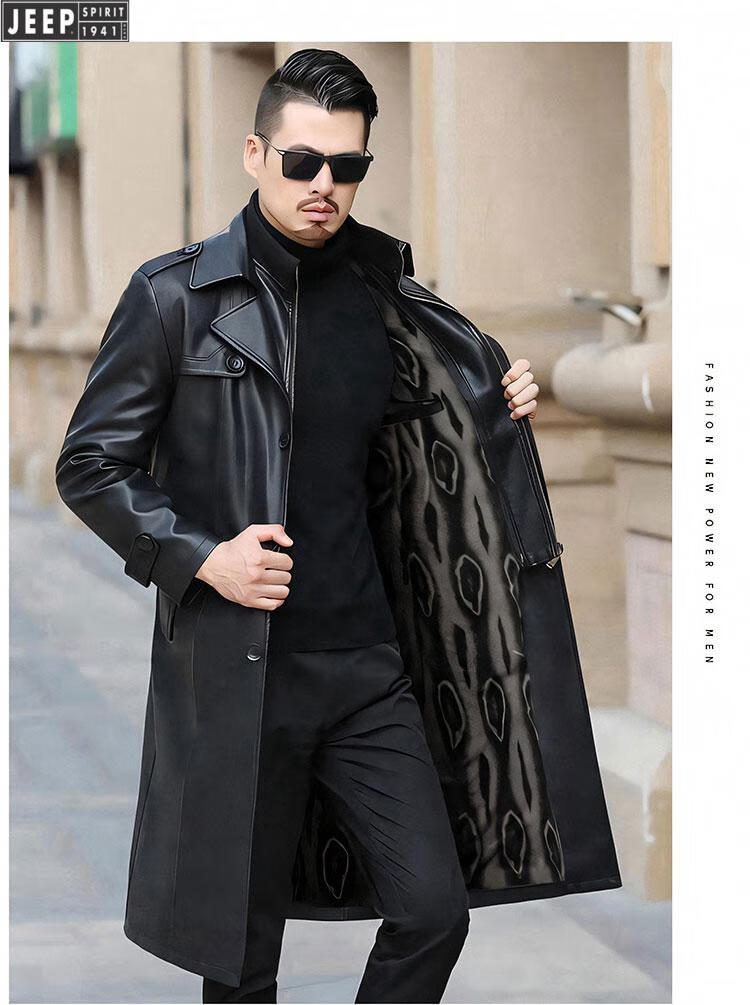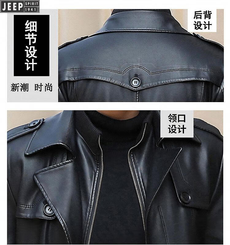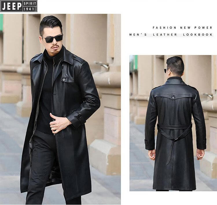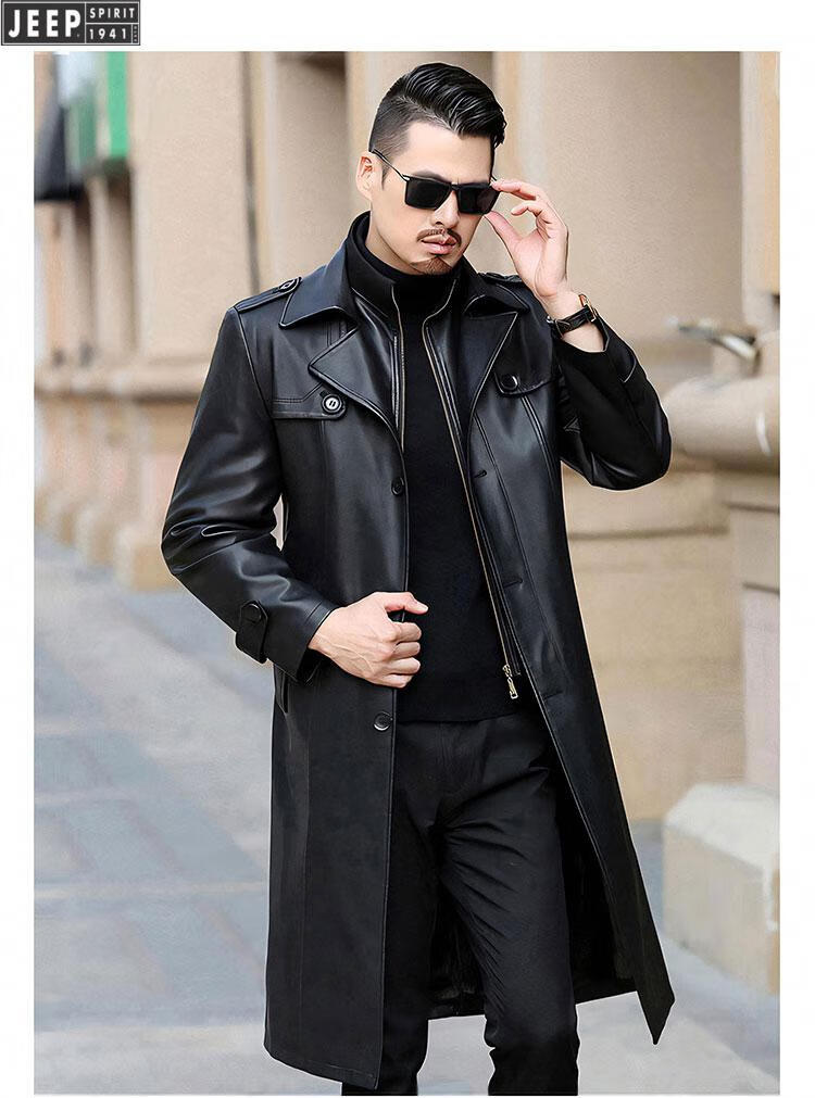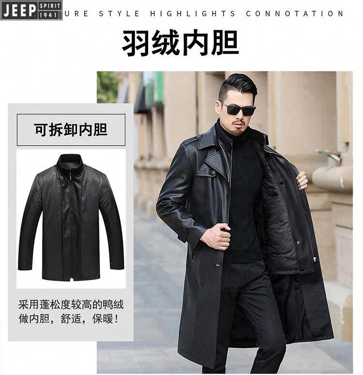 JEEP SPIRIT long knee-length leather jacket for men, down-lined leather windbreaker, winter jacket, sheepskin coat, genuine leather down jacket, plus fleece, detachable inner collar and inner placket, 5XL/200 size