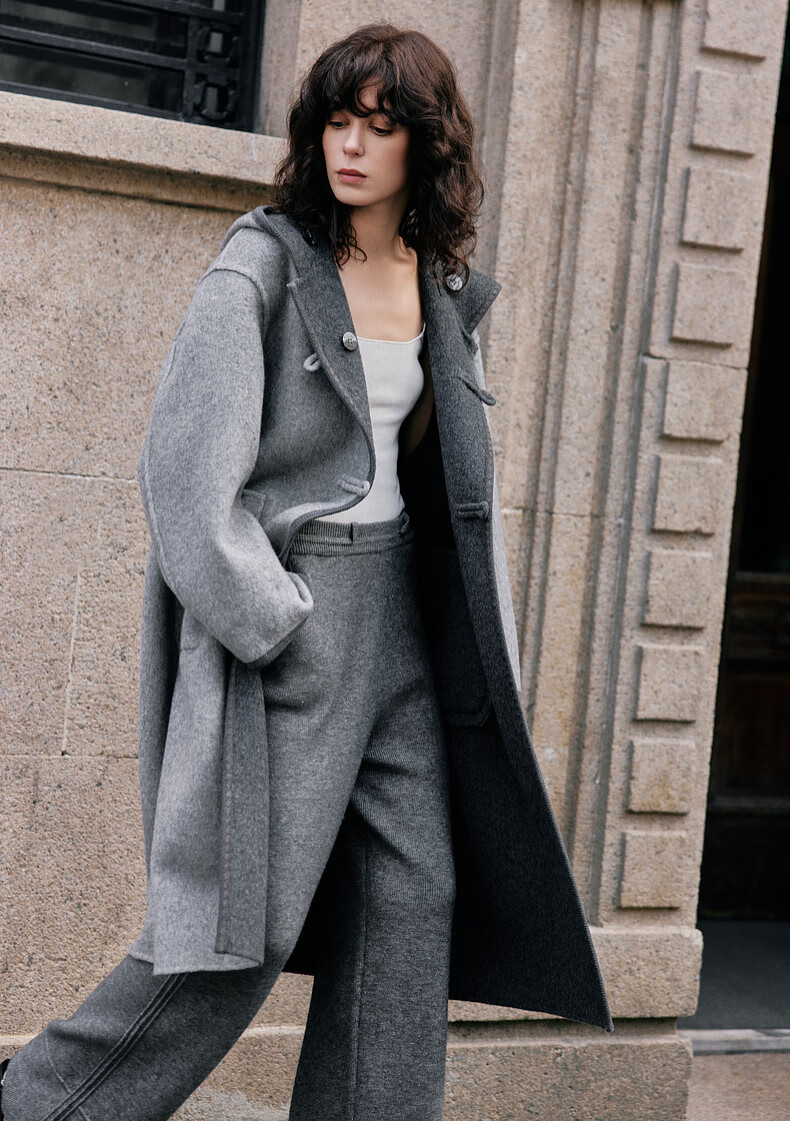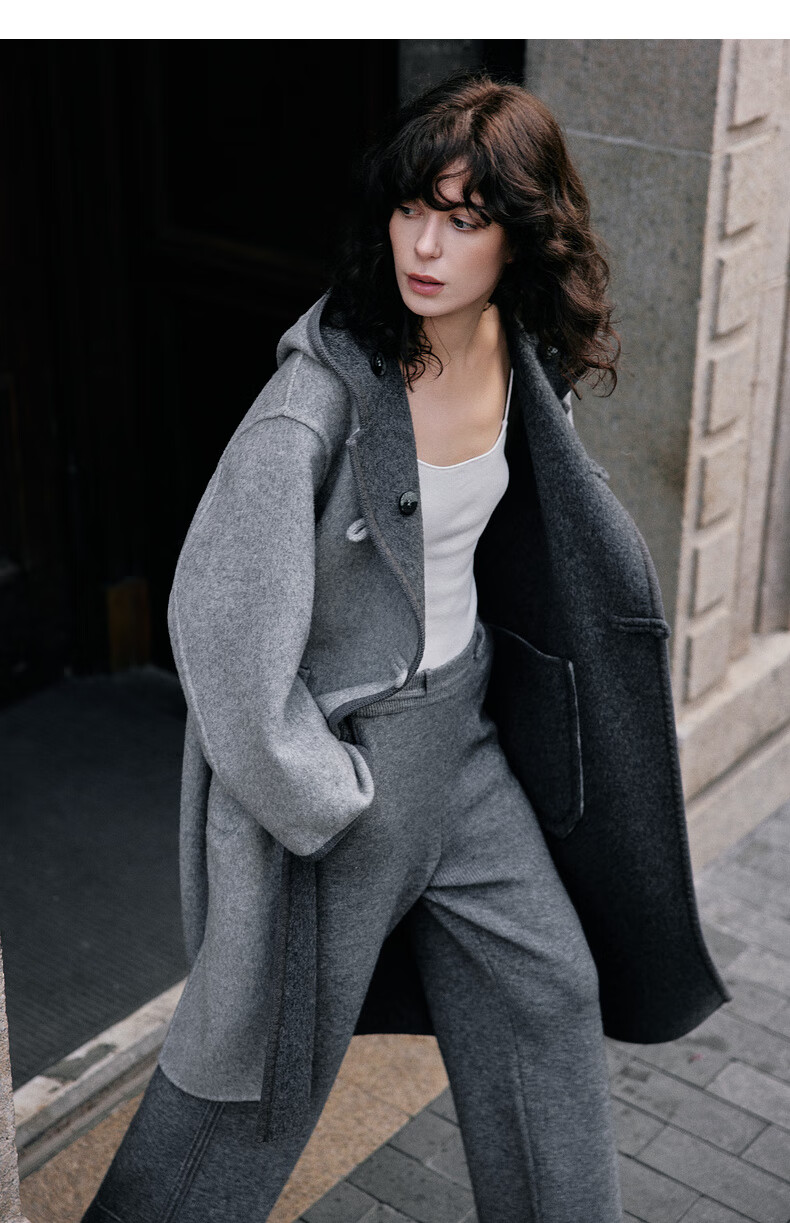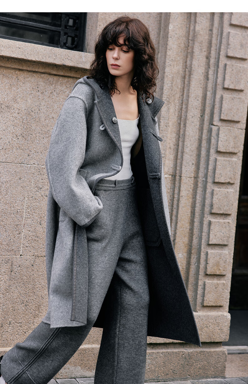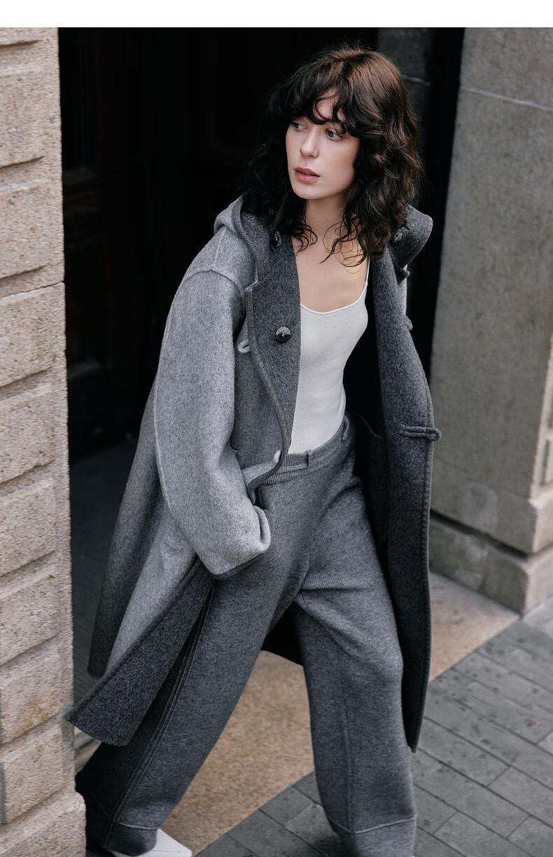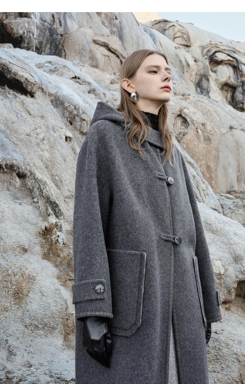 ELLE 100% sheep wool gray hooded woolen coat for women 2025 winter new long wool coat medium gray M