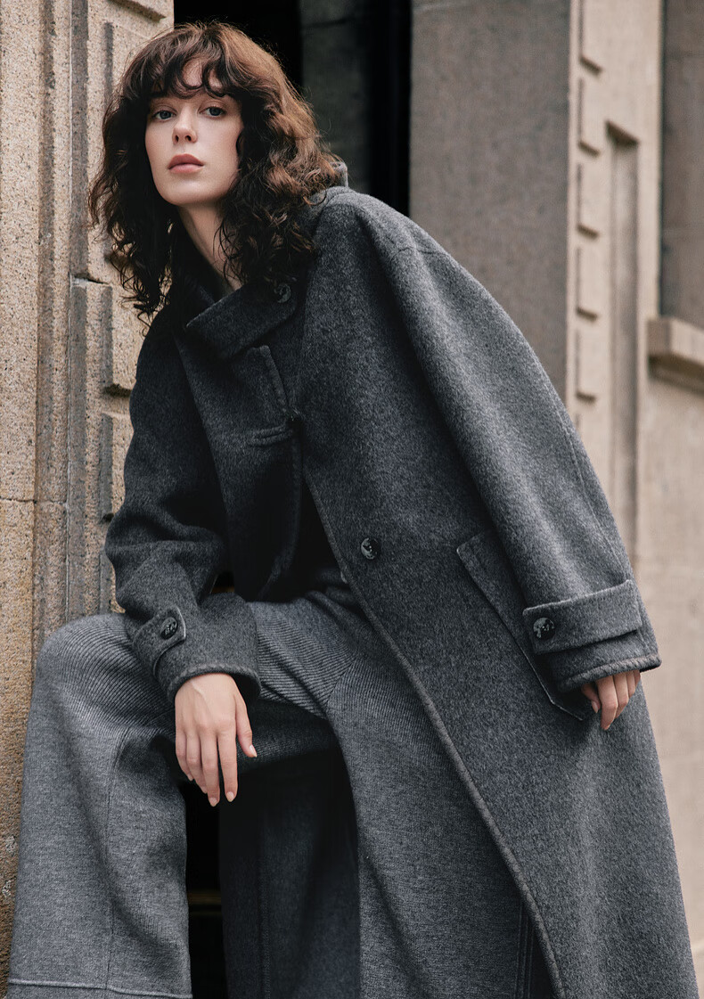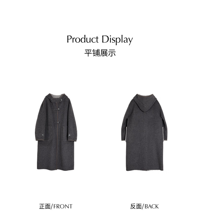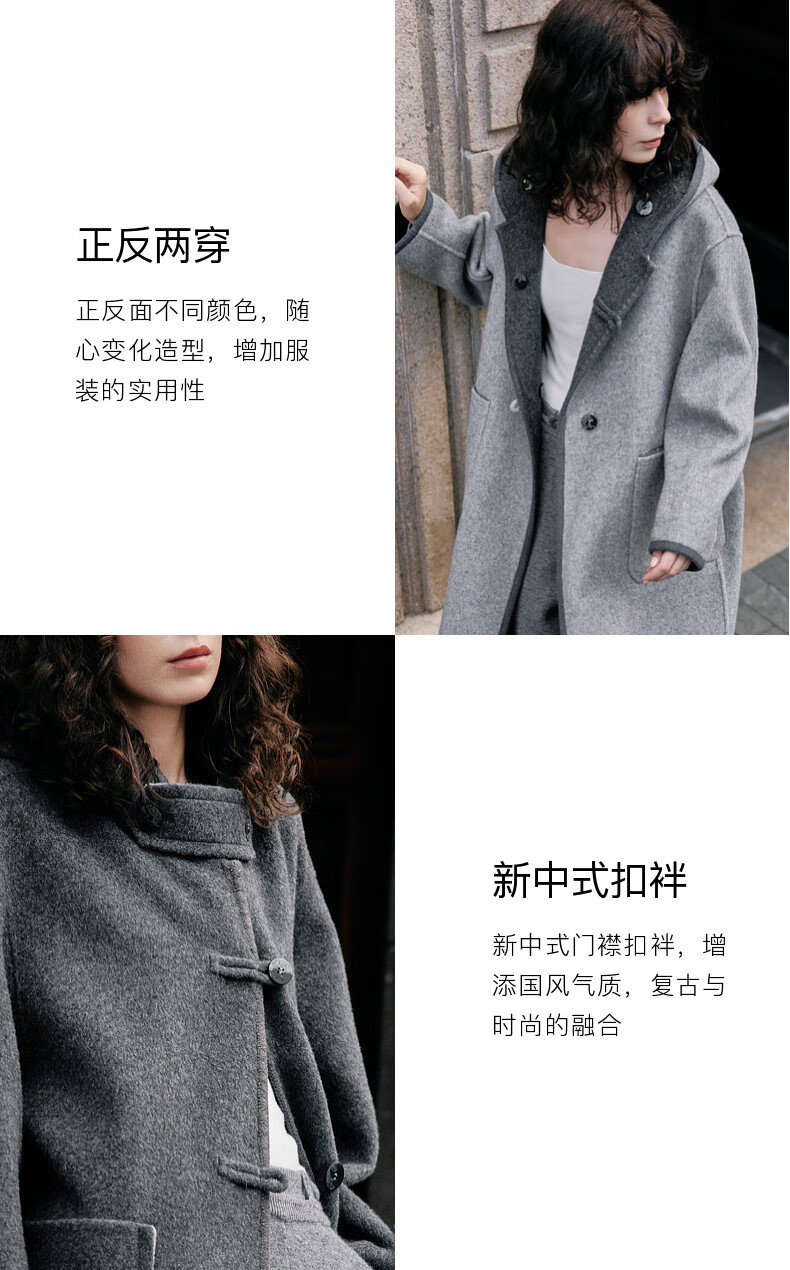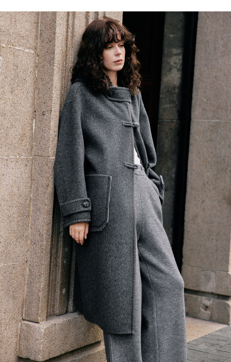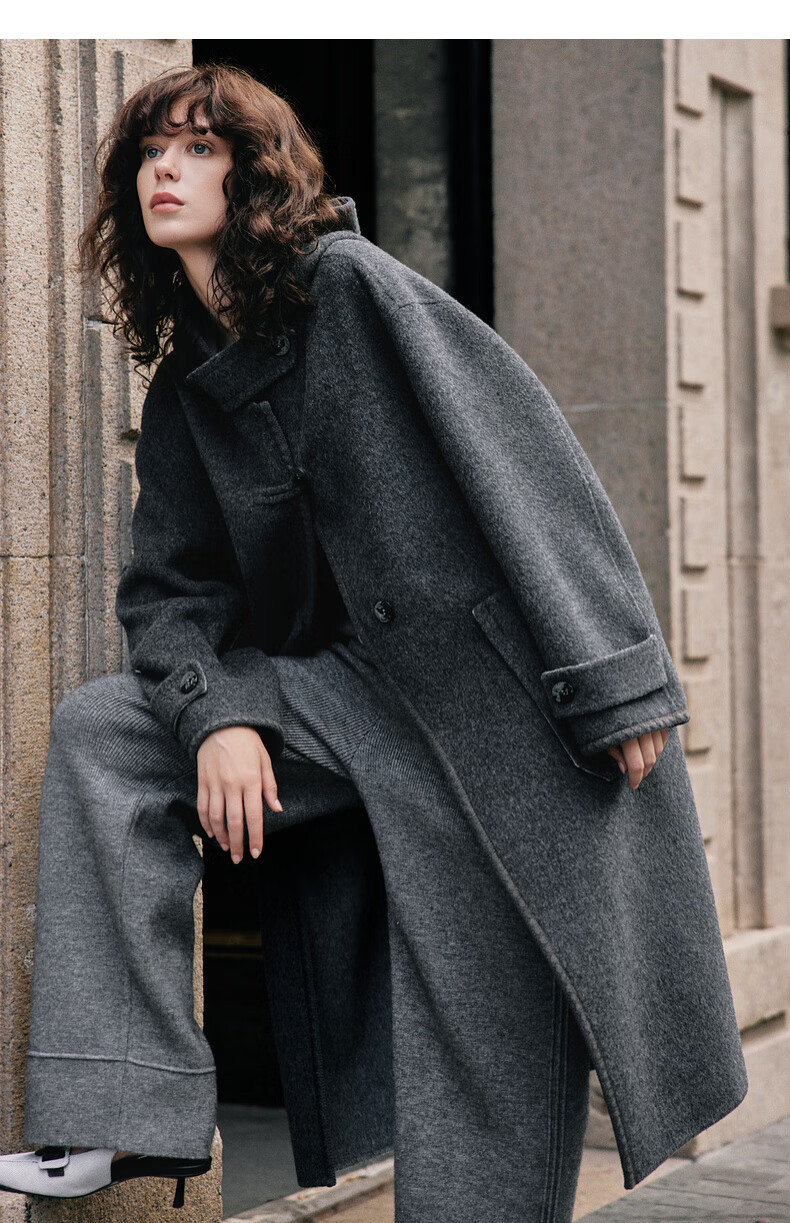 ELLE 100% sheep wool gray hooded woolen coat for women 2025 winter new long wool coat medium gray M