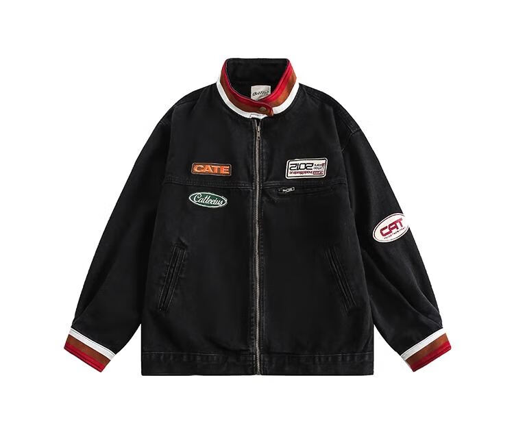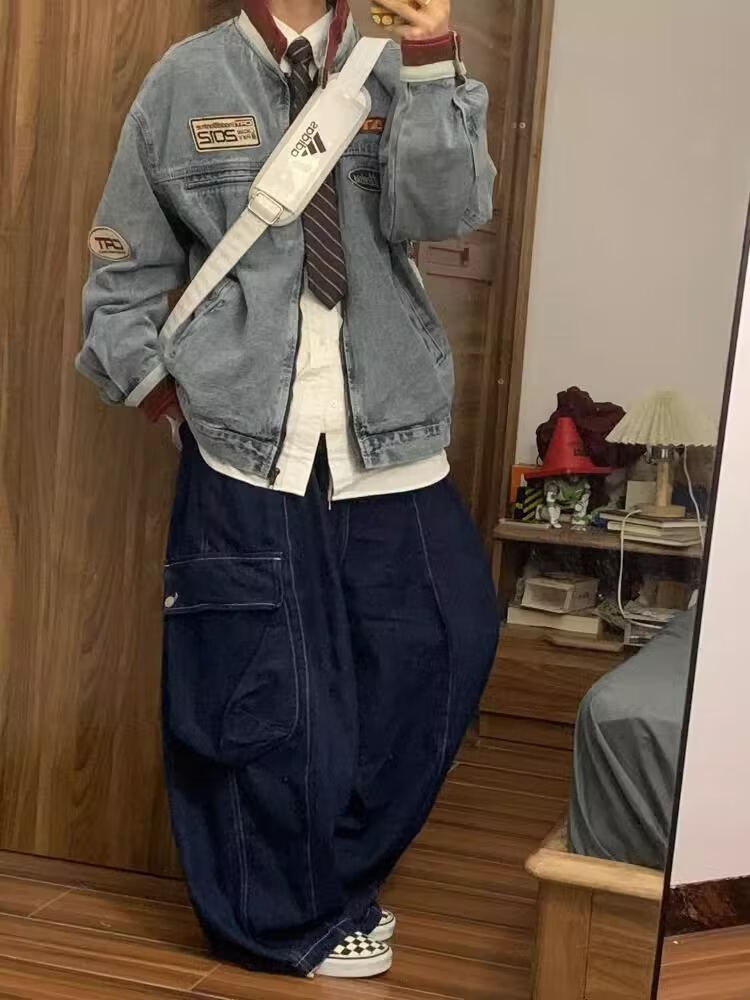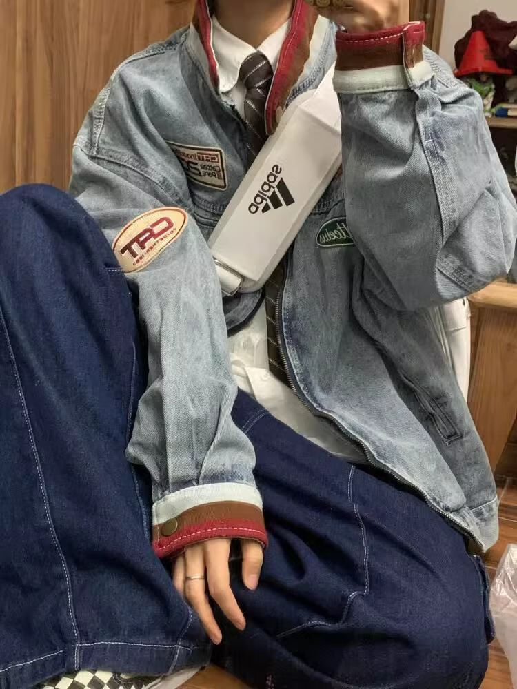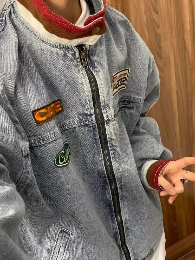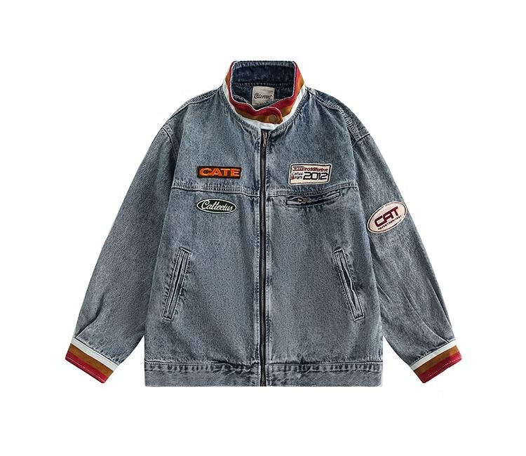Poke American Motorcycle Denim Jacket Men's Spring and Autumn New High Street Fashion Brand Label Retro Loose Casual Jacket Blue XL 135-150Jin Jin is equal to 0.5 kg
