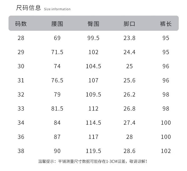 Outseam (cm) 99 cm 101.5 cm 104 cm 106.5 cm 109 cm