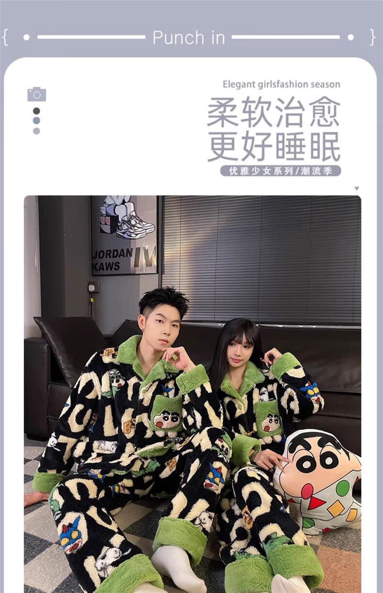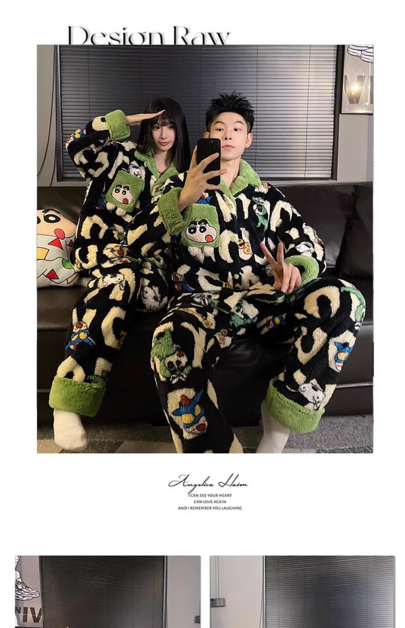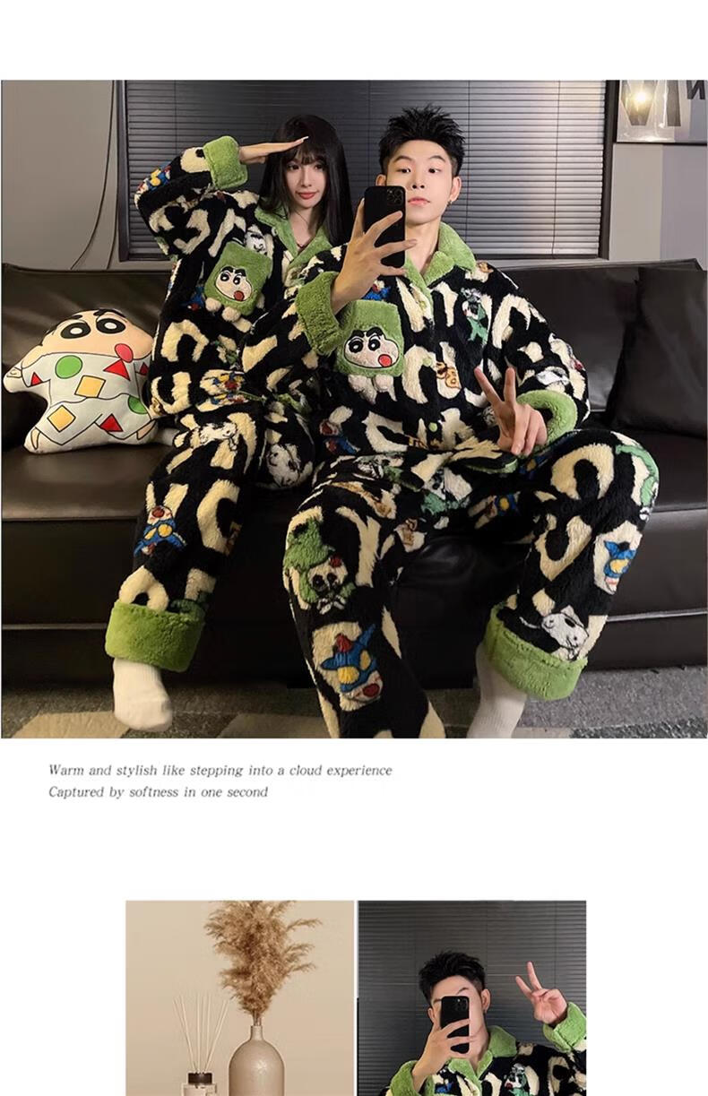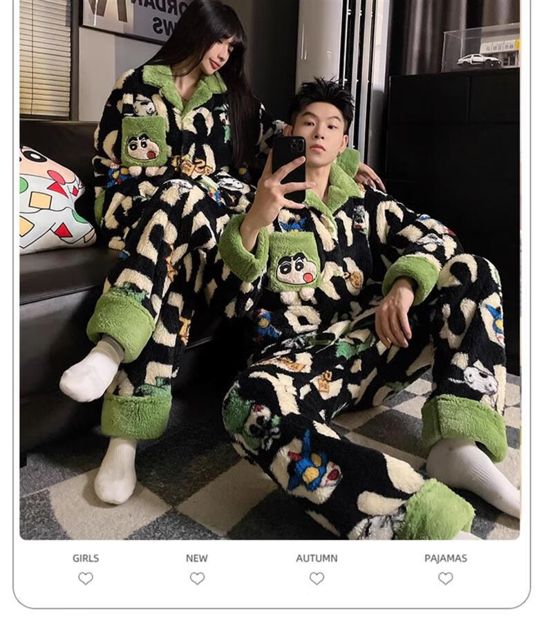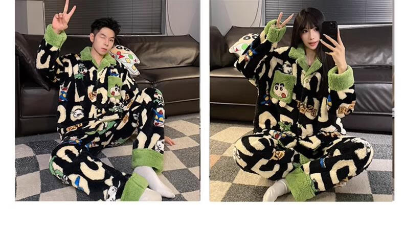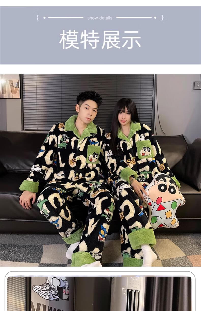 Mengdong Crayon Shin-chan Couple Pajamas for Men and Women Winter Coral Velvet Cute Cardigan Internet Celebrity Style Flannel Home Clothing Set KYX-A59904 XL Men's Style (Recommended 120-145 Jin Jin equals 0.5 kg)