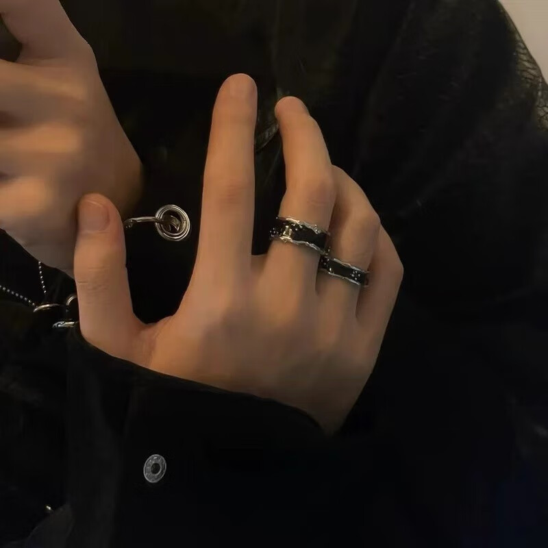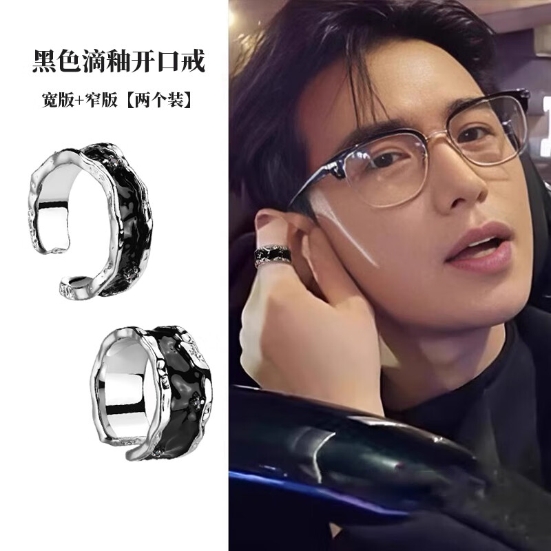 Meng Keduo black rhinestone drip glaze open ring niche design index finger ring couple ring fashion personalized ring men's trendy trendy personalized ring 2 pack