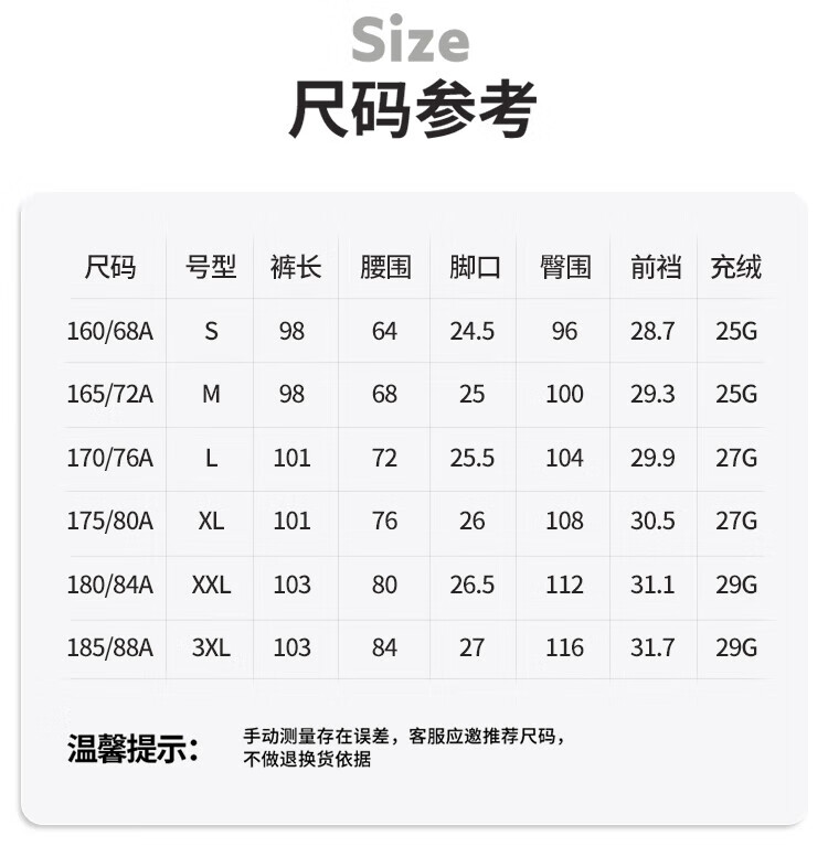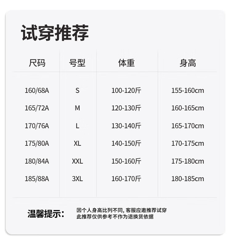 China (cm) 165 / 88-90 170 / 96-98 175 / 108-110 180 / 118-122 185 / 126-130