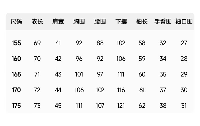 China (cm) 160-165/84-86 165-170 / 88-90 167-172 / 92-96 168-173 / 98-102 170-176 / 106-110