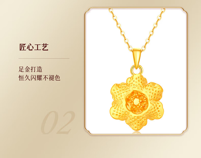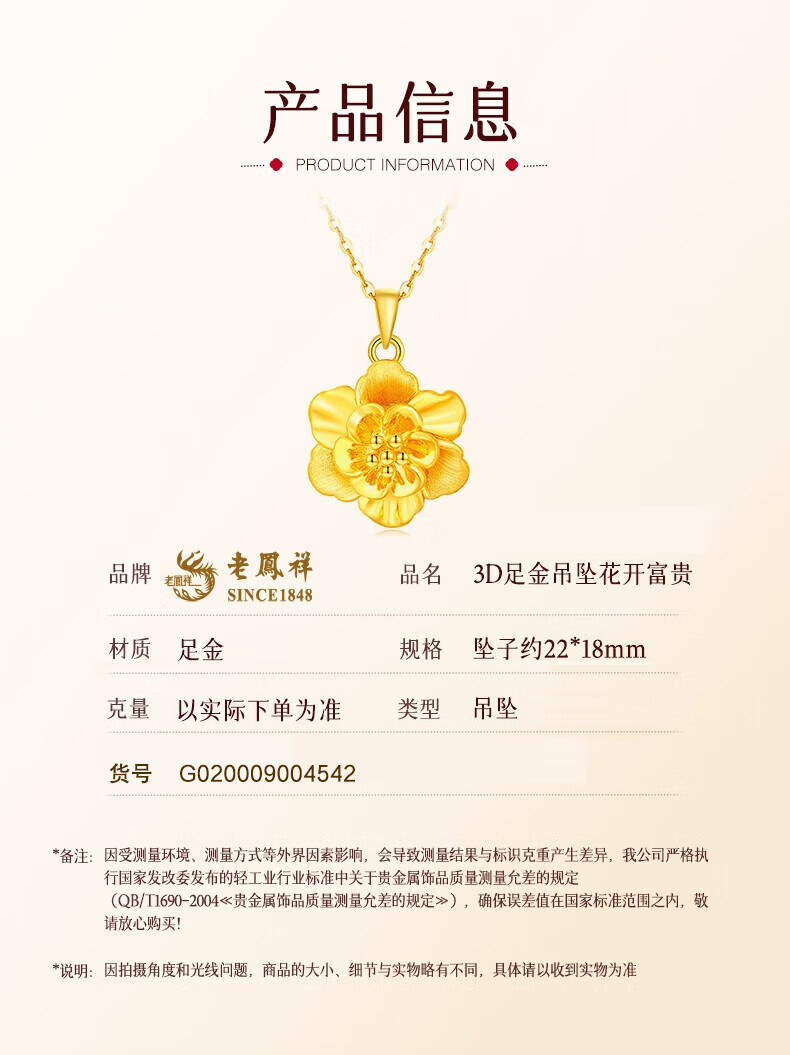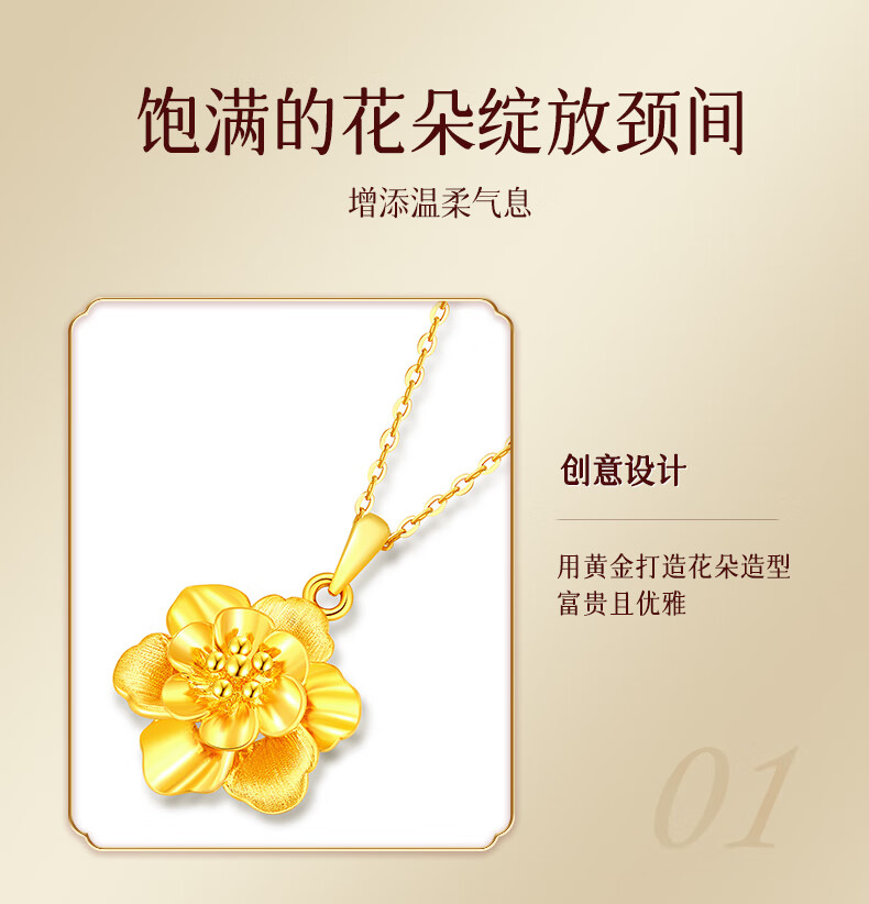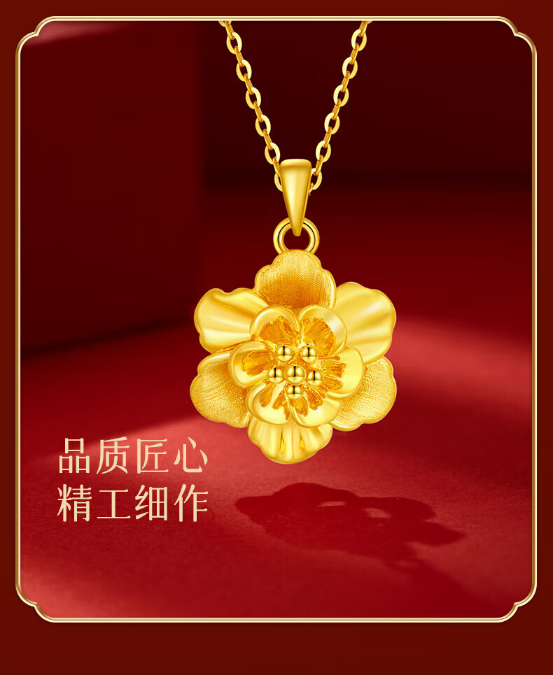 Lao Fengxiang gold necklace, pure gold peony flower pendant, hard gold clavicle chain, birthday gift for wife, girlfriend and best friend. The gold pendant weighs about 1g + comes with a 925 silver chain and comes with a brand gift box.