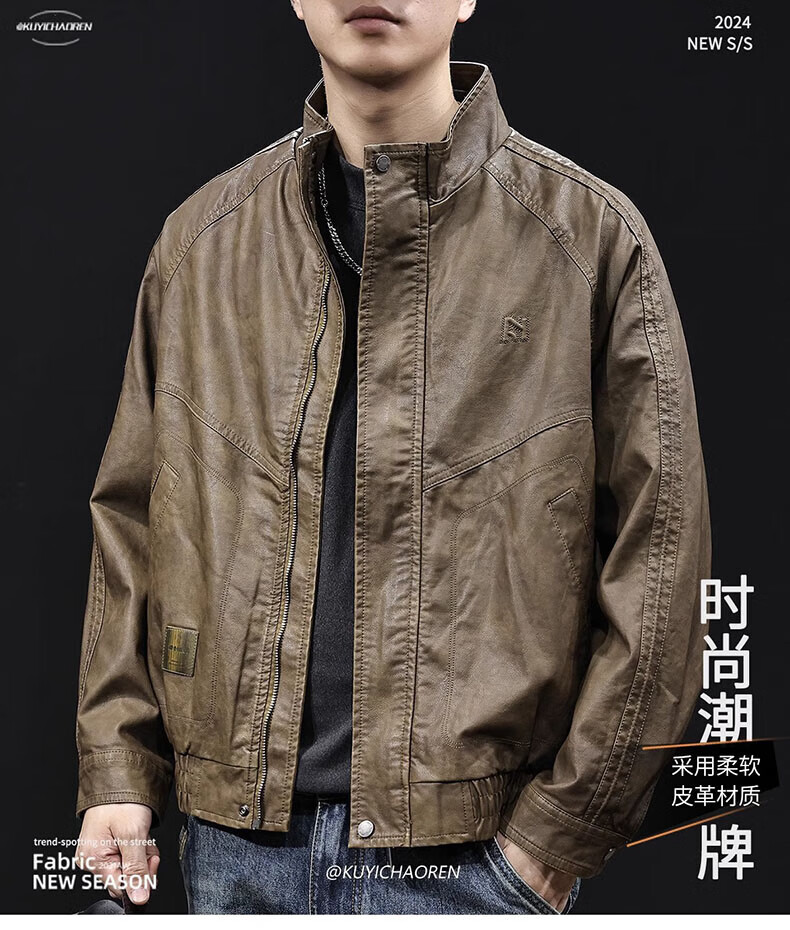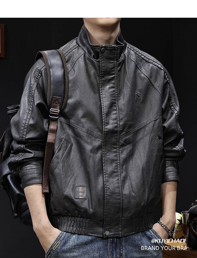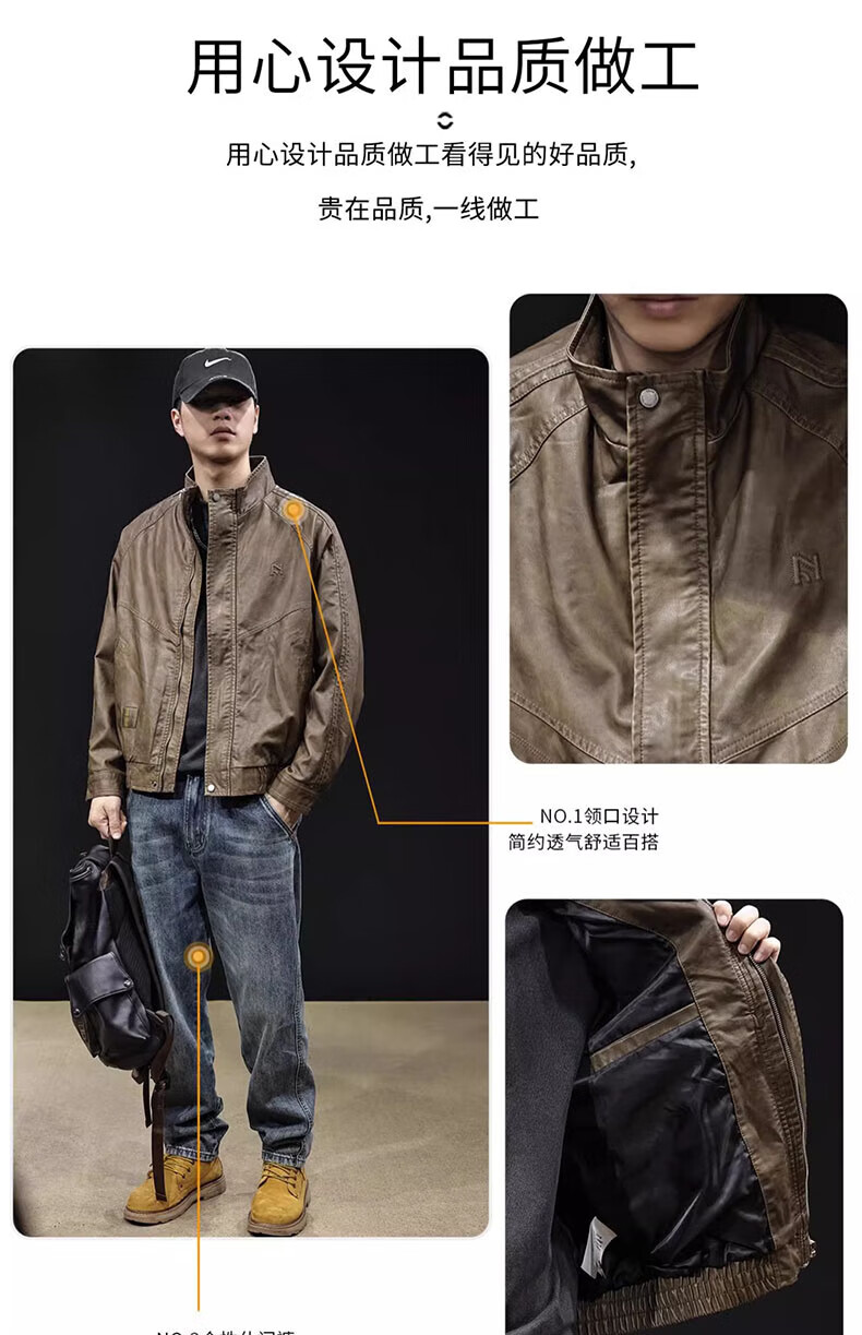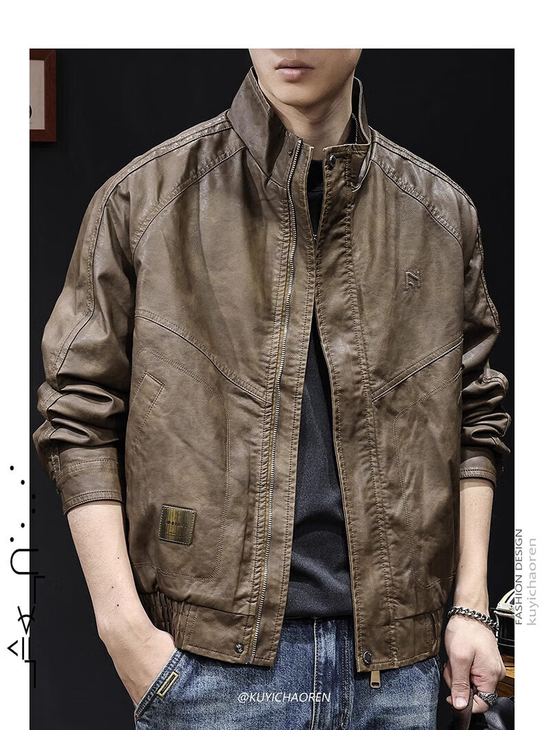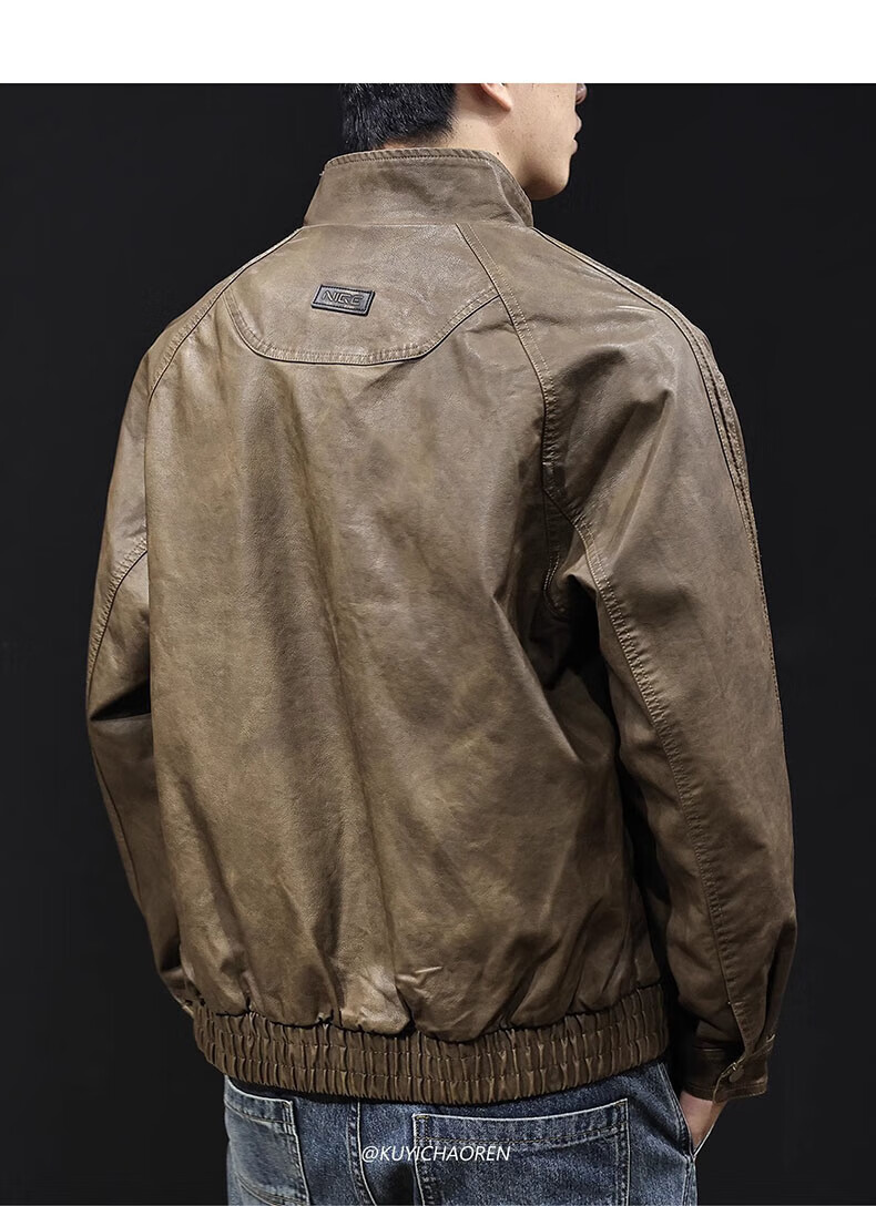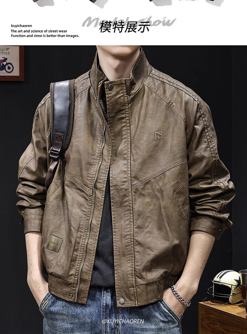 Lexin trendy high-end stand-collar motorcycle leather jacket for men in autumn and winter new men's velvet large size American retro trendy brand tops brown velvet thickened 3XL 180-200Jin Jin is equal to 0.5 kg