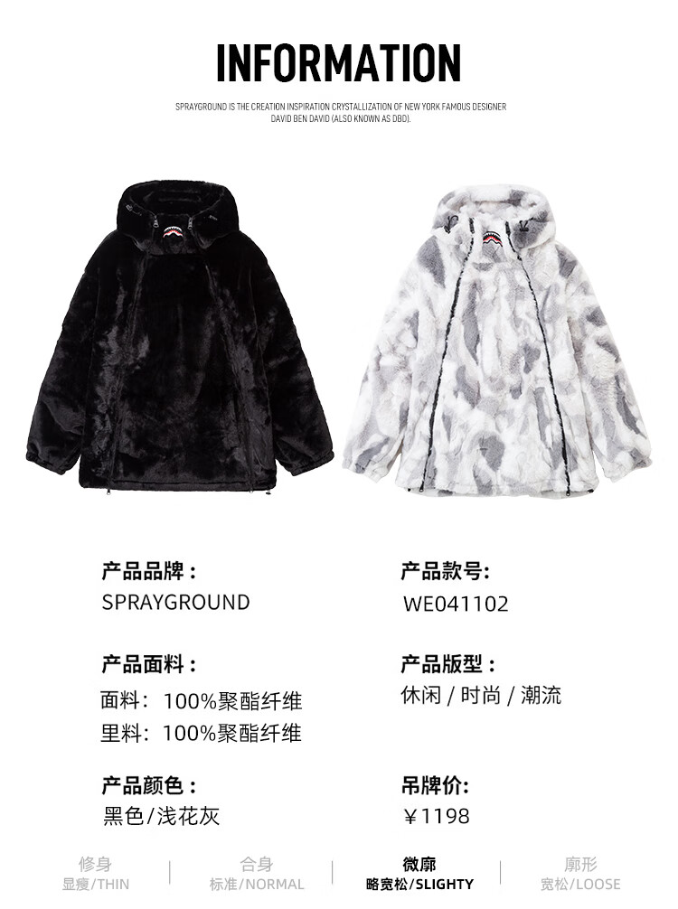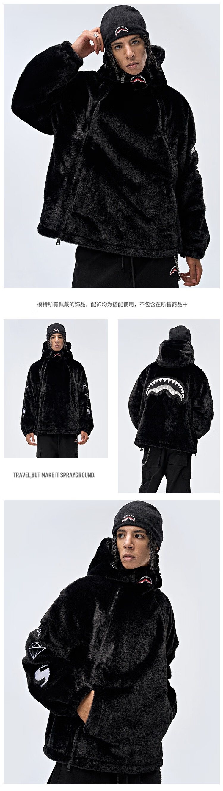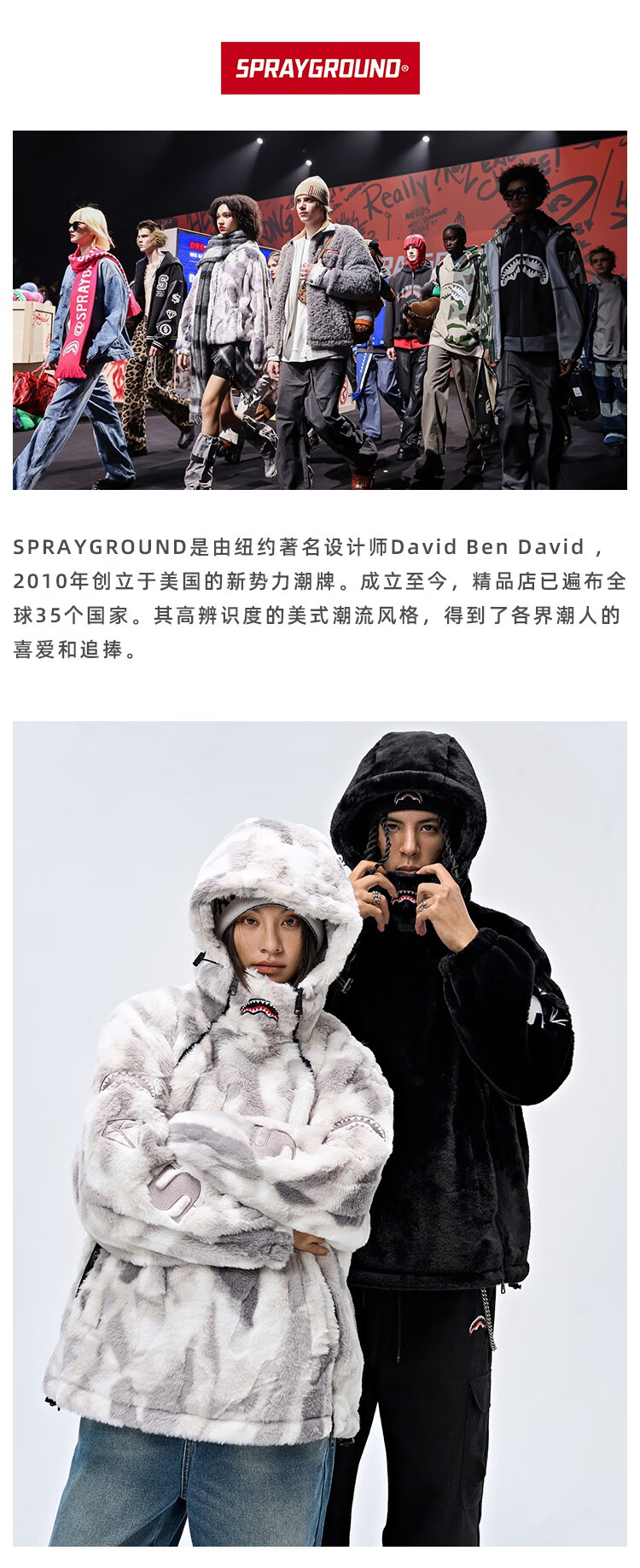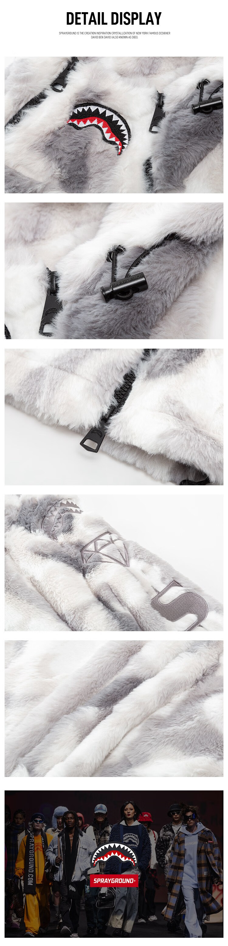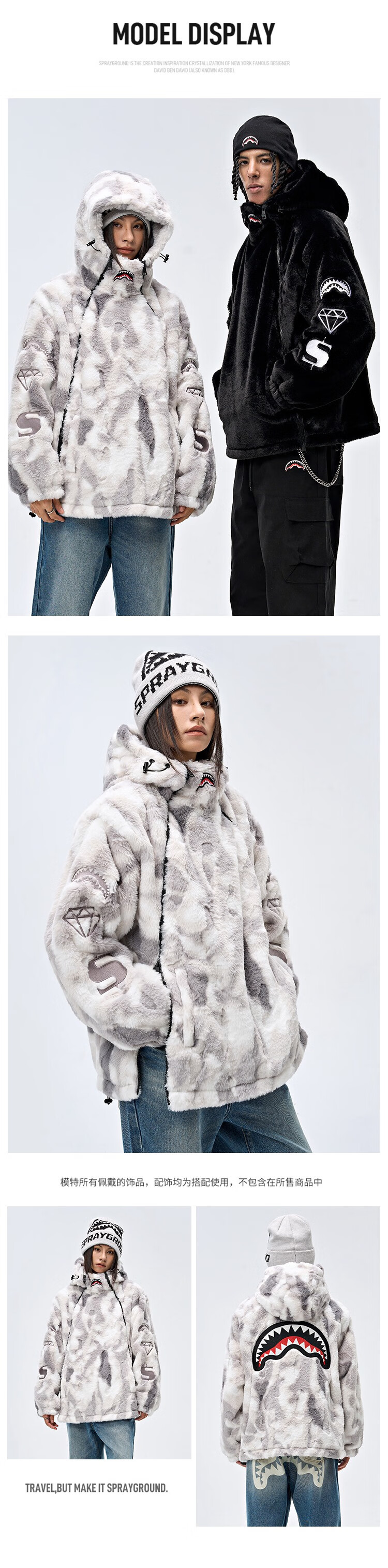 SPRAYGROUND2025 winter full-print shark mouth thickened fur coat for men and women double zipper hooded cotton coat light gray L