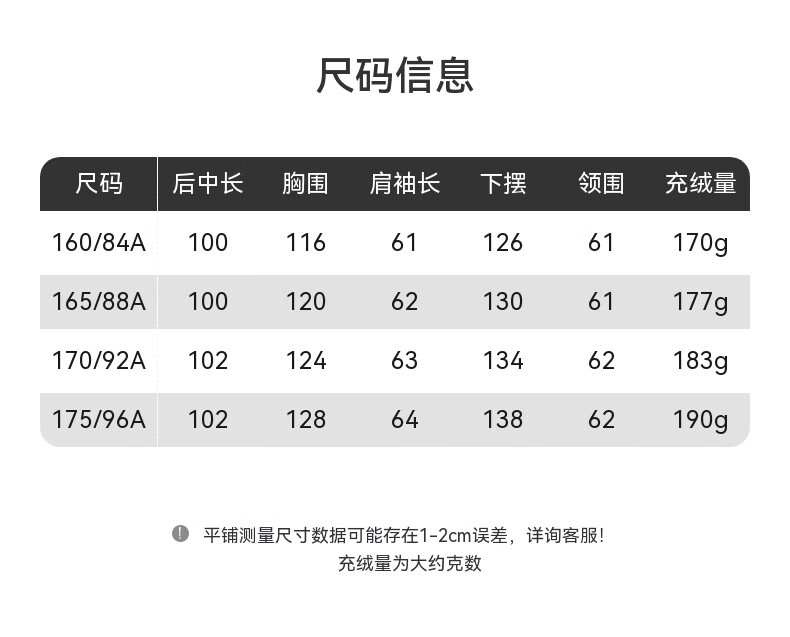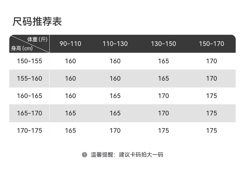 China (cm) 160-165/84-86 165-170 / 88-90 167-172 / 92-96 168-173 / 98-102 170-176 / 106-110
