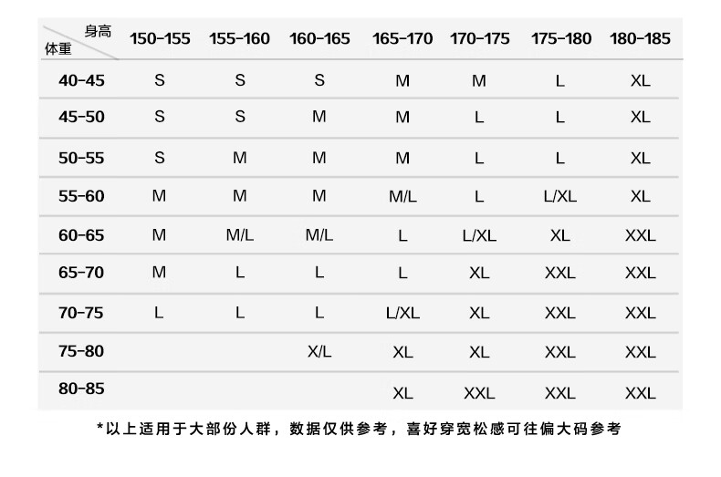 China (cm) 160-165/84-86 165-170 / 88-90 167-172 / 92-96 168-173 / 98-102 170-176 / 106-110