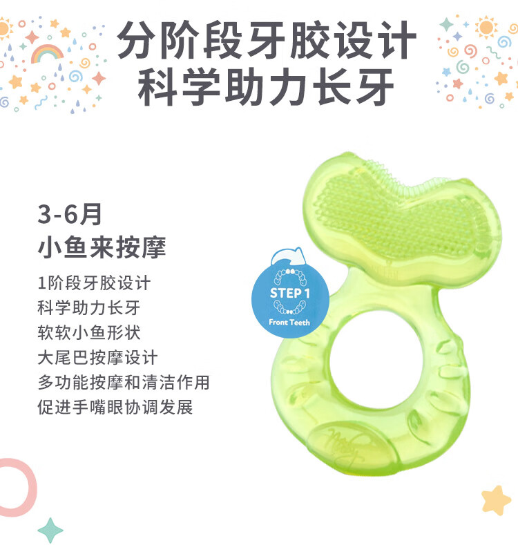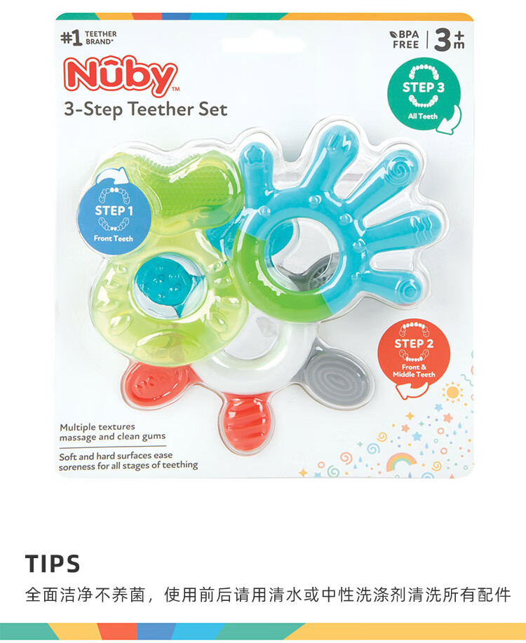 Nuby (Nuby) baby teether, silicone, baby bite, anti-eating hand artifact, molar and teeth fixing device, 3-pack, three-stage teether, 3-pack