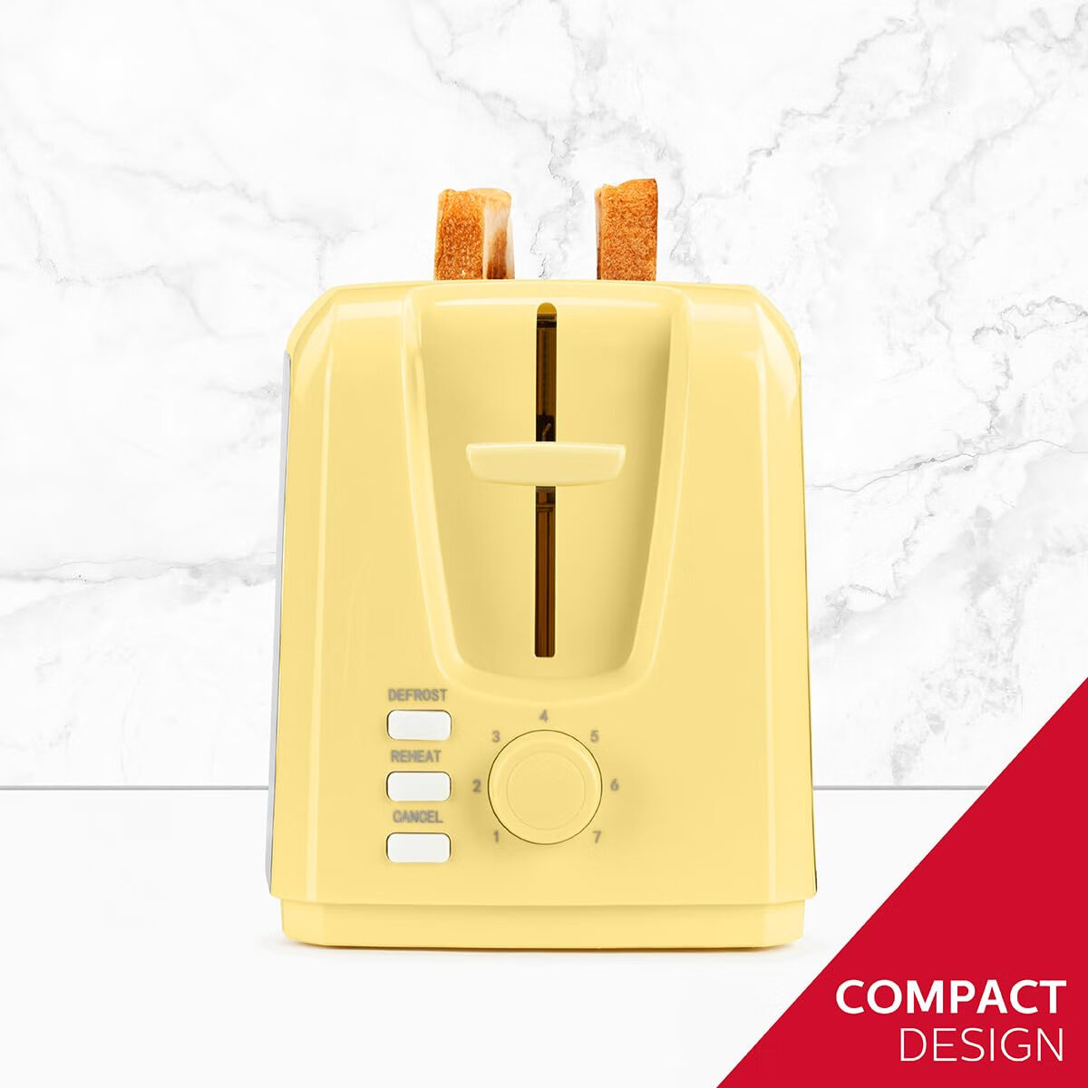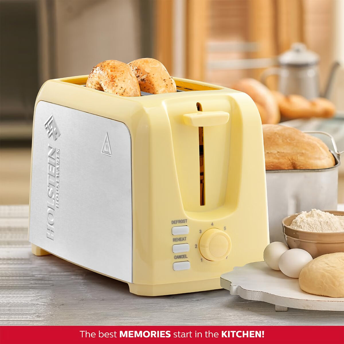 Holstein Housewares Yellow 2-Slice Toaster 7-stage toasting Extra-wide slots Removable crumb tray High lift Defrost function
