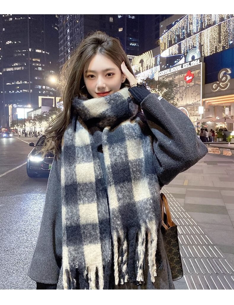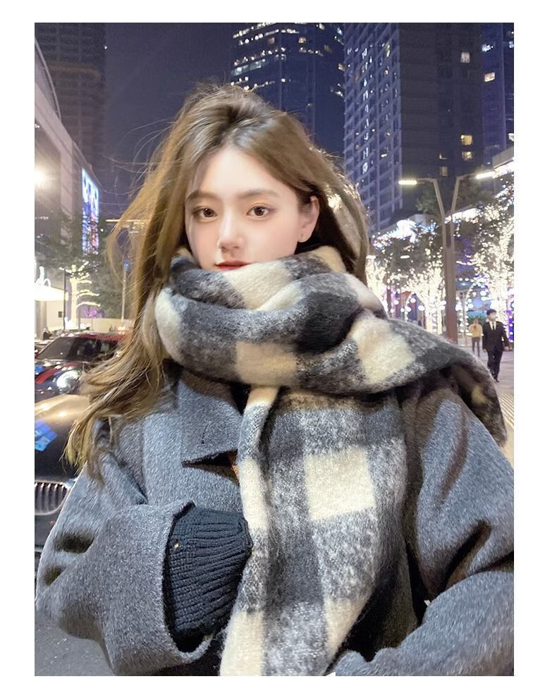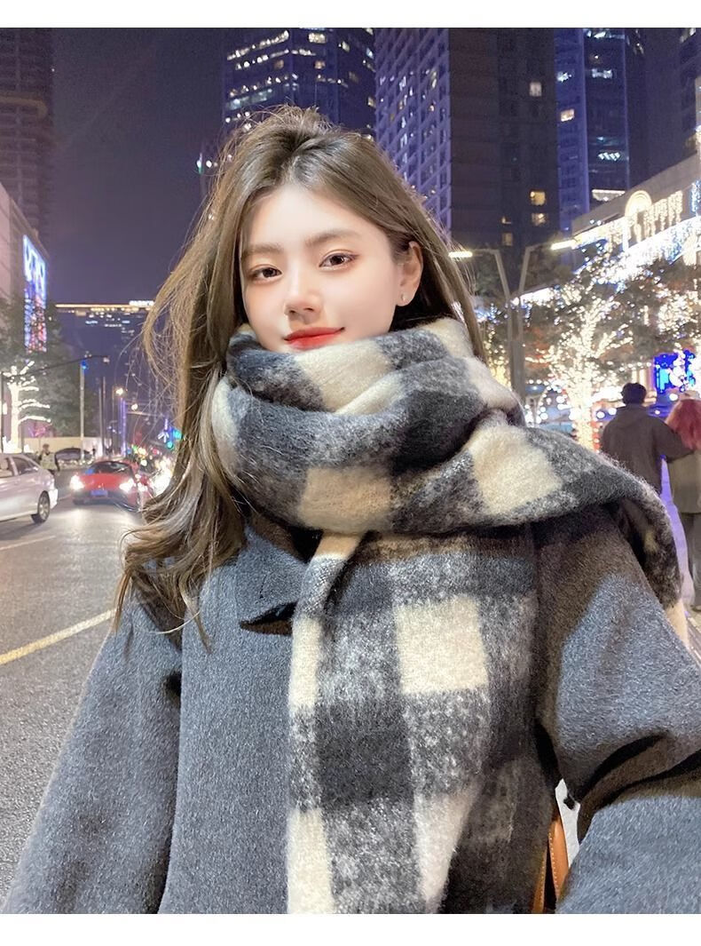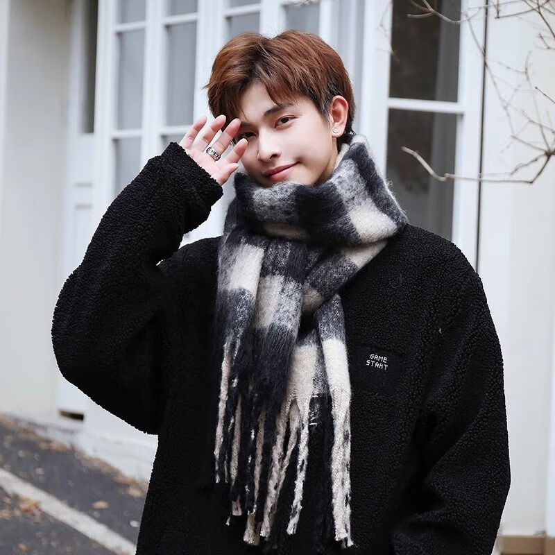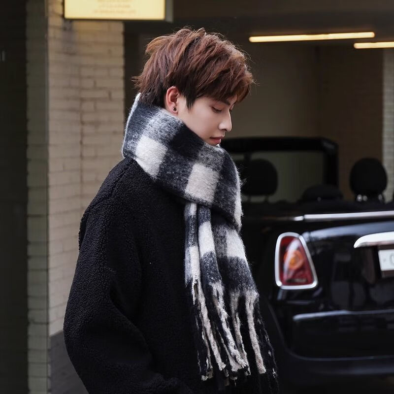 Jinglusi scarf men's winter 2024 new versatile black and white plaid shawl, warm and thick, gift for boyfriend trendy scarf black and white plaid (soft waxy mohair fringed scarf) non-shedding/atmosphere/trend versatile