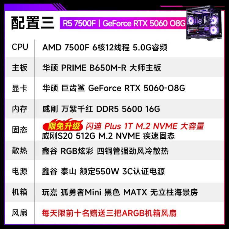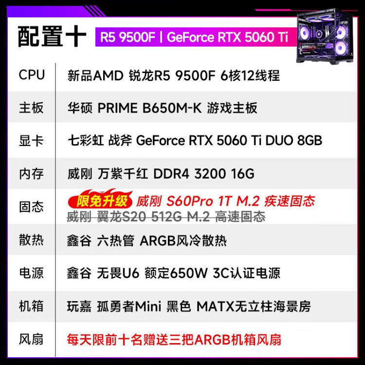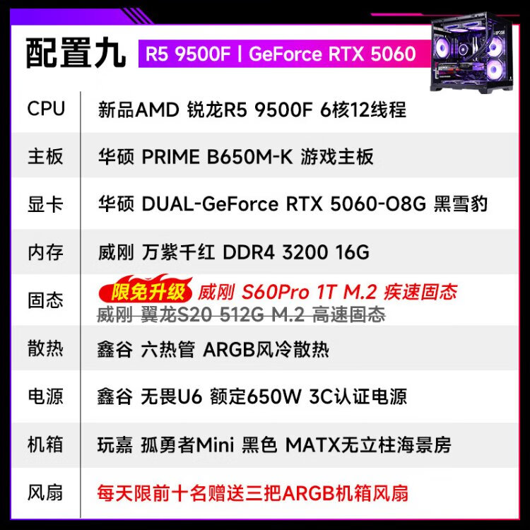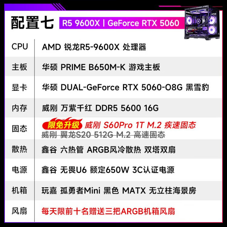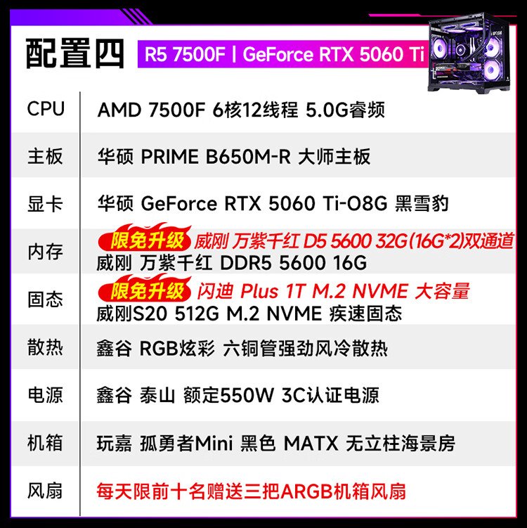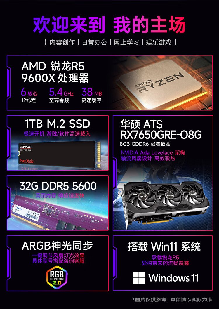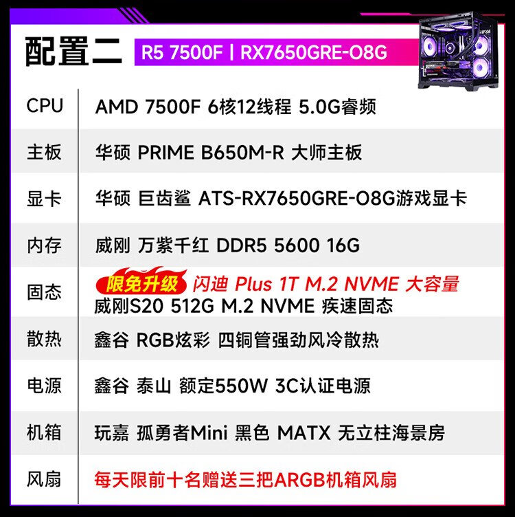 ASUS (ASUS) AMD new Ryzen R5 9500F/7500F/9600X/RX7650GRE/RTX5060/RTX5060Ti gaming desktop computer host assembly Specifications 2丨R5 7500F+7650GRE desktop computer