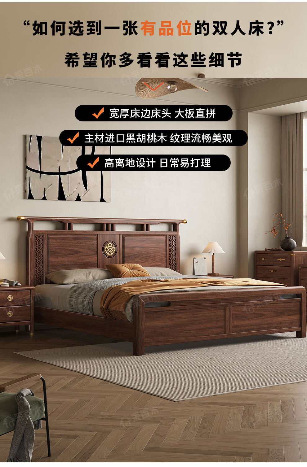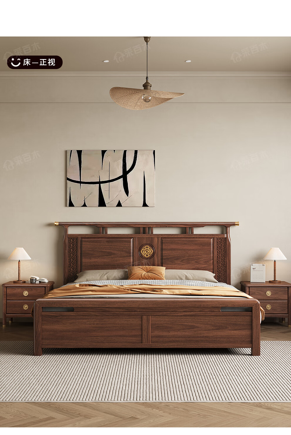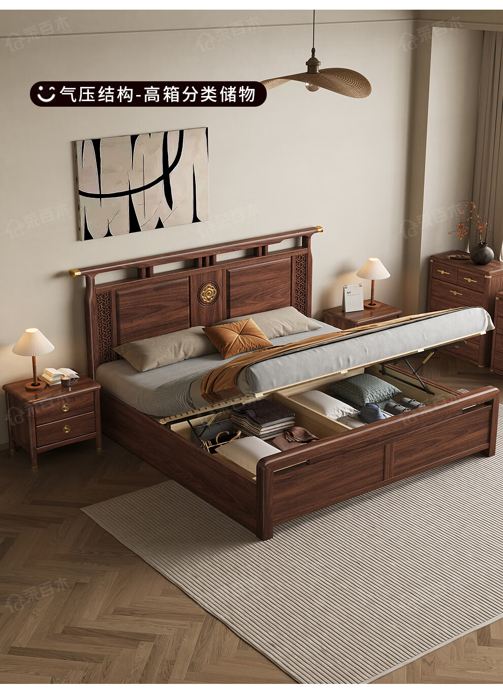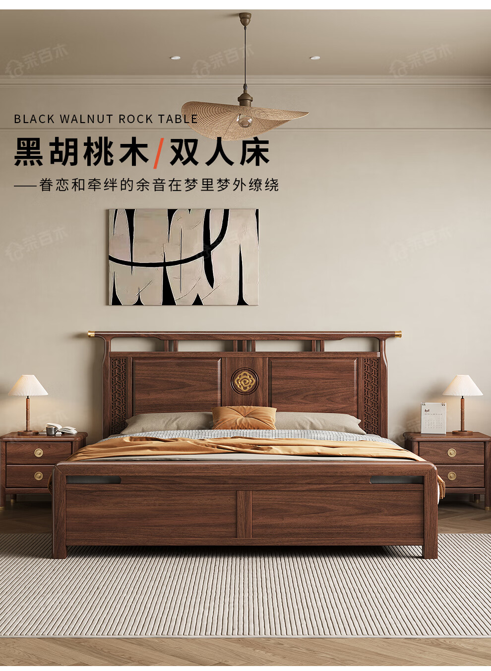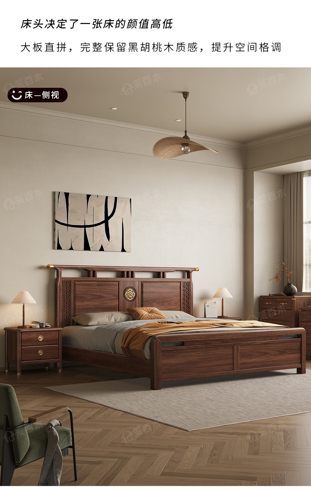 Caibaimu Bed Black Walnut New Chinese Solid Wood Bed Simple Modern Double Bed Master Bedroom Bed High-end Master Bedroom Furniture Bed Bracket Structure 1800*2000mm