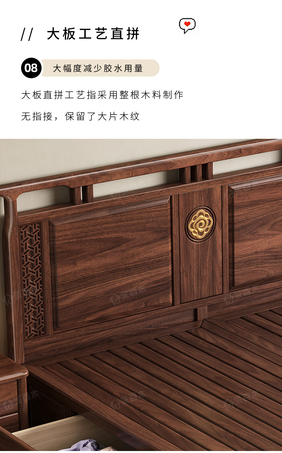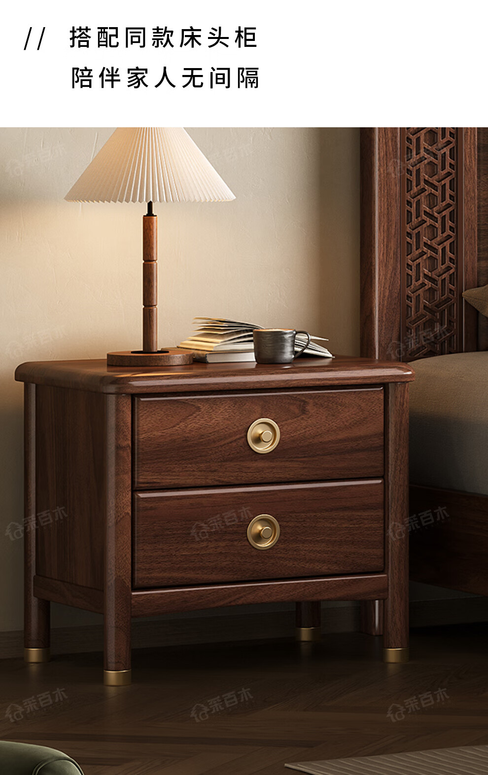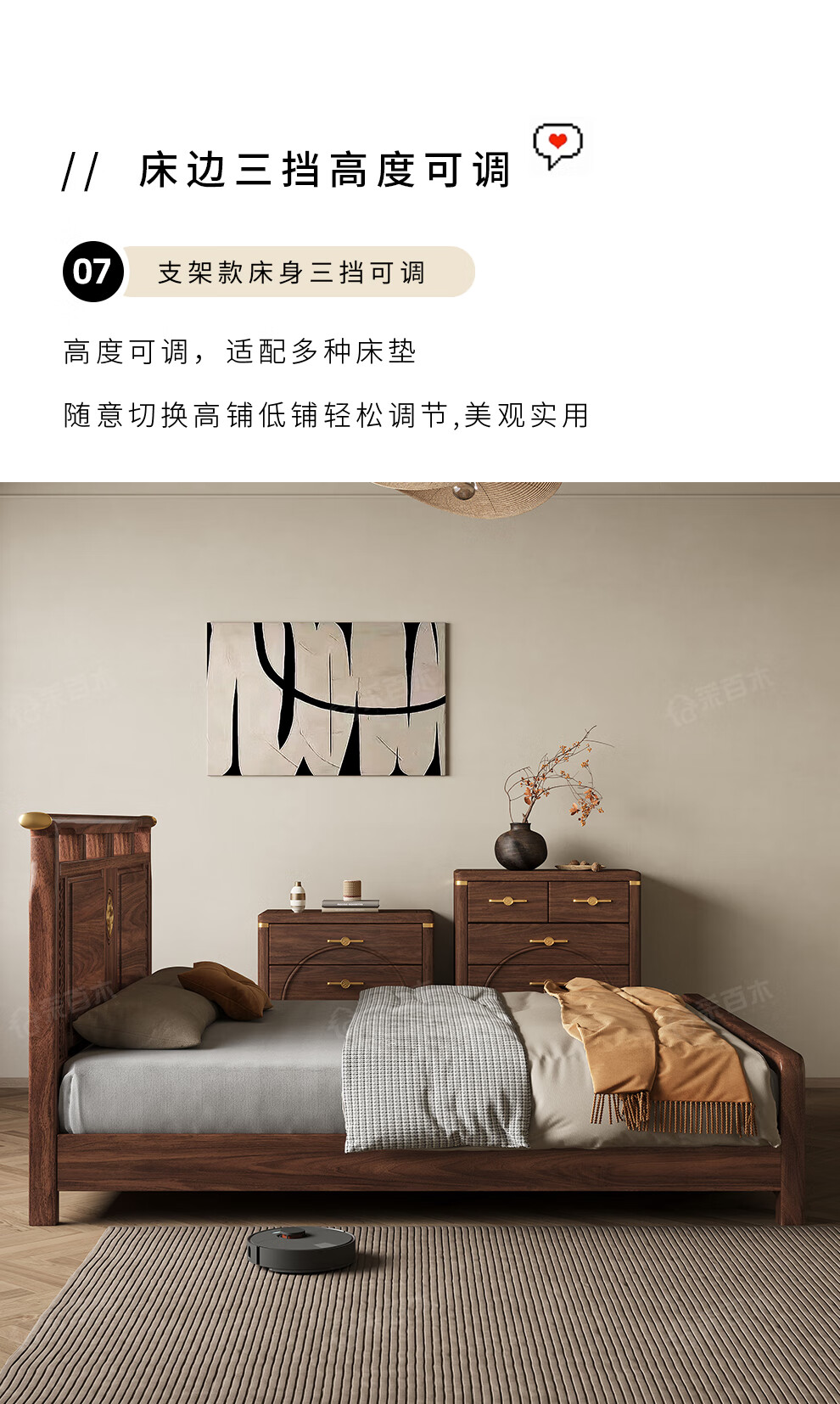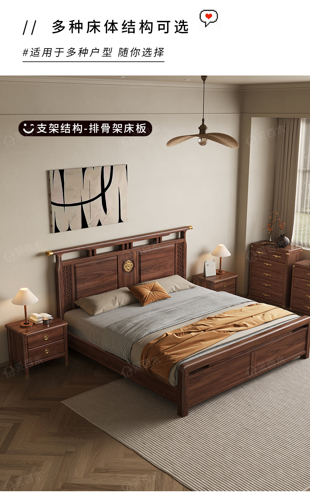 Caibaimu Bed Black Walnut New Chinese Solid Wood Bed Simple Modern Double Bed Master Bedroom Bed High-end Master Bedroom Furniture Bed Bracket Structure 1800*2000mm